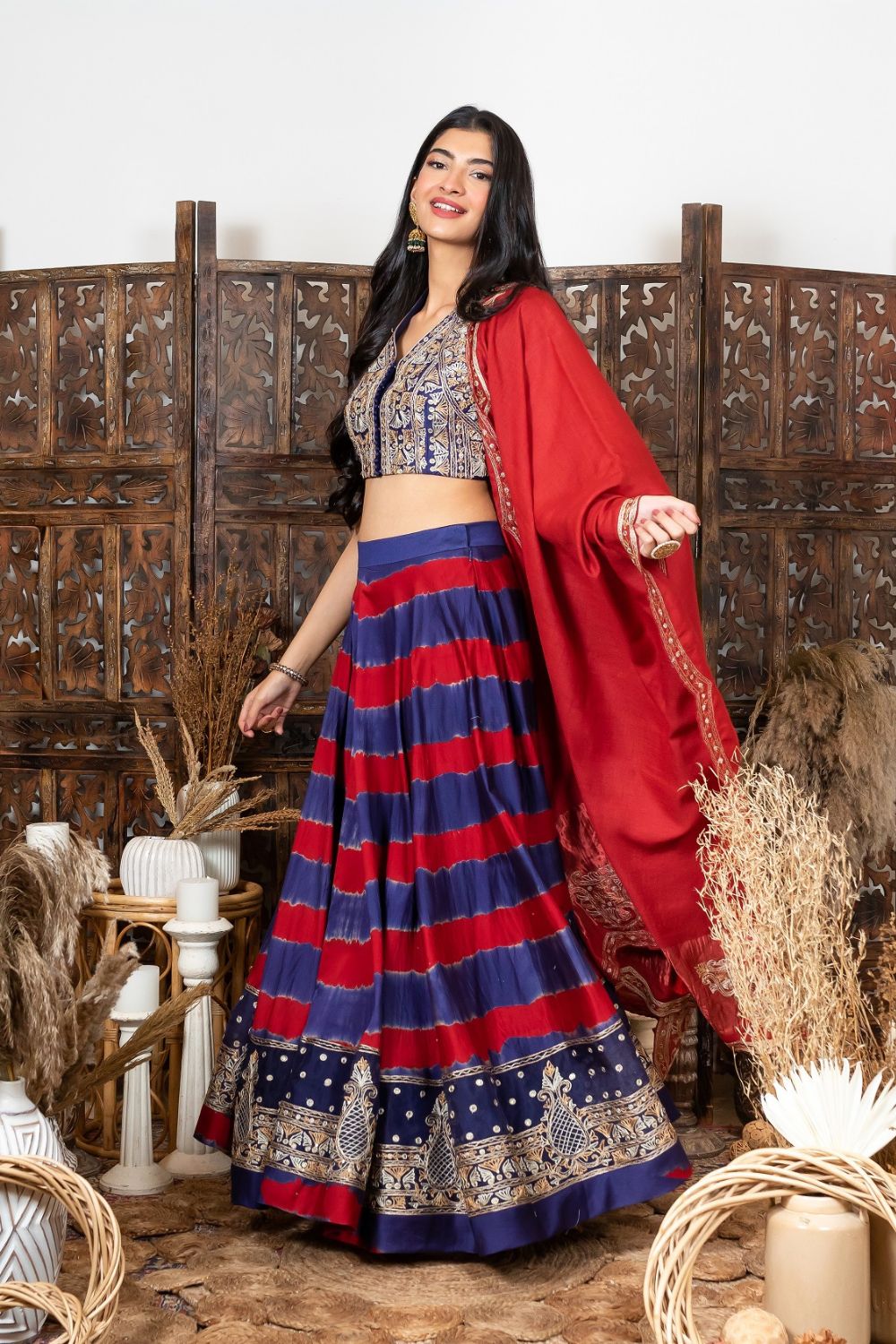 Royal Blue- Red tie dyed embroidered Lehenga in chanderi. Royal blue embroidered blouse with cap sleeves and red embroidered dupatta with tassles.
