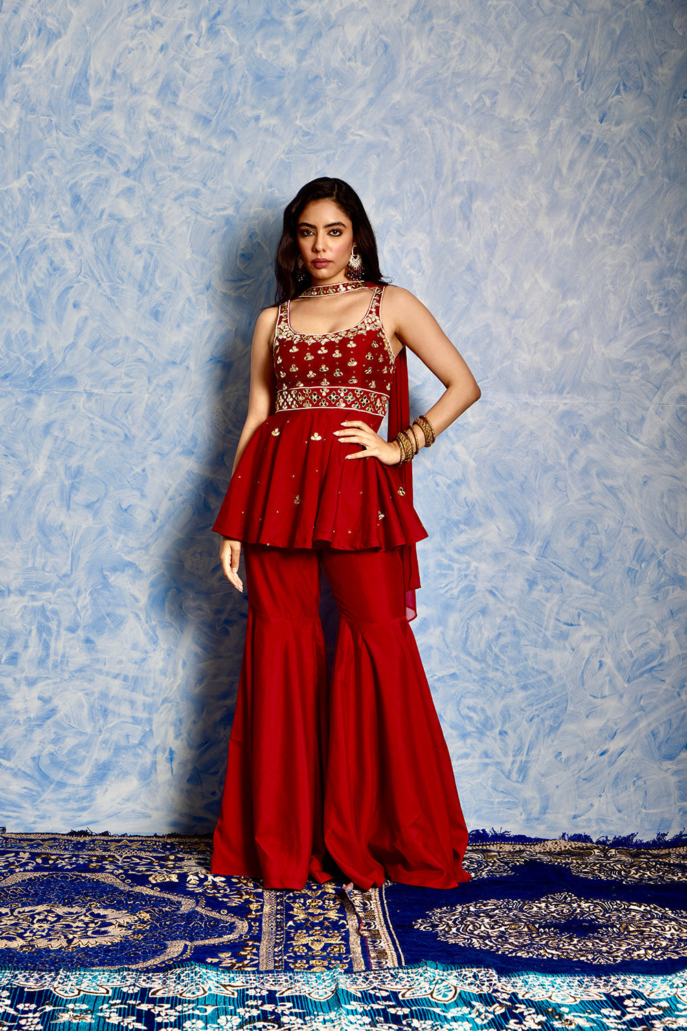 Aaisha Sharara SetMaroon Hand Embroidered Silk Peplum Kurta with Silk Sharara and Georgette Choker Dupatta
