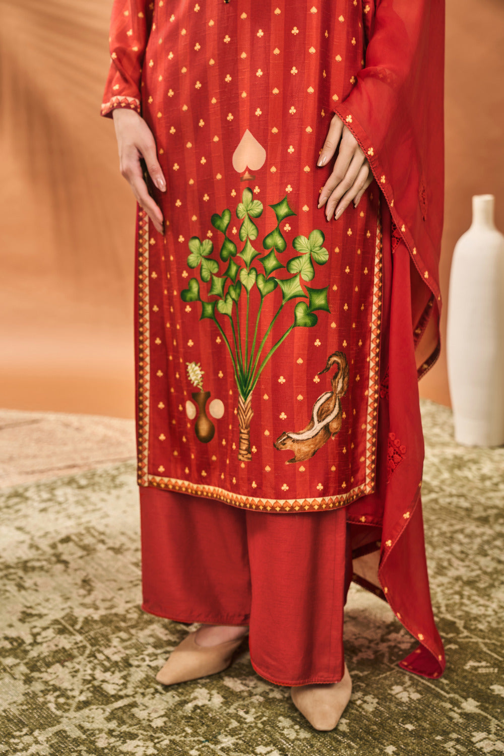 STYLING - Pair this beautiful Kurta set with a pair of statement earrings and mojris. Style it with our beautiful organza dupatta draped elegantly over one shoulder for a more elevated look. Accessories it with a potli bag.
