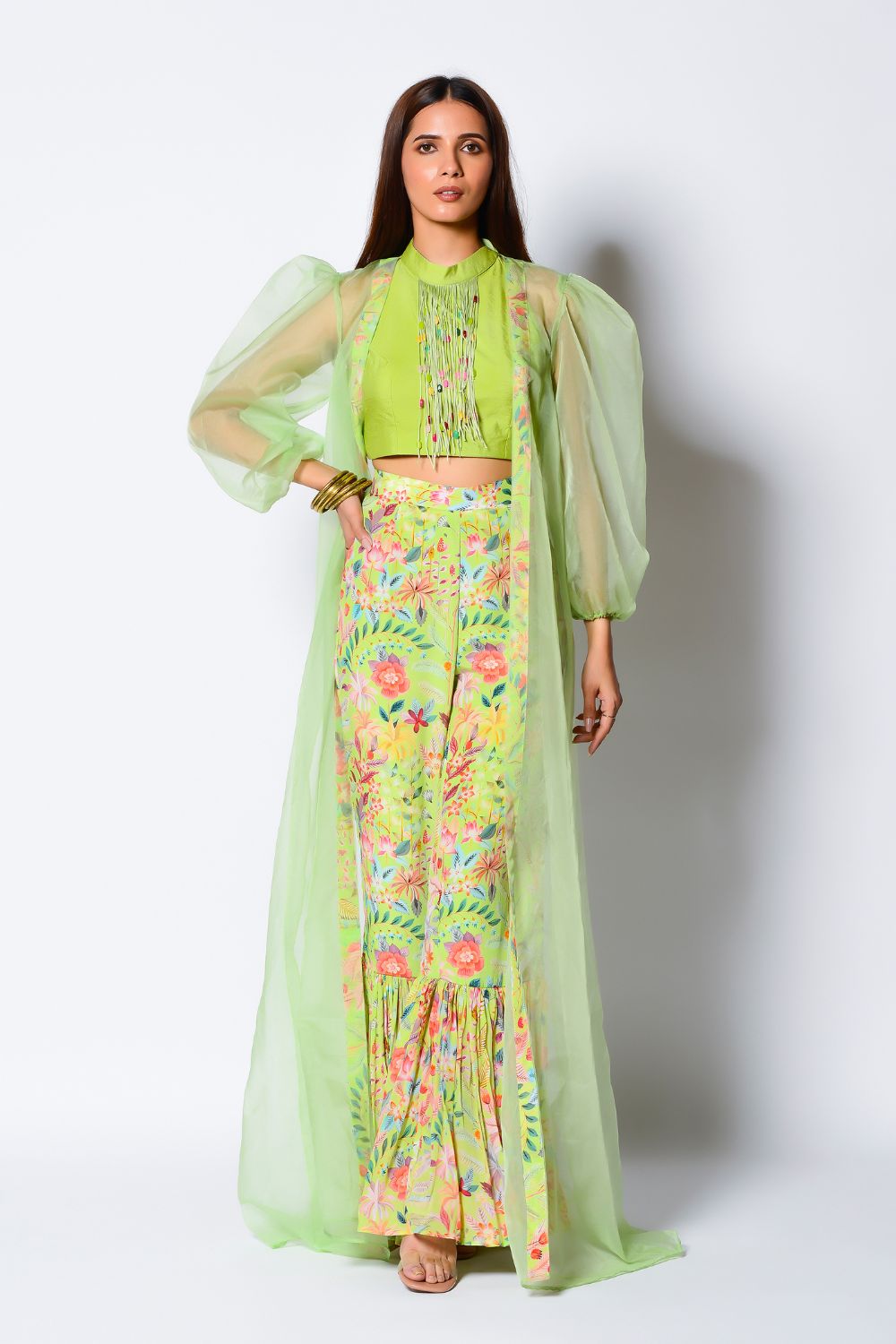 Featuring lime green, crop top with crew neck and fringes embroidered along beads , gem and crystals paired with organza cape and signature printed pants with gather details