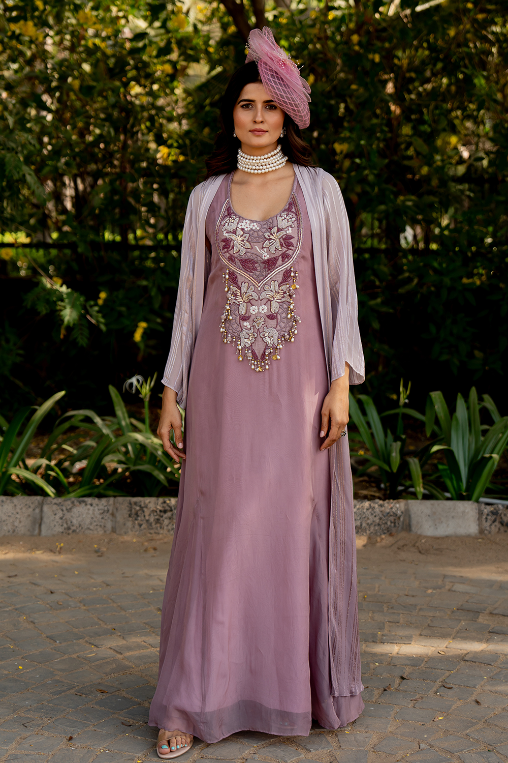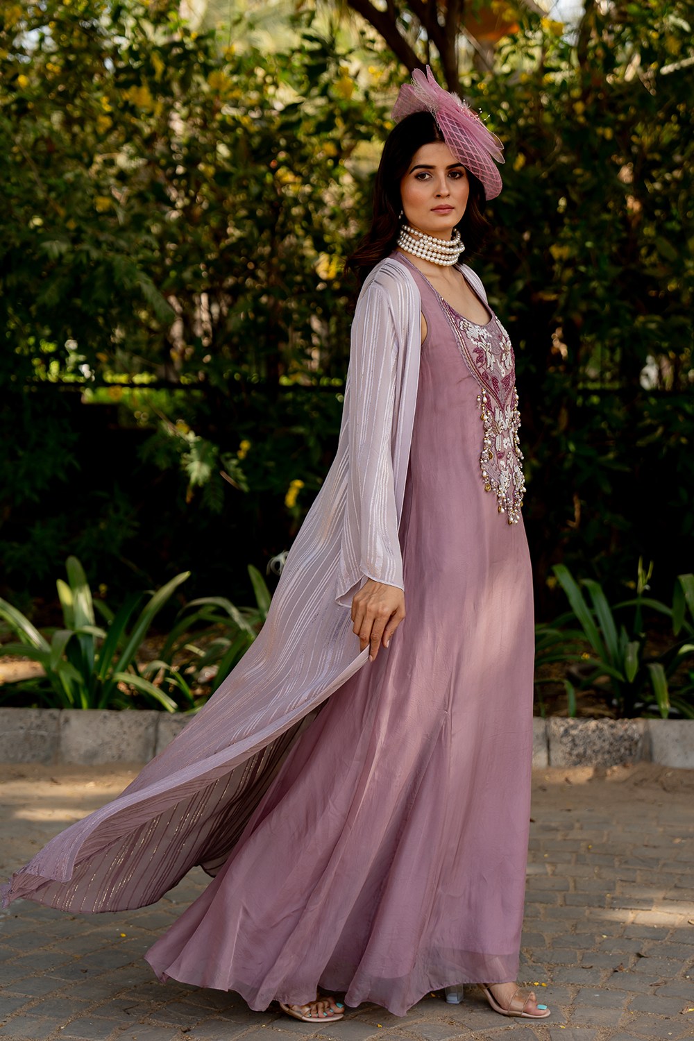 Long Dress ombre cape is worn with an organza maxi dress with embroidery and tassels and an inner