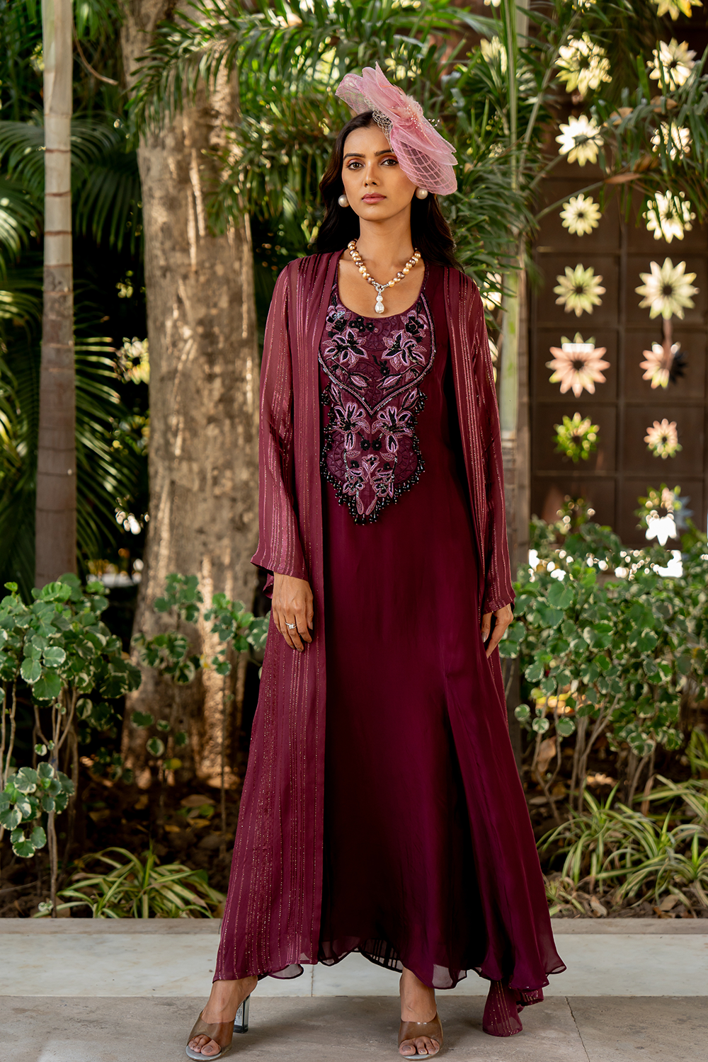 Dress Cape Inner ombre cape is worn with an organza maxi dress with embroidery and tassels and an inner