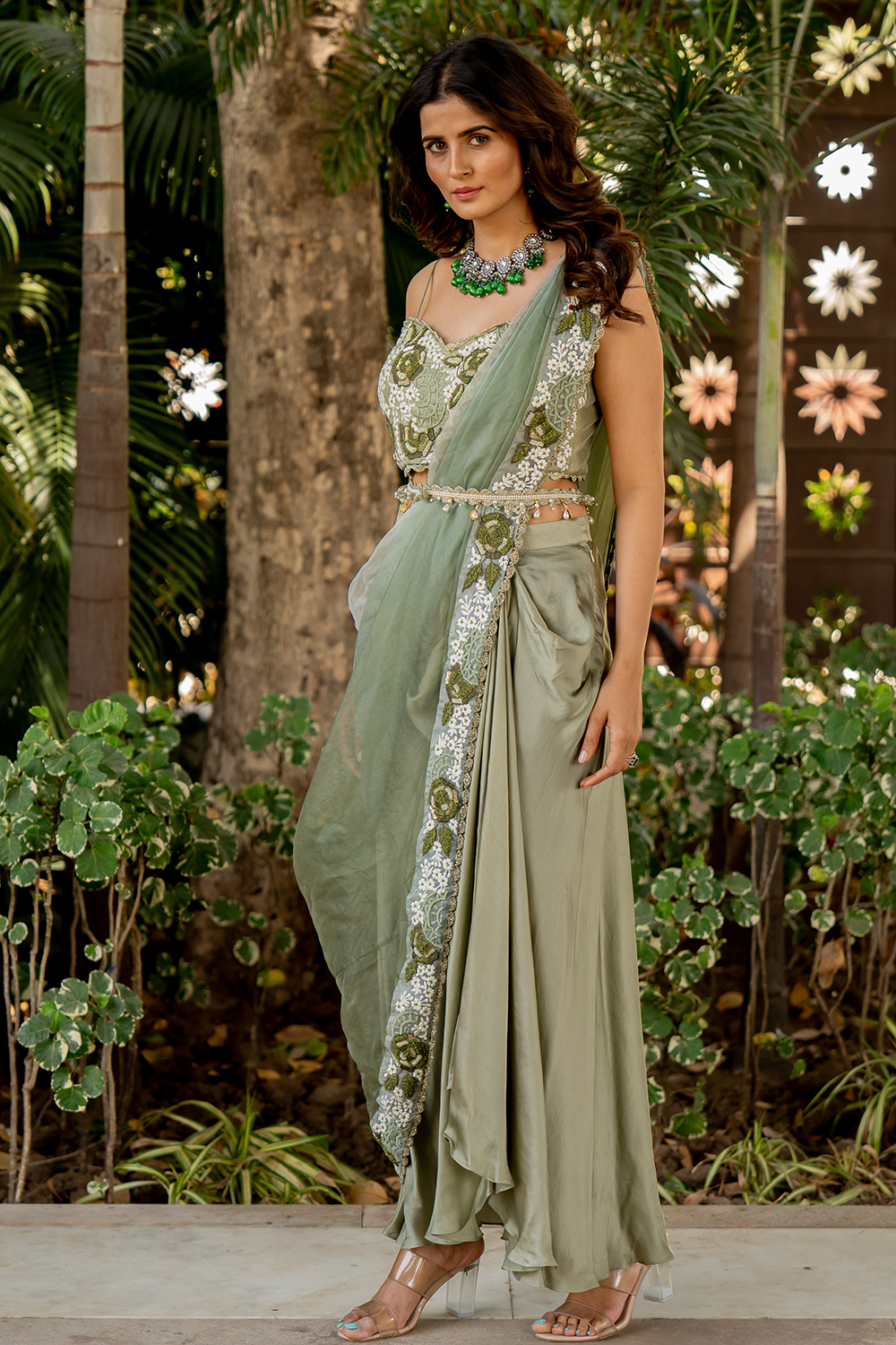 Pick up skirt Crepe skirt with an embroidered border drape, a belt, and a heavy embroidered blouse to finish the ensemble