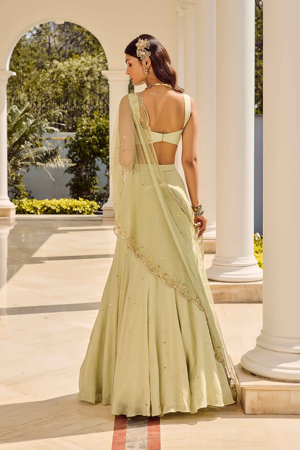 A graceful drape saree featuring a sheer embroidered pallu. Paired with a chic sleeveless blouse