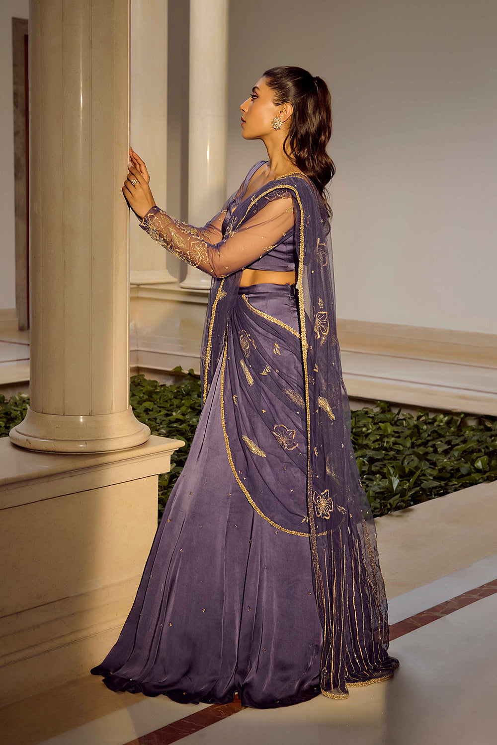 An organza saree embellished with dreamy motifs paired with an embroidered full sleeves blouse