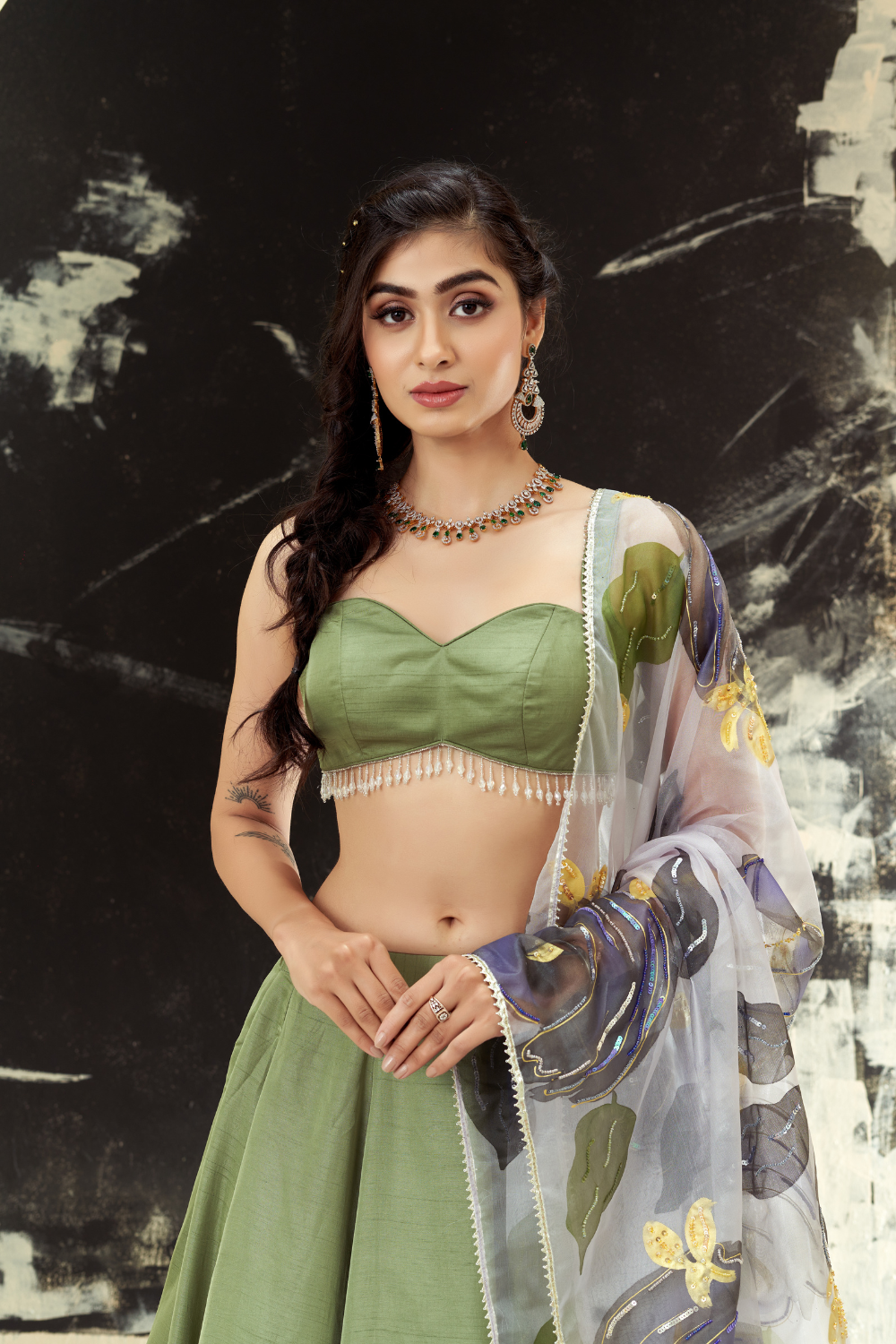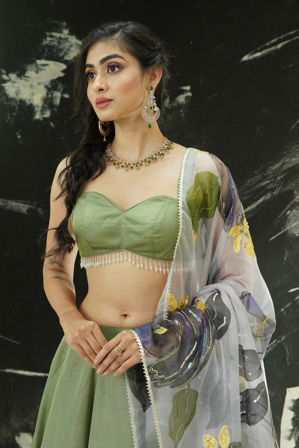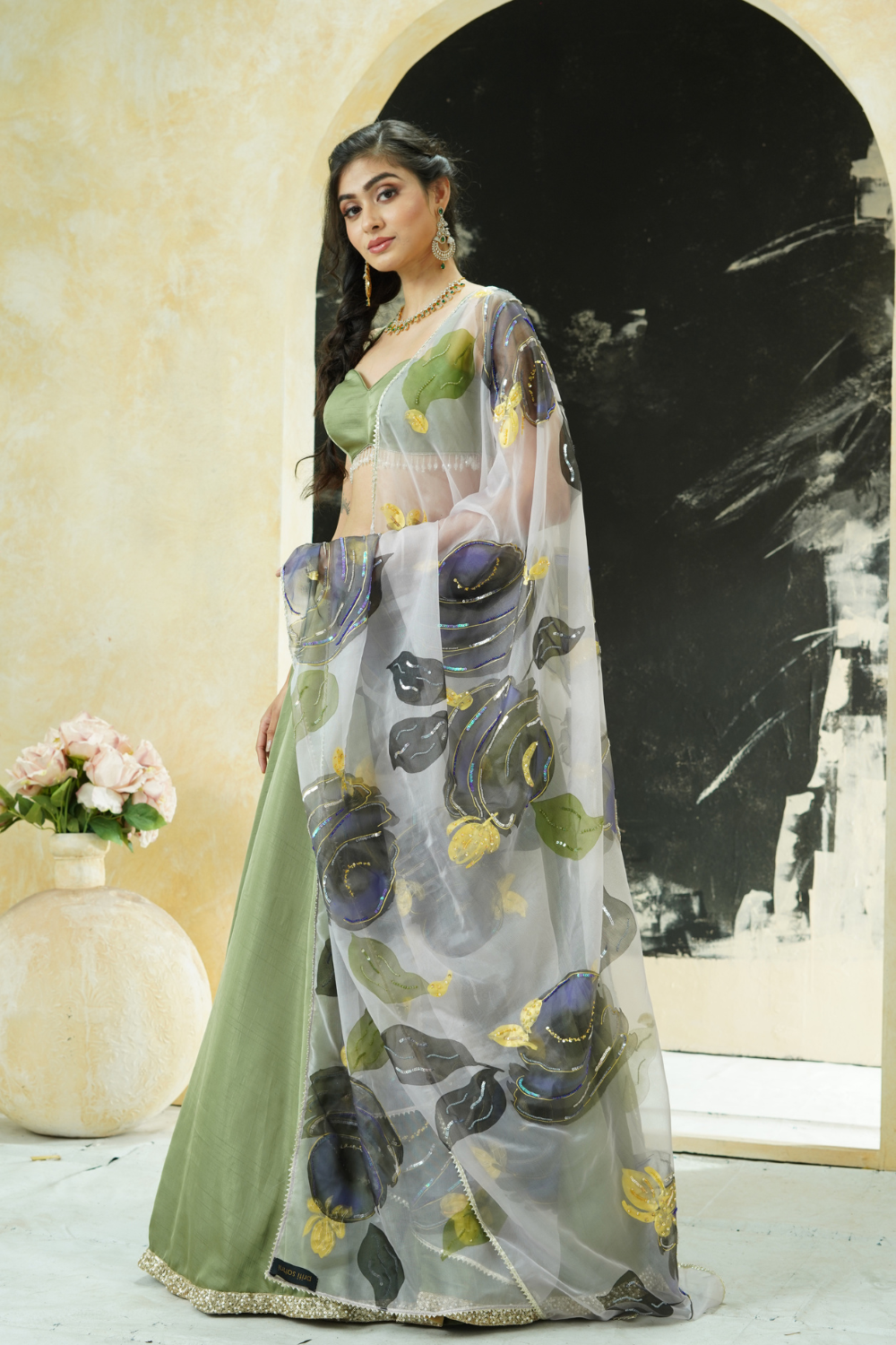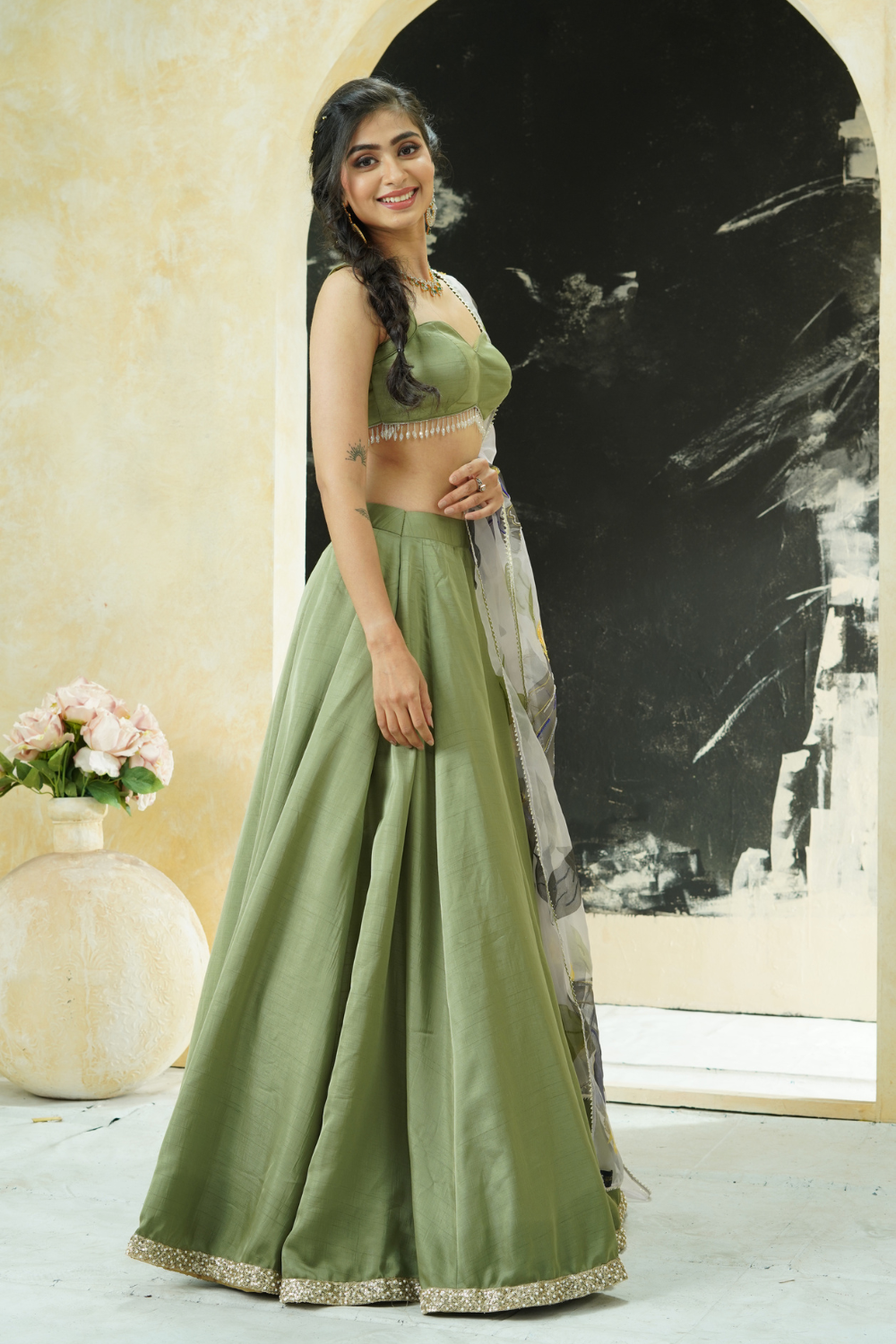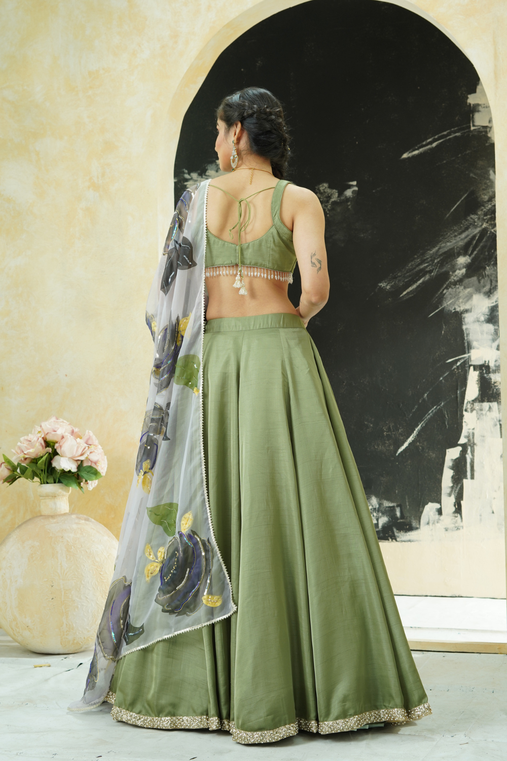 Sage Green lehenga set with hand painted dupatta