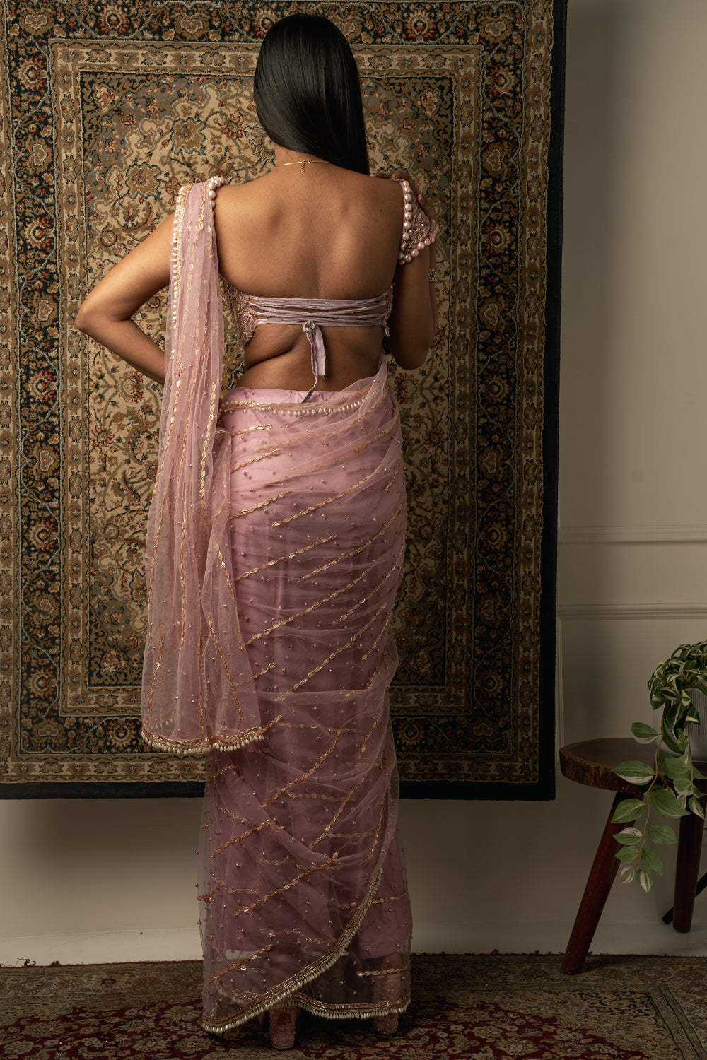 this dusty pink saree is a vision of elegance, crafted from net fabric that glimmers with every movement. paired with a net blouse, the ensemble radiates sophistication and charm. the intricately hand-embroidered blouse adds a touch of glamour, making it perfect for a cocktail or reception, whether for the bride or her bridesmaids. with its timeless allure and delicate detailing, this saree is sure to captivate attention and leave a lasting impression on any special occasion.