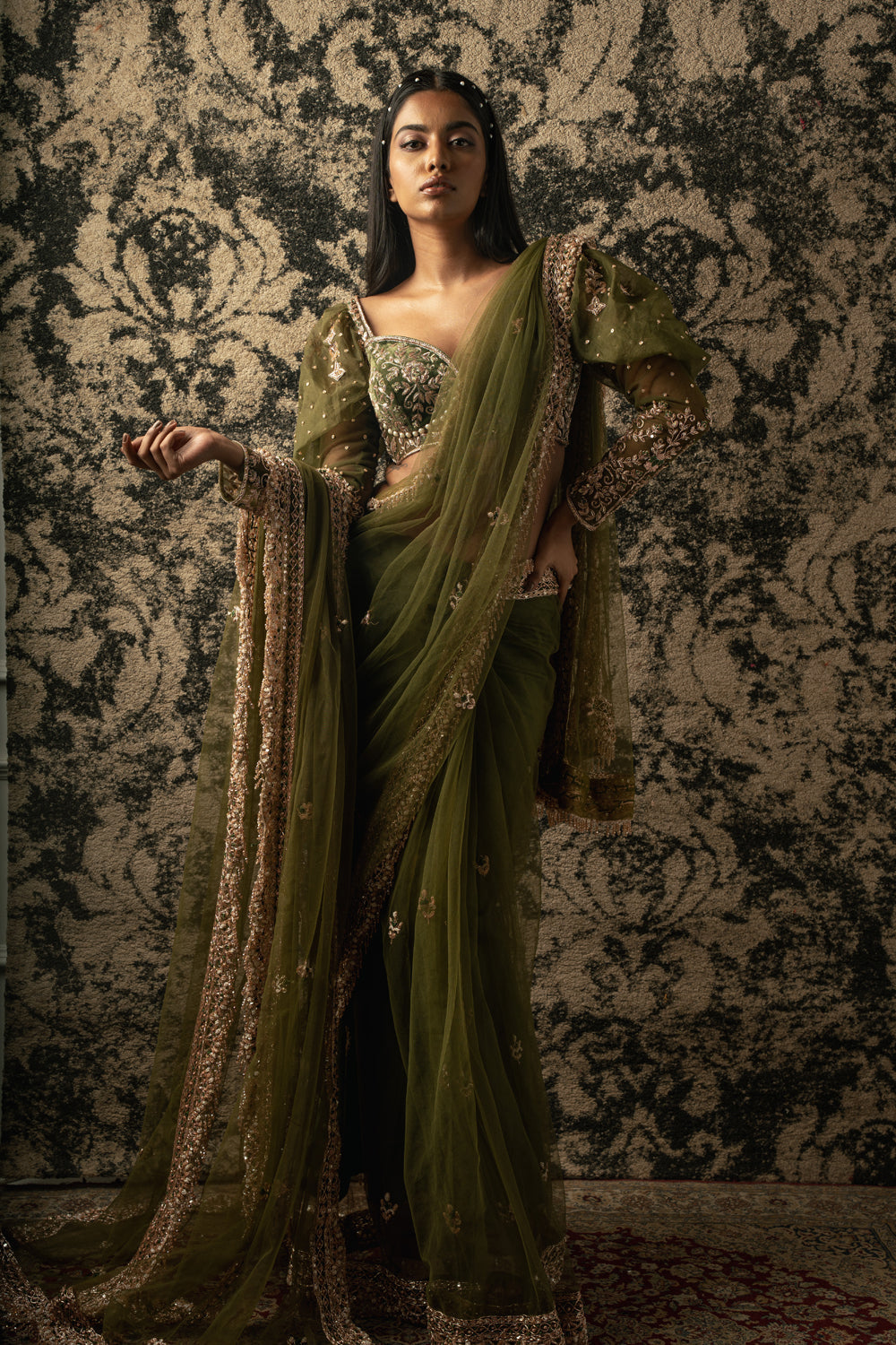 This olive green saree, delicately crafted from net, exudes an aura of regal charm. paired with a velvet and organza blouse, adorned with opulent gold zardozi embroidery, it embodies luxury and sophistication. the intricate detailing and rich color palette elevate its royal appeal, making it a timeless choice for any grand occasion or formal affair.