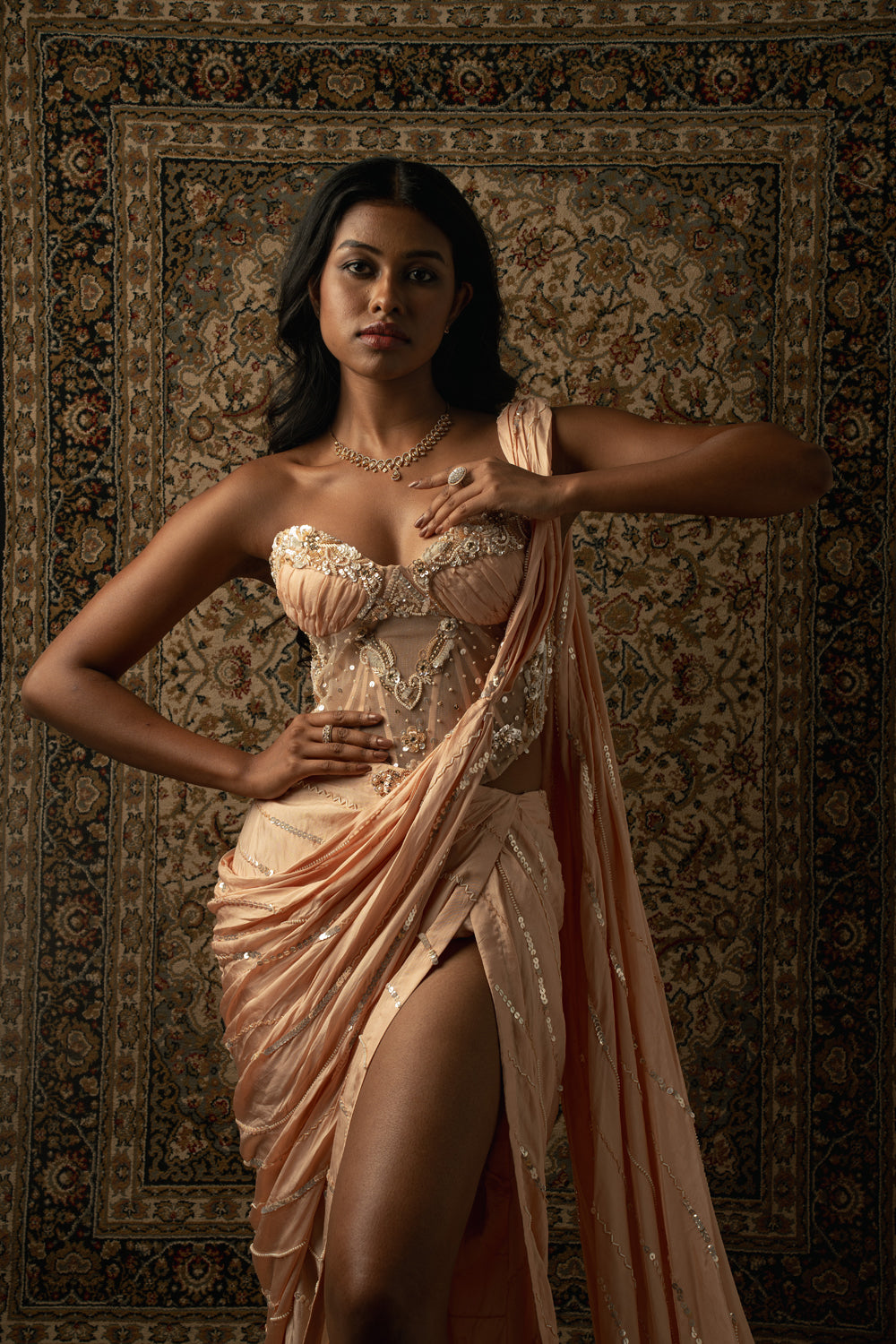 this baby peach pre-draped saree is a vision of elegance, crafted from linen satin fabric that glimmers with every movement. paired with a net blouse, the ensemble radiates sophistication and charm. the intricately hand-embroidered blouse adds a touch of glamour, making it perfect for a cocktail or reception, whether for the bride or her bridesmaids. with its timeless allure and delicate detailing, this saree is sure to captivate attention and leave a lasting impression on any special occasion.