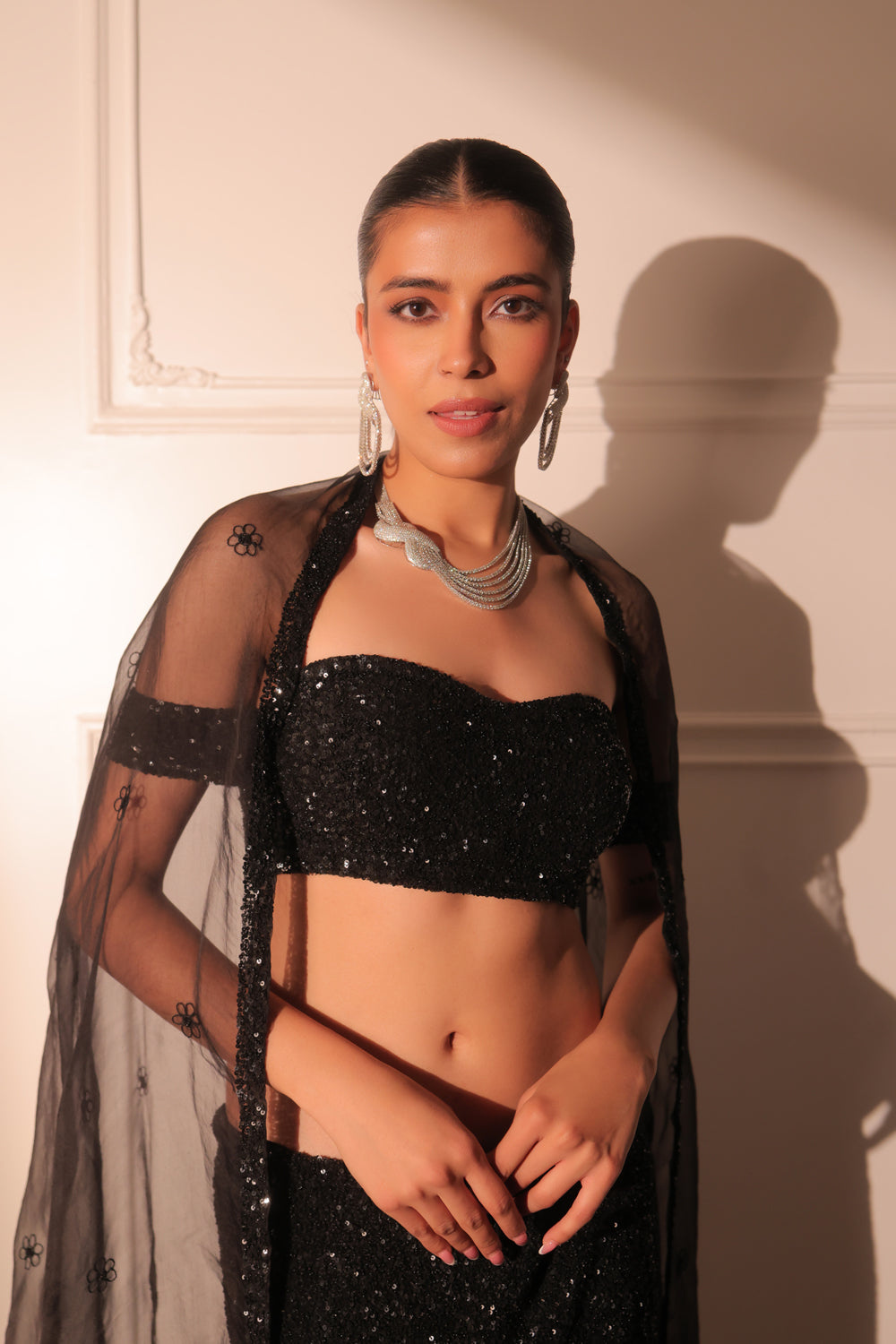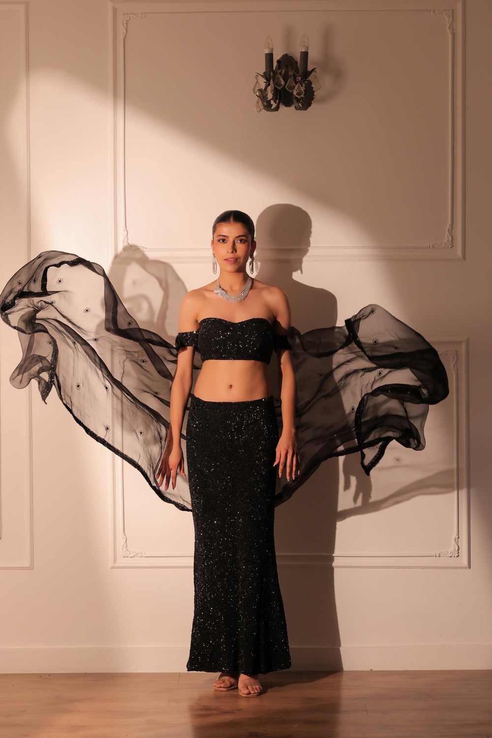 Black Cocktail Bustier And Slit Skirt With Dupatta