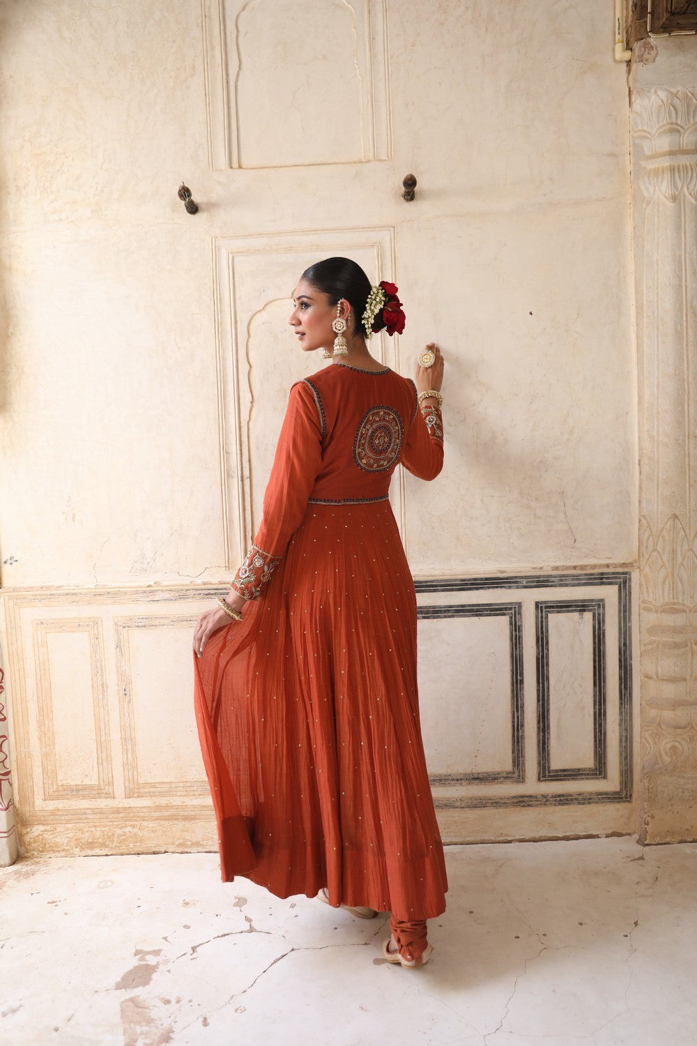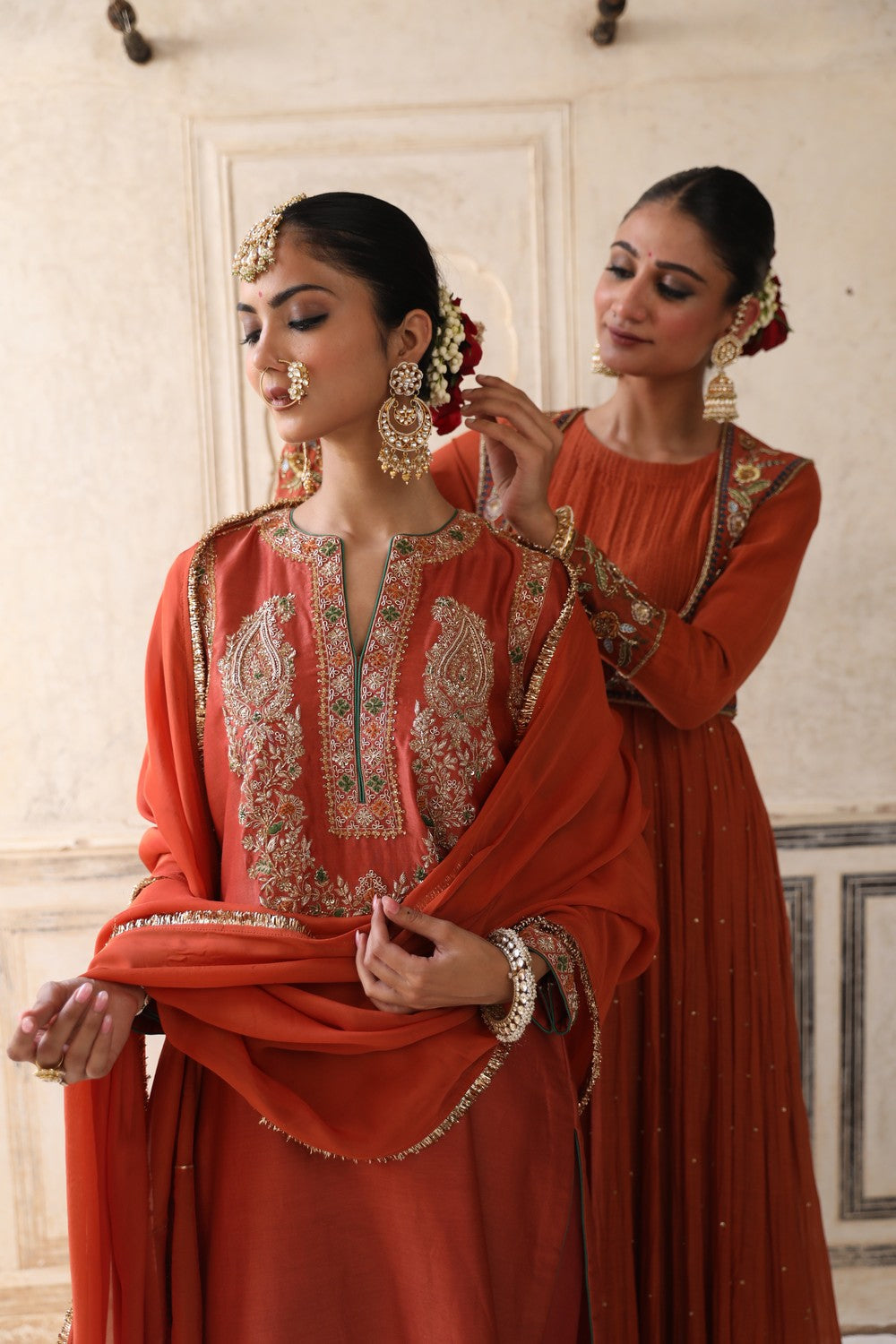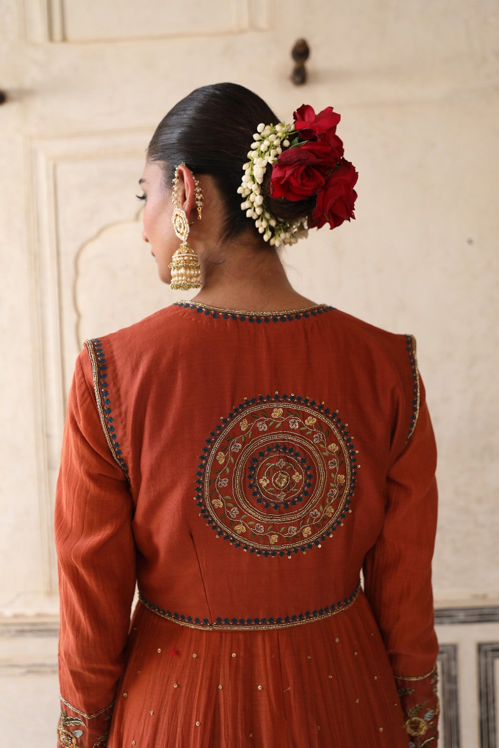Indulge in elegance with our Serene Anarkali Set, beautifully crafted in luxurious silk and lined with soft 100% cotton. The rich brick rust color, combined with intricate thread aari hand embroidery, gives this set a timeless and sophisticated appeal. The 3-piece stitched ensemble includes a flowing 54-inch Anarkali, a stylish 15-inch jacket, and a 2.5-meter dupatta, making it perfect for weddings and festive occasions.