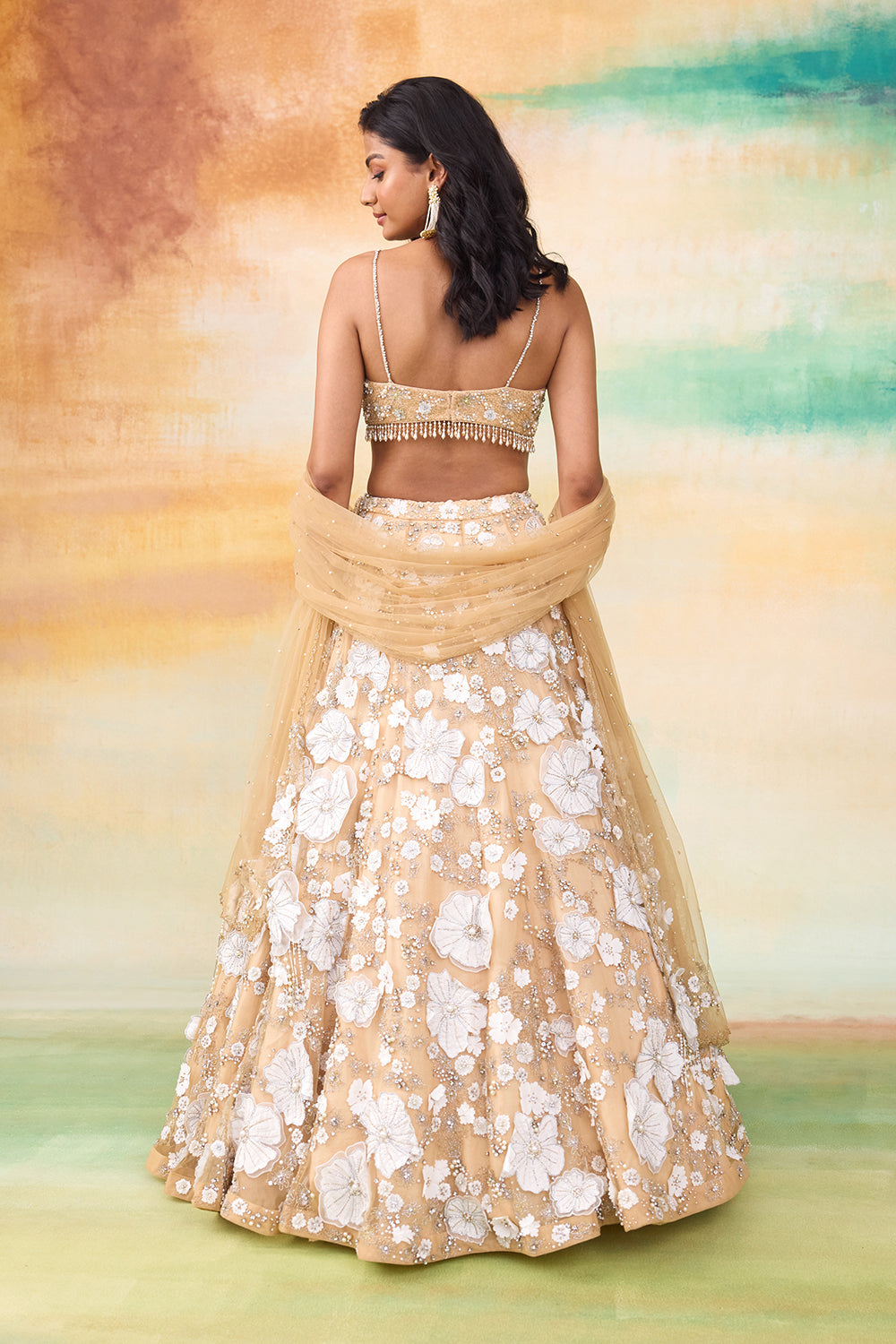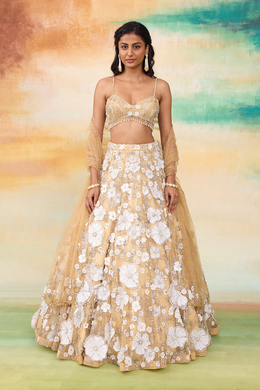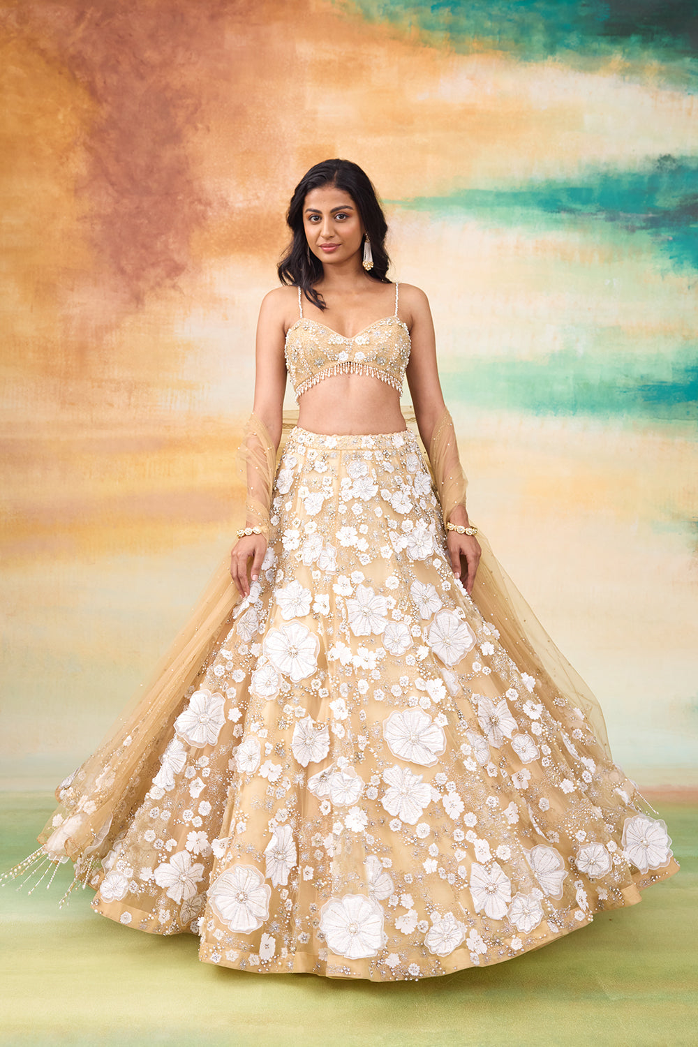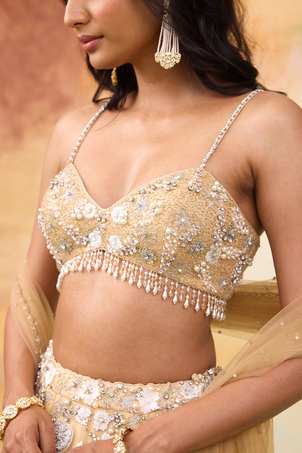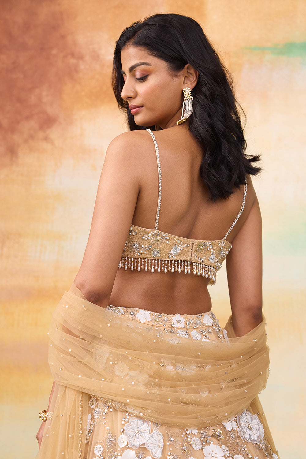 Our golden haze soft net lehenga captivates with its opulent charm, designed to dazzle at every step. The ensemble features a sleek, highly embellished blouse , brought to life with intricate micro and oversized floral patterns. The lehenga shimmers with cascading pearls, sparkles with crystal stones, and flows effortlessly with tone on tone tassels that add touch of grace. Completing the look, the embellished dupatta drapes elegantly , enhancing the allure of this timeless creation