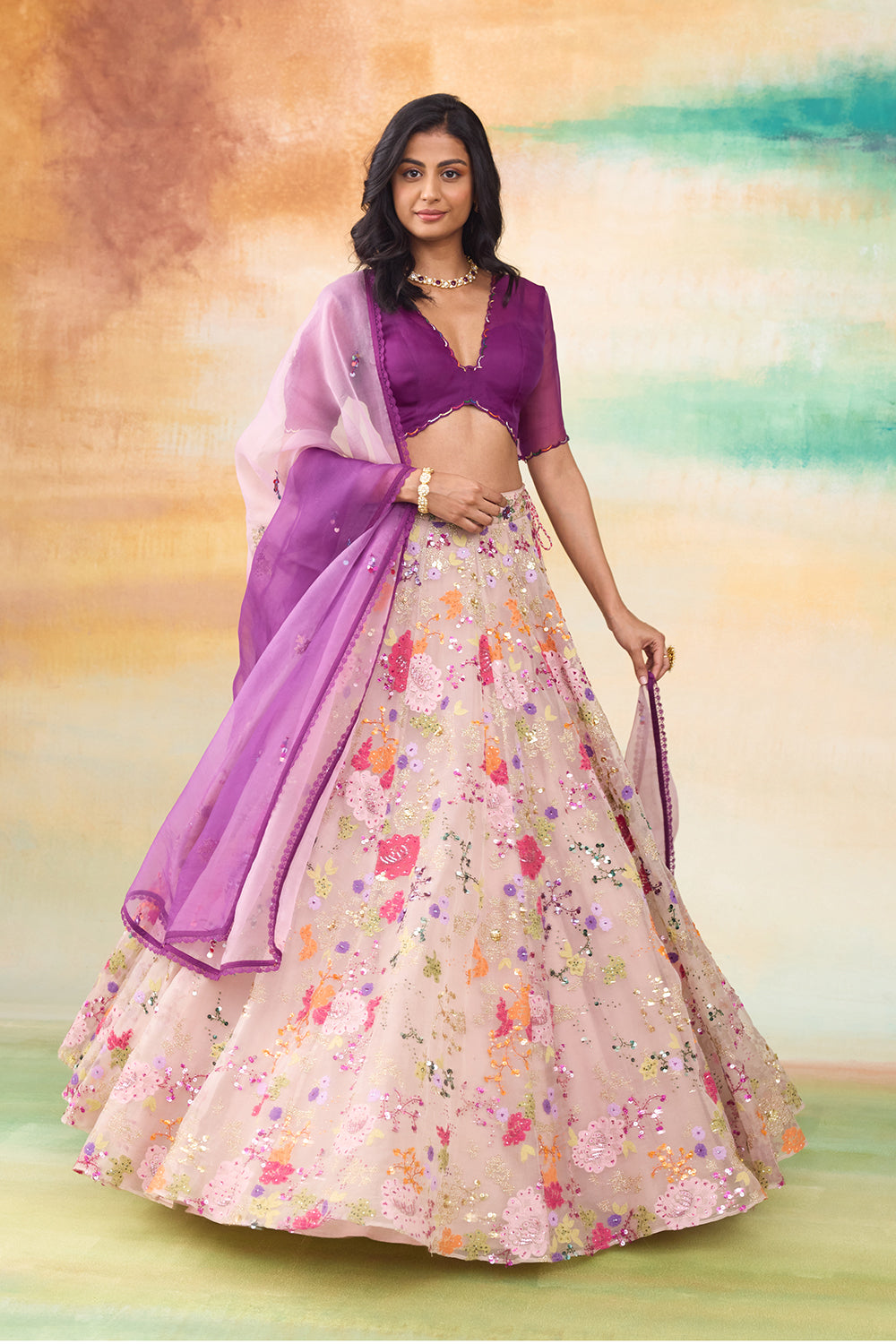 Our vibrant Rangeen lehenga ensemble is a stunning set features a lilac lehenga adorned with intricate colorful lace flower appliques, shimmering sequin details, and elegant zari flower embroidery. Complementing the lehenga is a purple organza blouse, perfectly paired with a dreamy obre organza dupatta that transitions gracefully in hues.