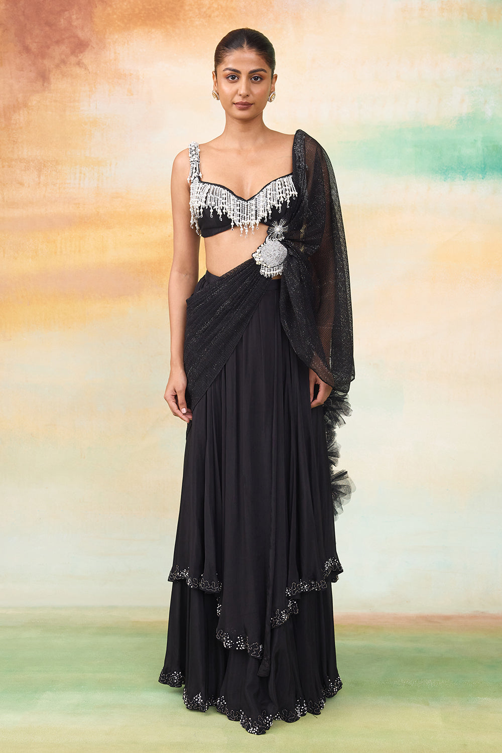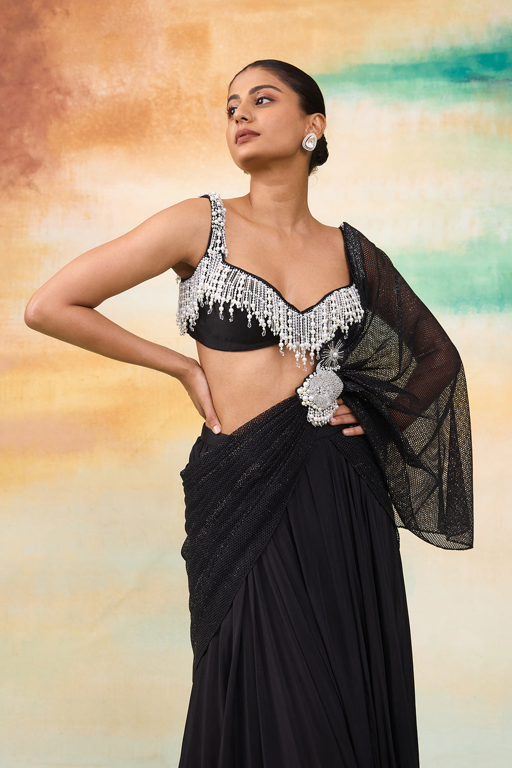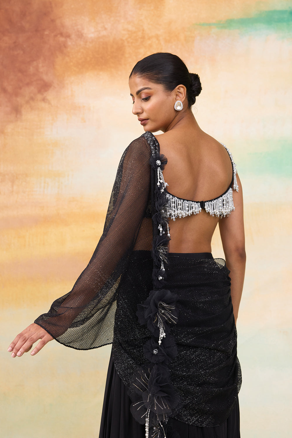 The carlotte saree draped in exquisite noir in delicate chinnon and chanderi with shimmering details of hand embroidered pearls, crystals and cutdana that weaves a story of opulence and grace.Floral motifs and delicate pearl embroidered petals, embellished braiding technique, enhanced by intricate cutwork creates an echanting look, adorned with shining droplets that add a touch of luminous elegance.