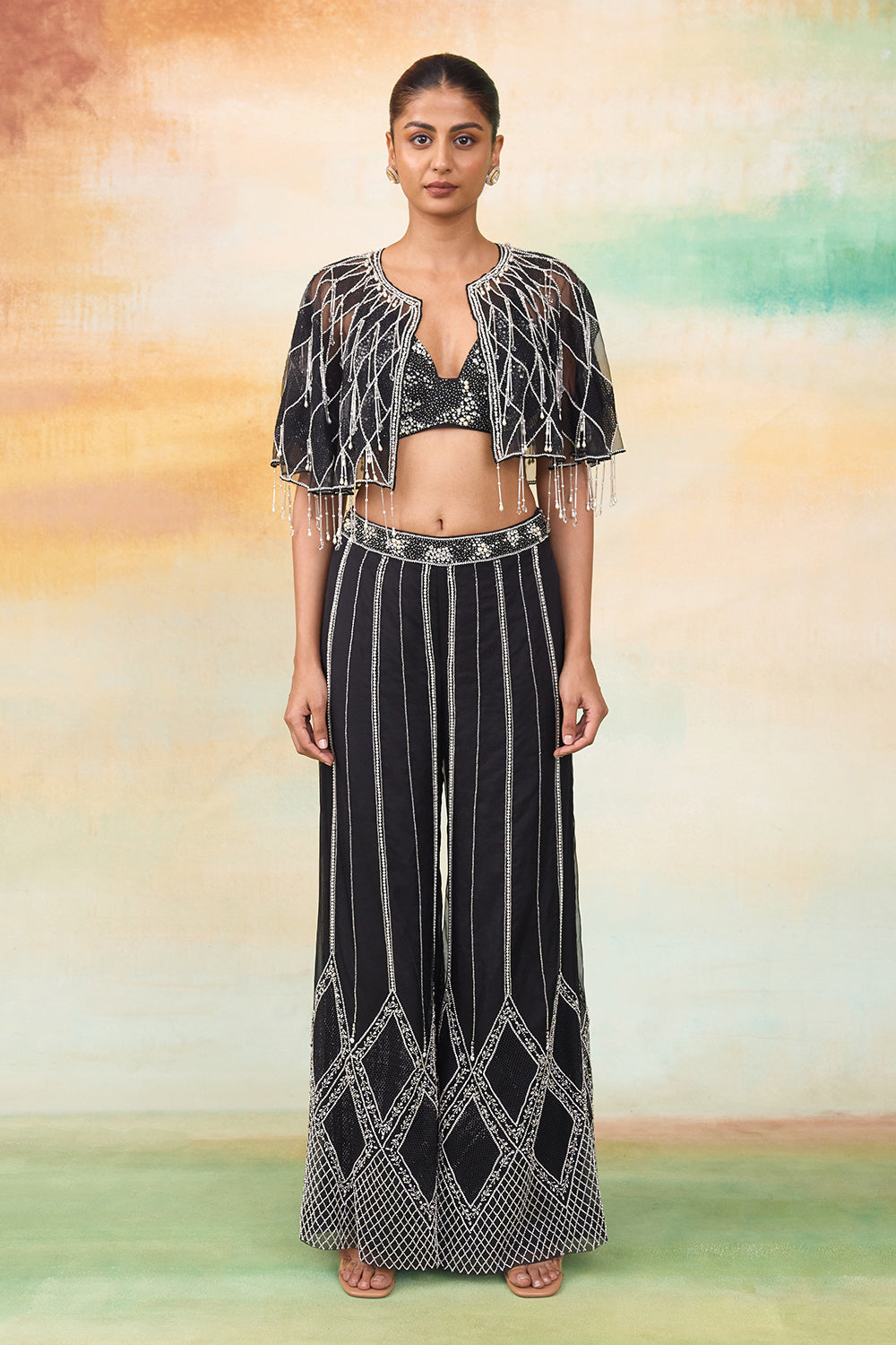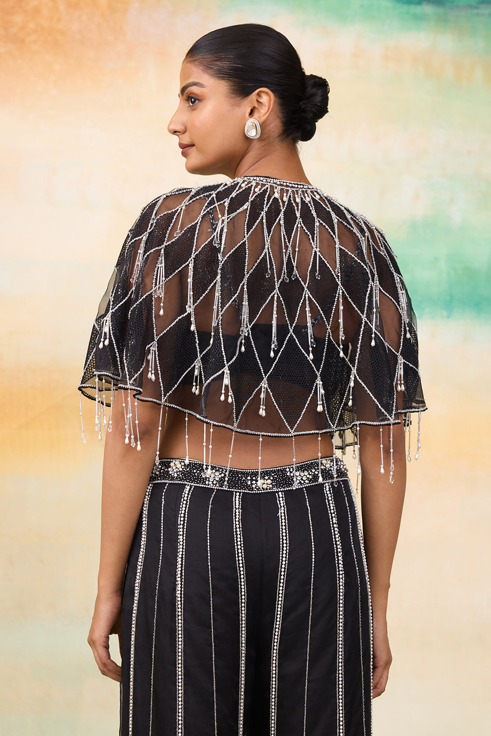 Our Ariel cape and pant set is a perfect modern ensemble in organza with shimmering details of hand embroidered pearls, crystals and cutdana that weaves a story of opulence & grace. The pants showcase an intricate crisscross embroidery pattern crafted with cutdana. The cape features diamond shaped jaali net patchwork, complemented by pipe tassels that add a dynamic touch. The top has chitta work of pearls and stones, enhancing its luxurious appeal.