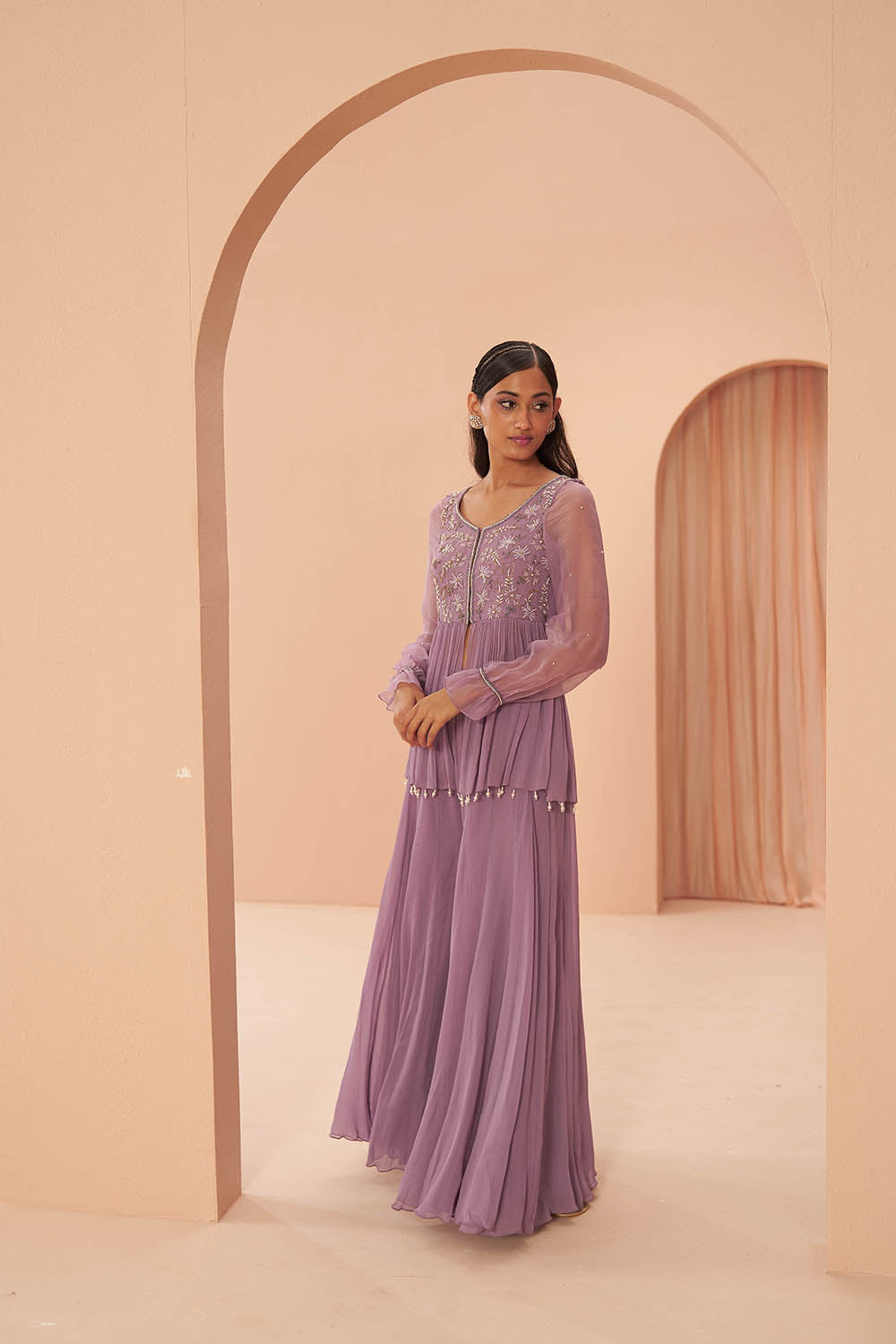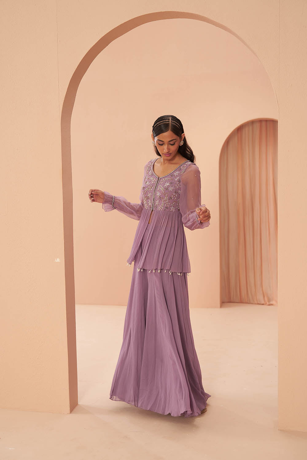 A beautiful peplum sharara set with delicate floral embroidery on torso