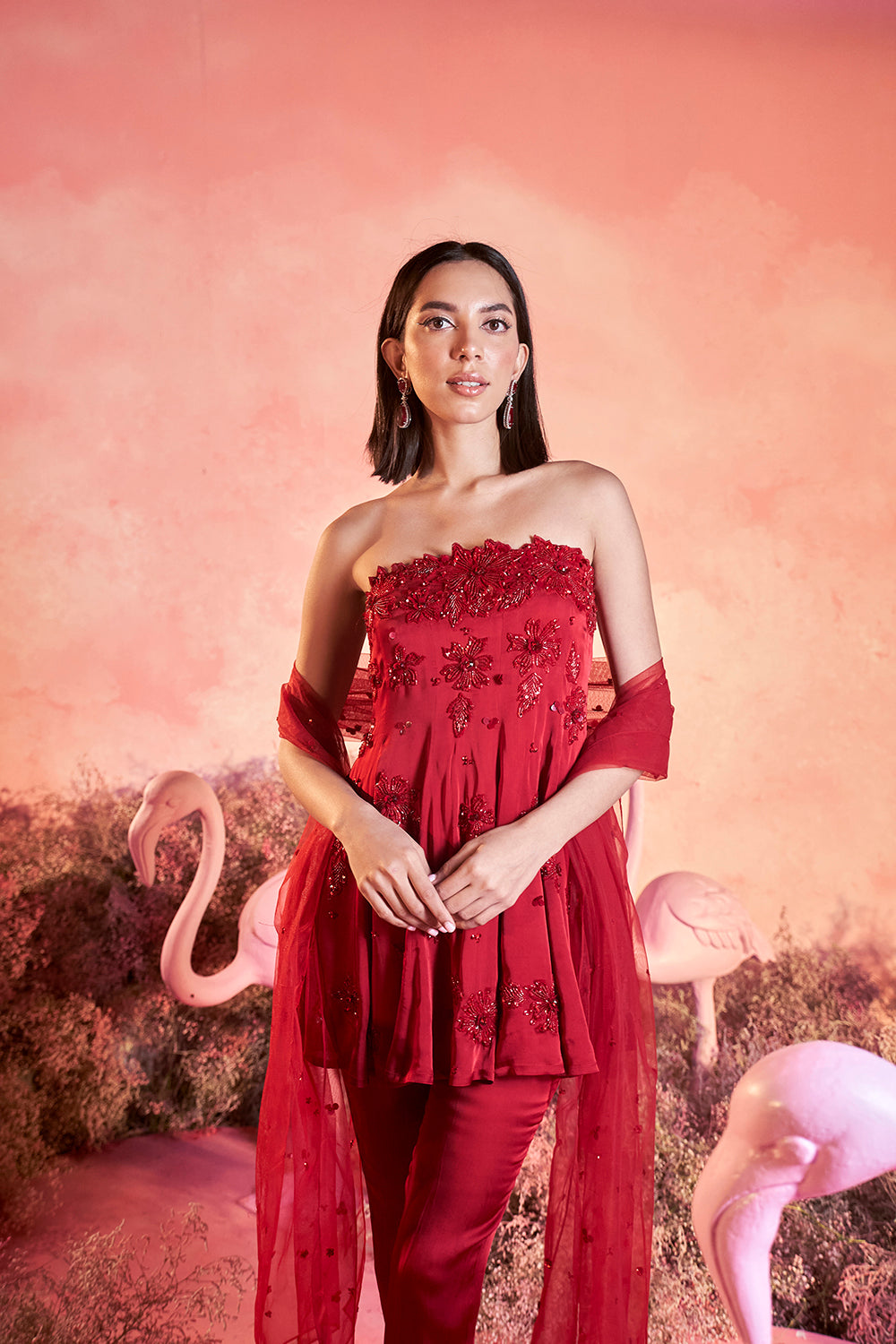An off shoulder short suit set, featuring cut work on neckline , paired with narrow pants and dupatta.