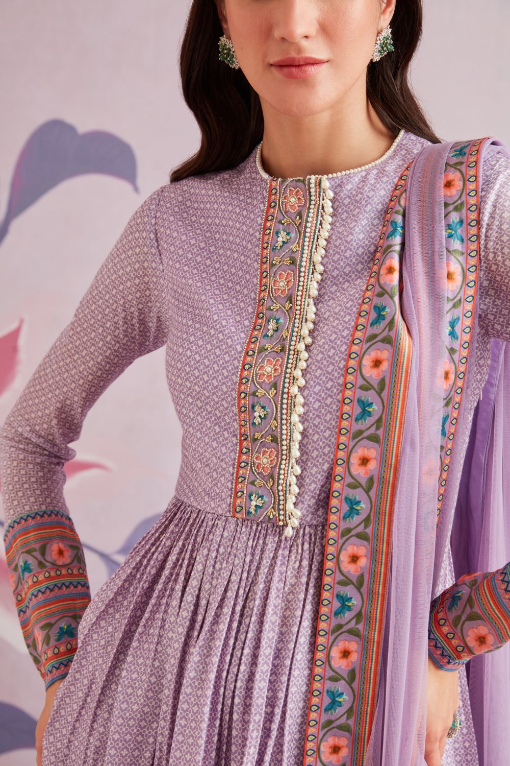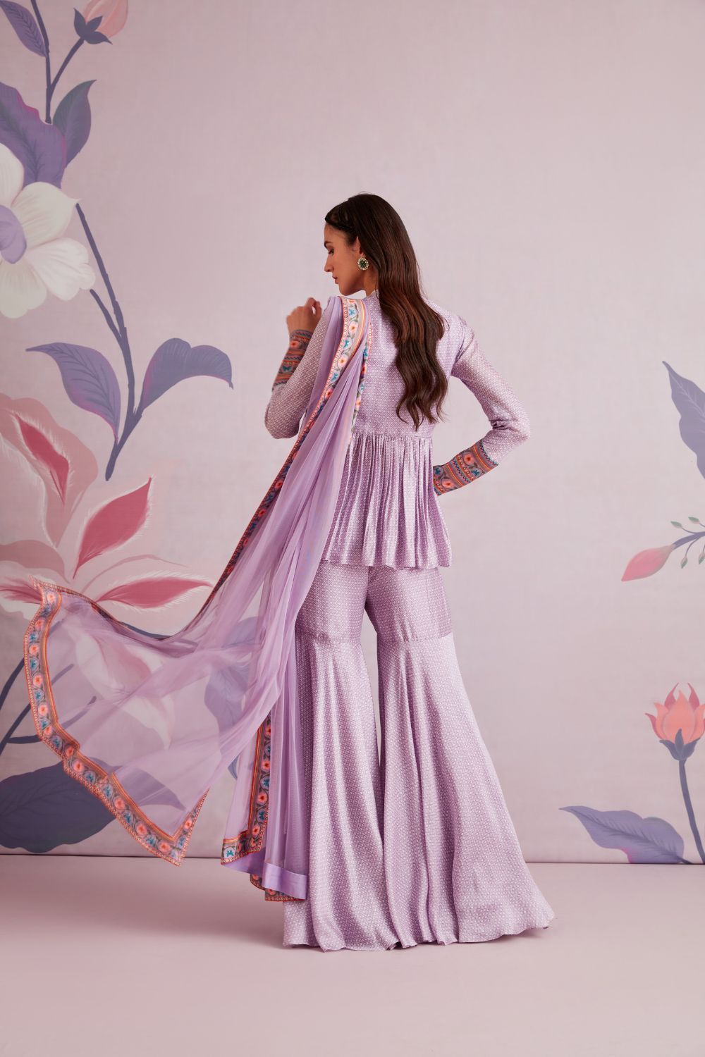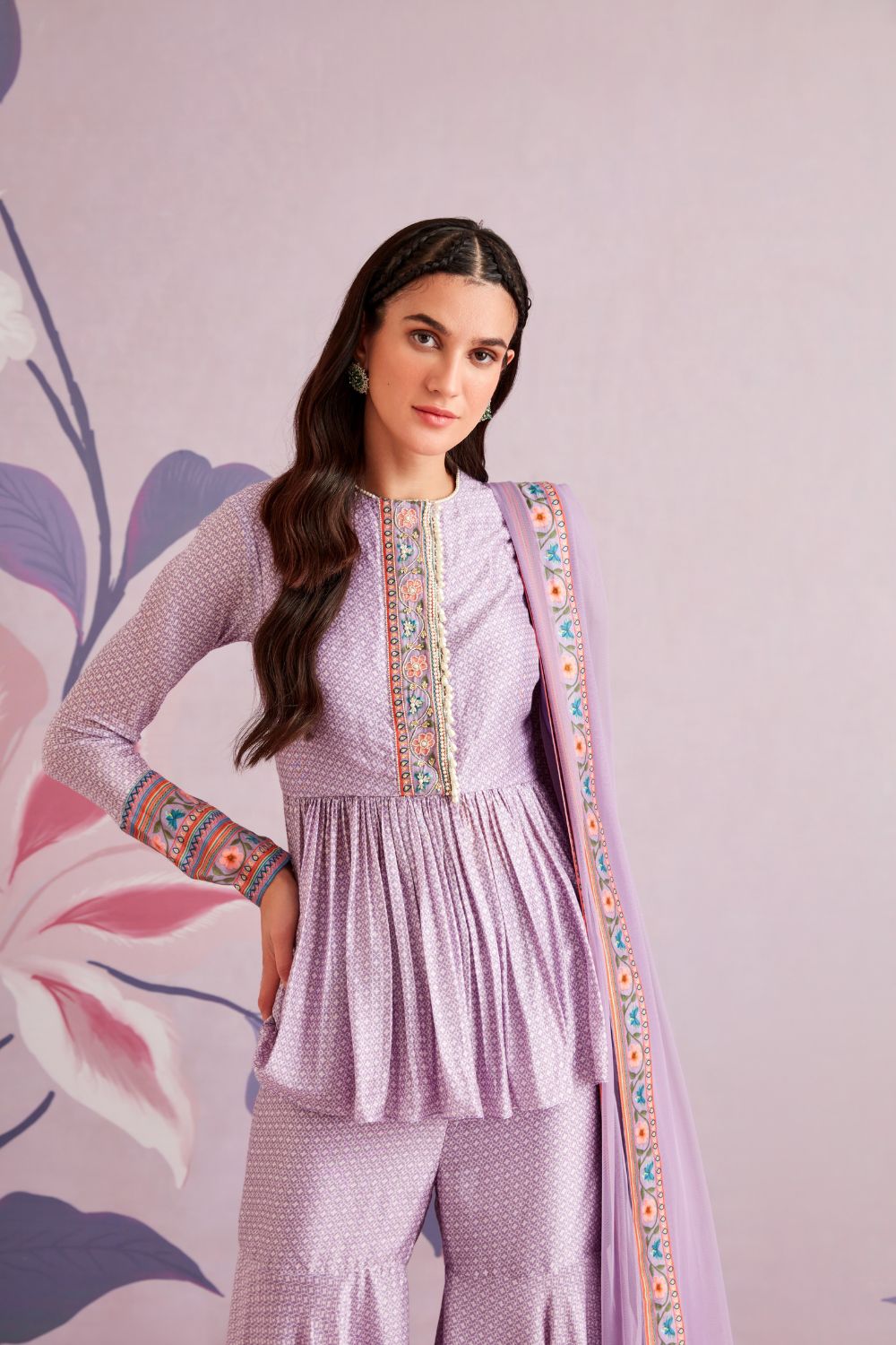 Blue printed silk peplum with embellished neckline paired with printed chiffon garara and net dupatta.