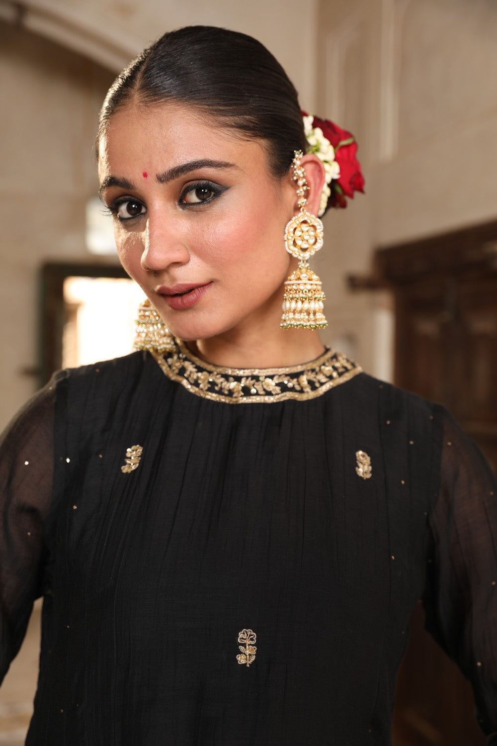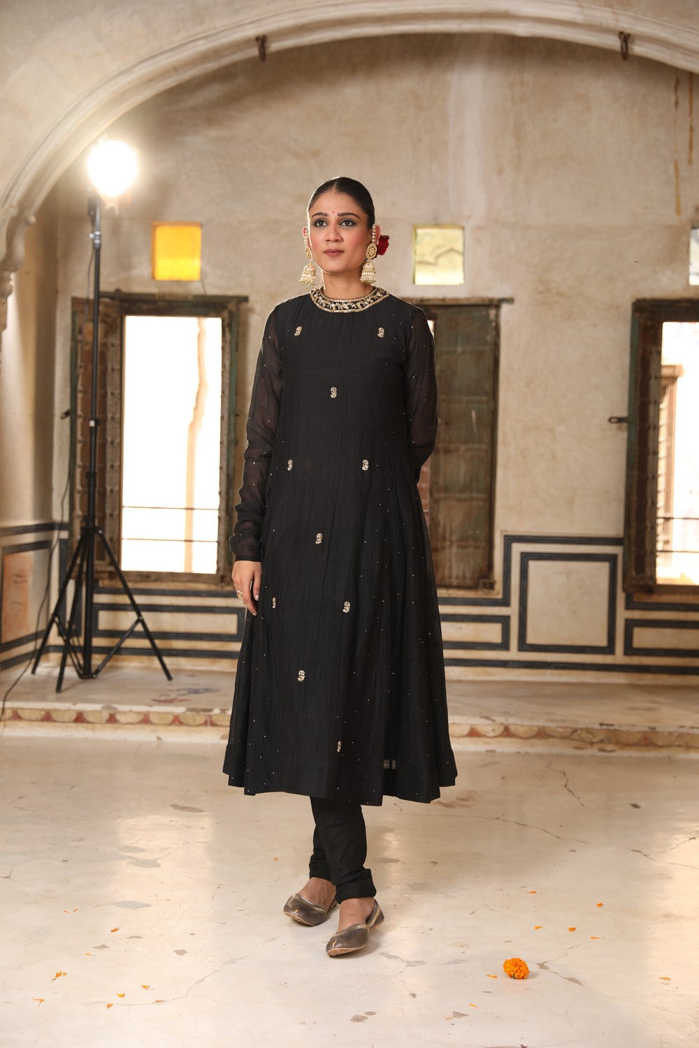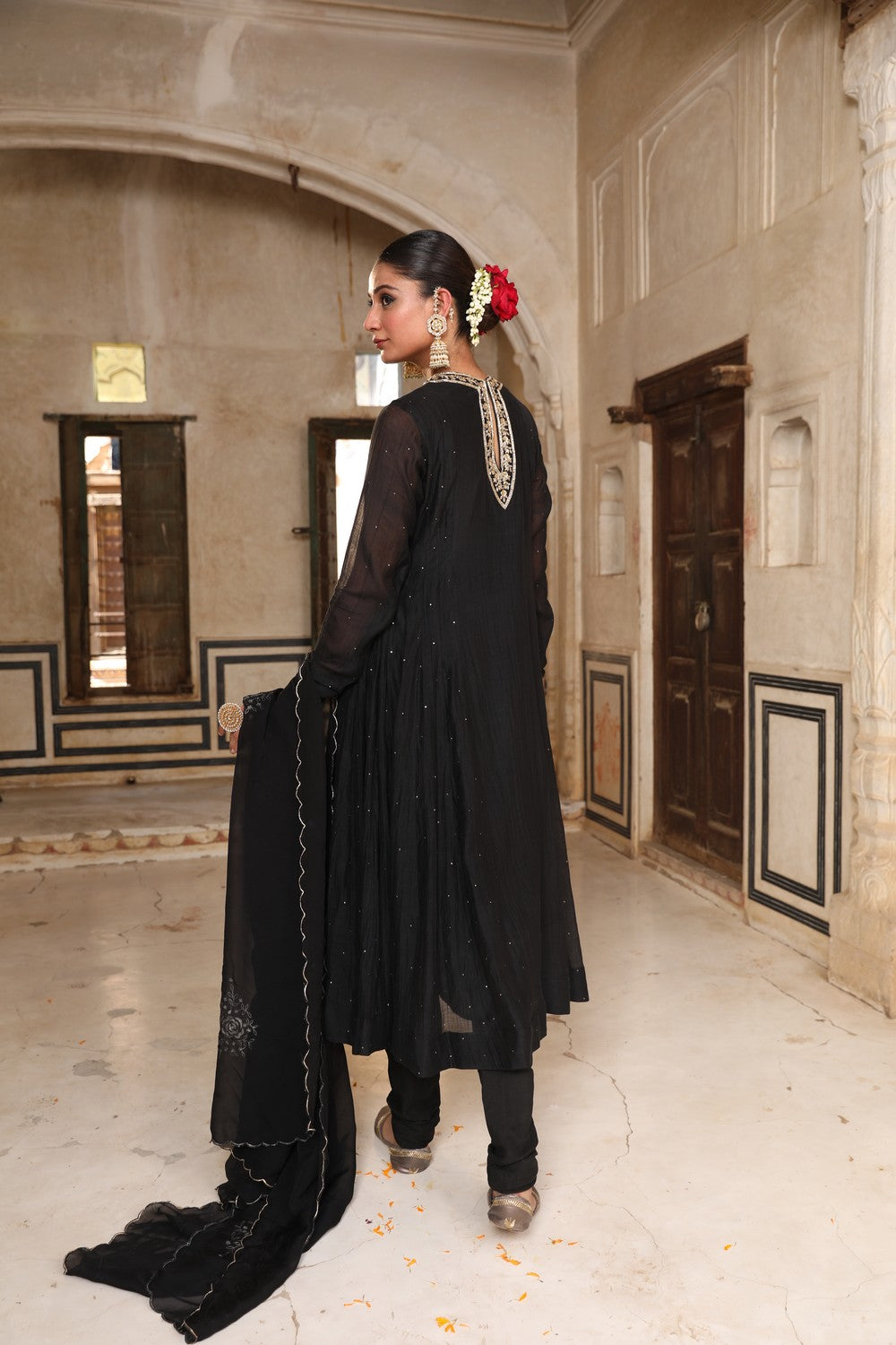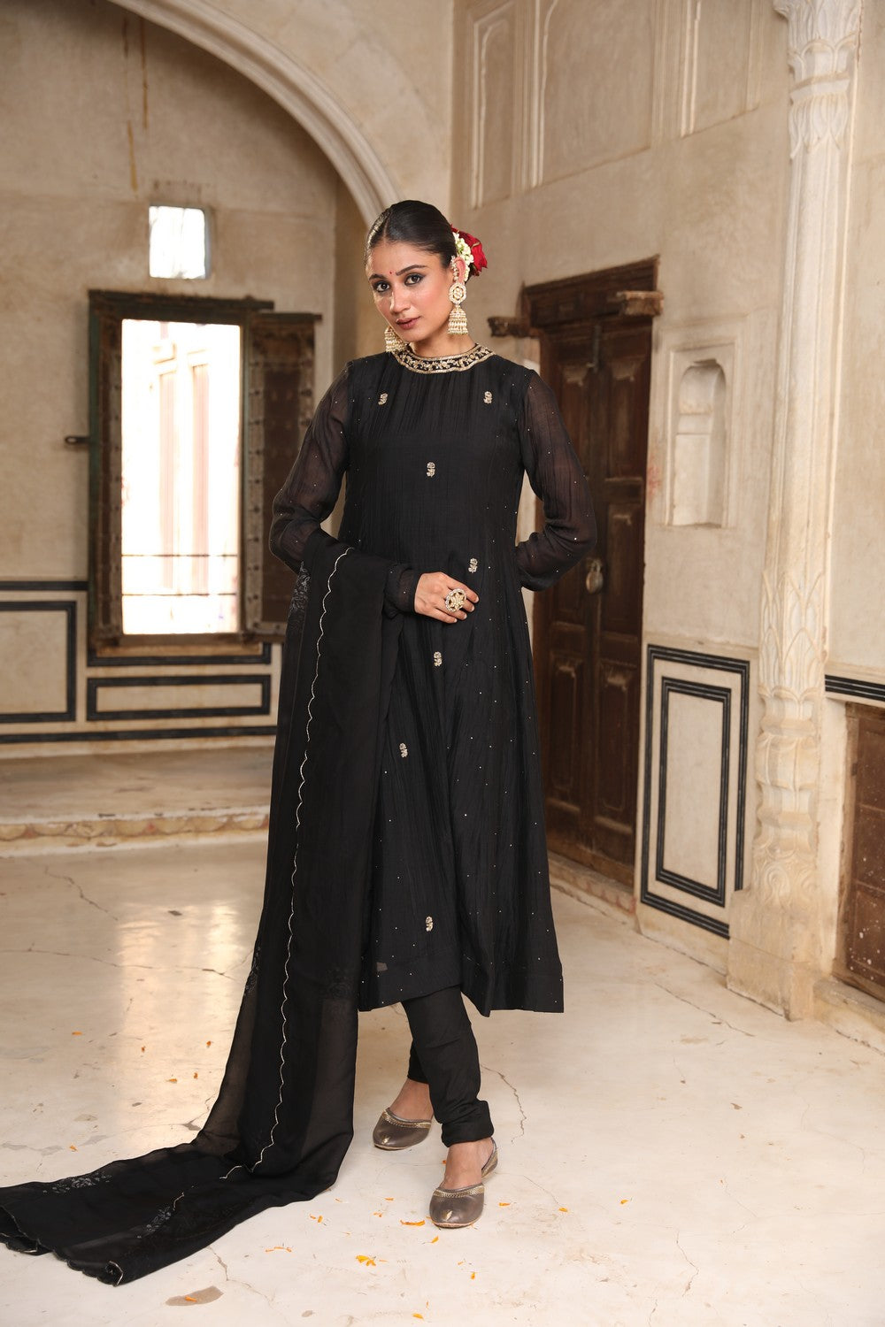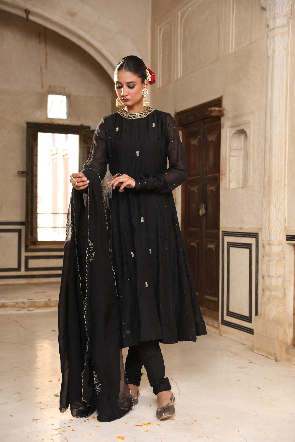 Embrace timeless elegance with our Siyaah Kali Suit Set, crafted in luxurious black silk and lined with soft 100% cotton for comfort. This stunning kali suit features exquisite mukaish and zardosi hand embroidery, creating a look that's both traditional and regal. The 3-piece stitched set includes a 48-inch kali-style suit, a churidaar, and a 2.5-meter dupatta, perfect for special occasions and festive celebrations.