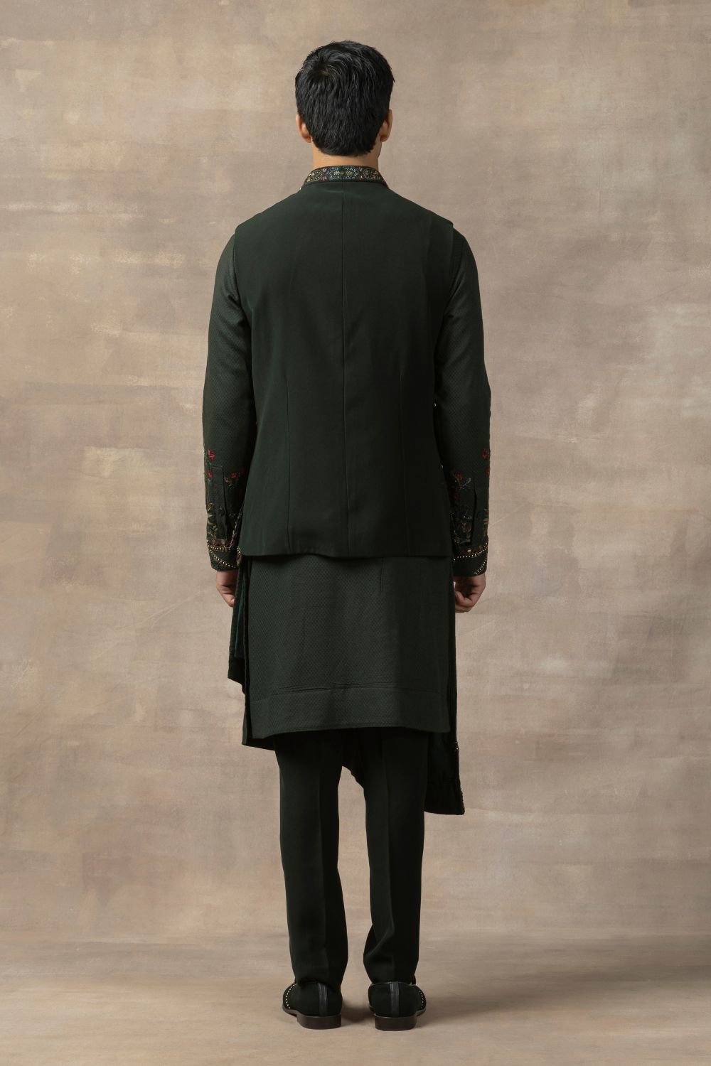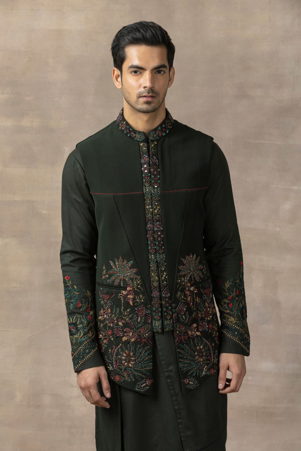 Featuring forest green waistcoat with thread and pearl work paired with forest green panel kurta and pants