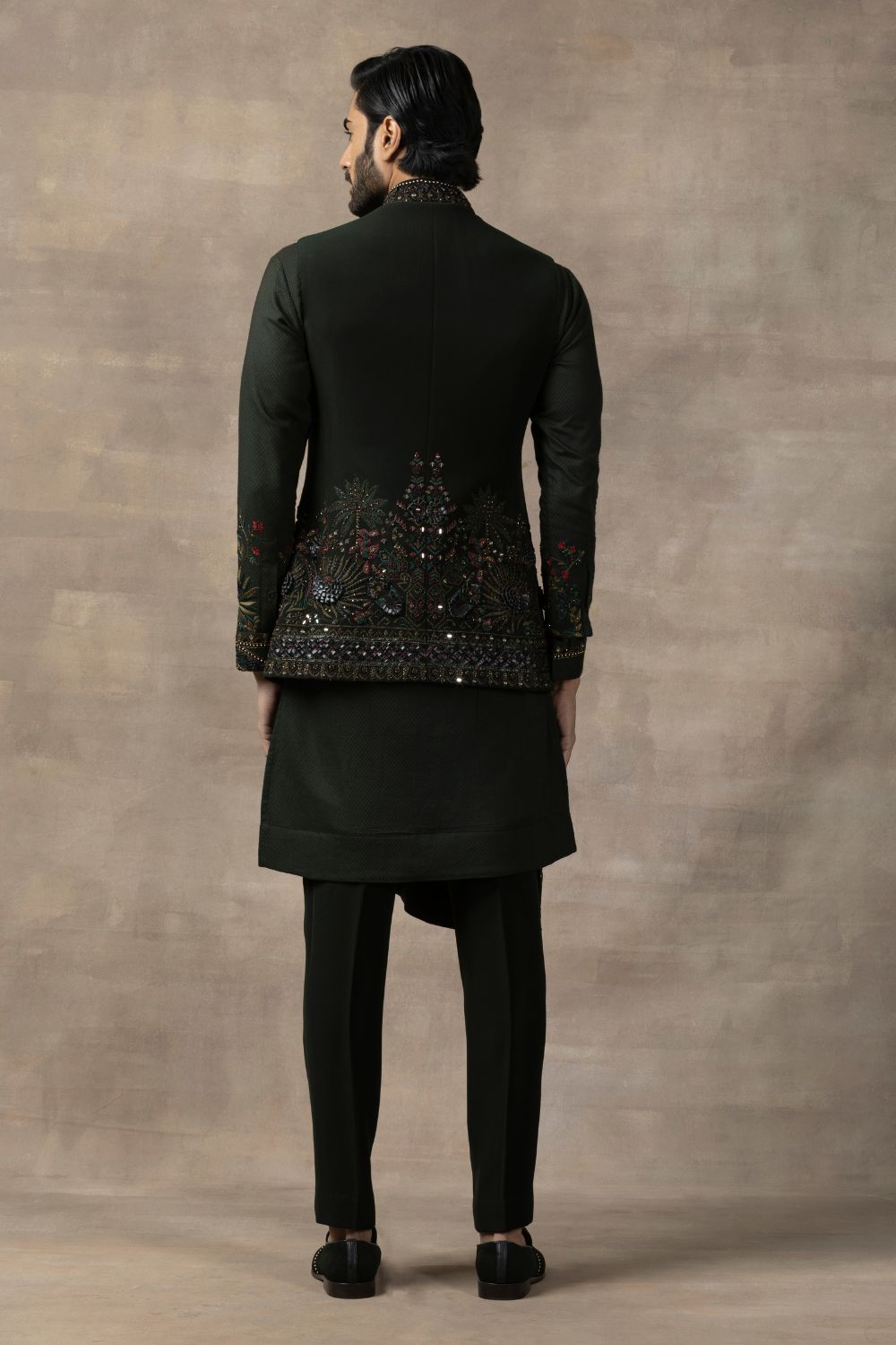 Featuring forest green slant waistcoat with thread and pearl work paired with forest green panel kurta and pants