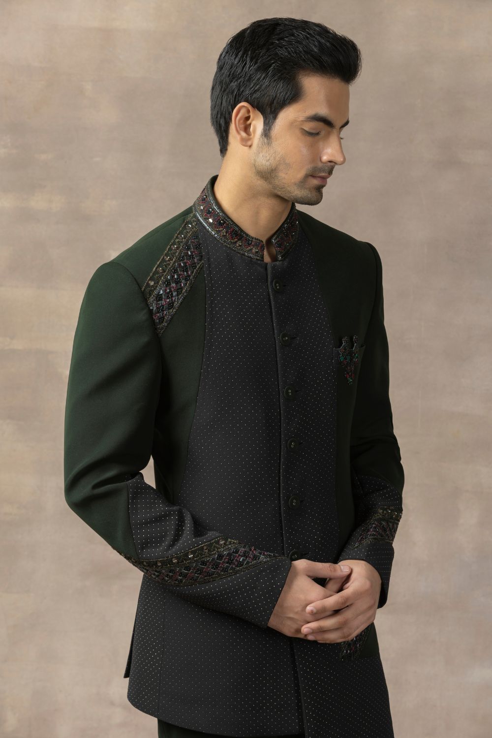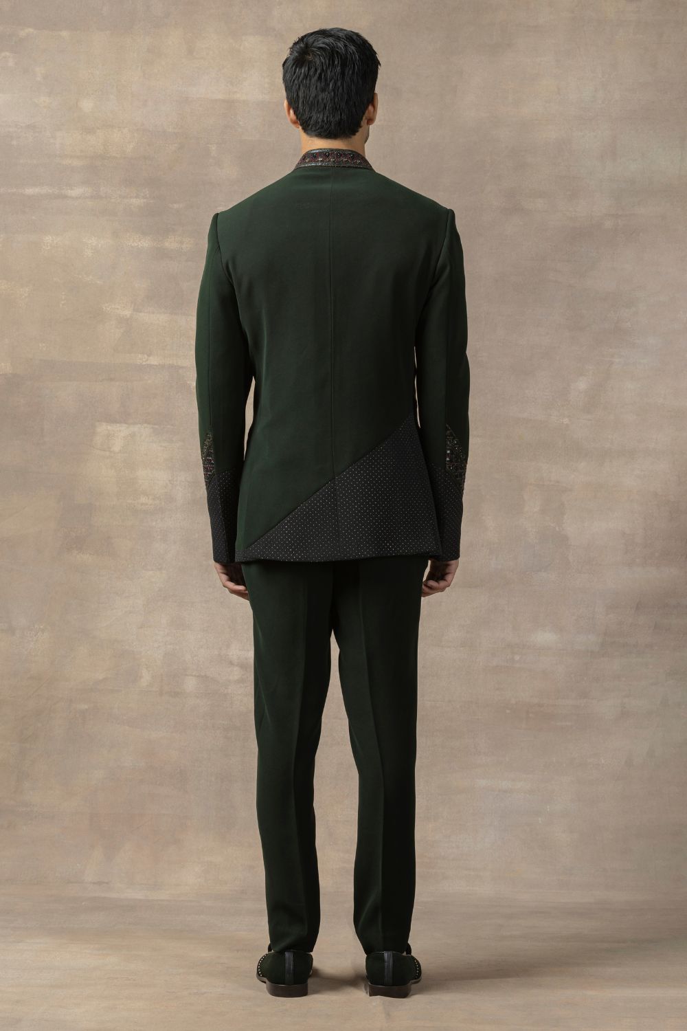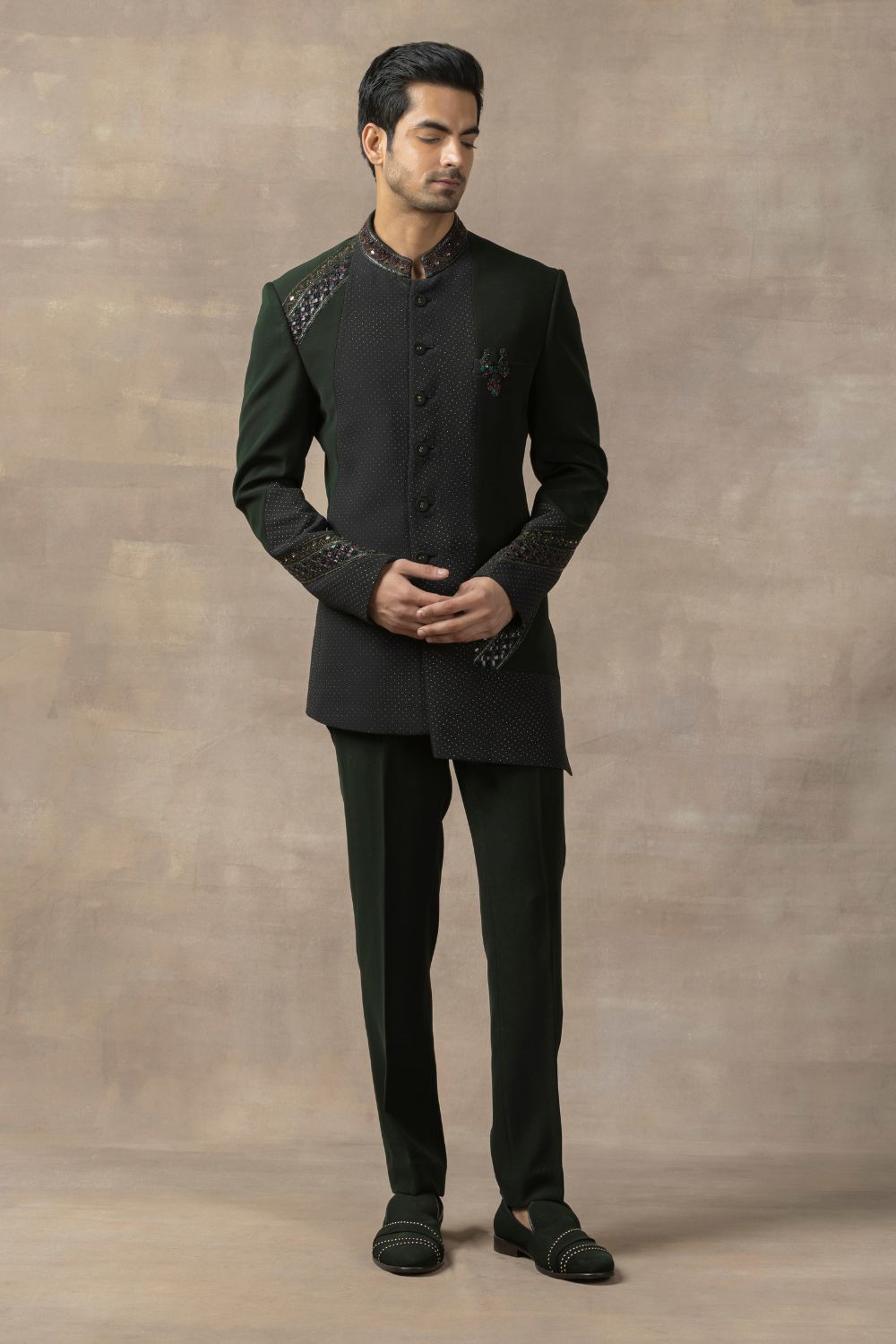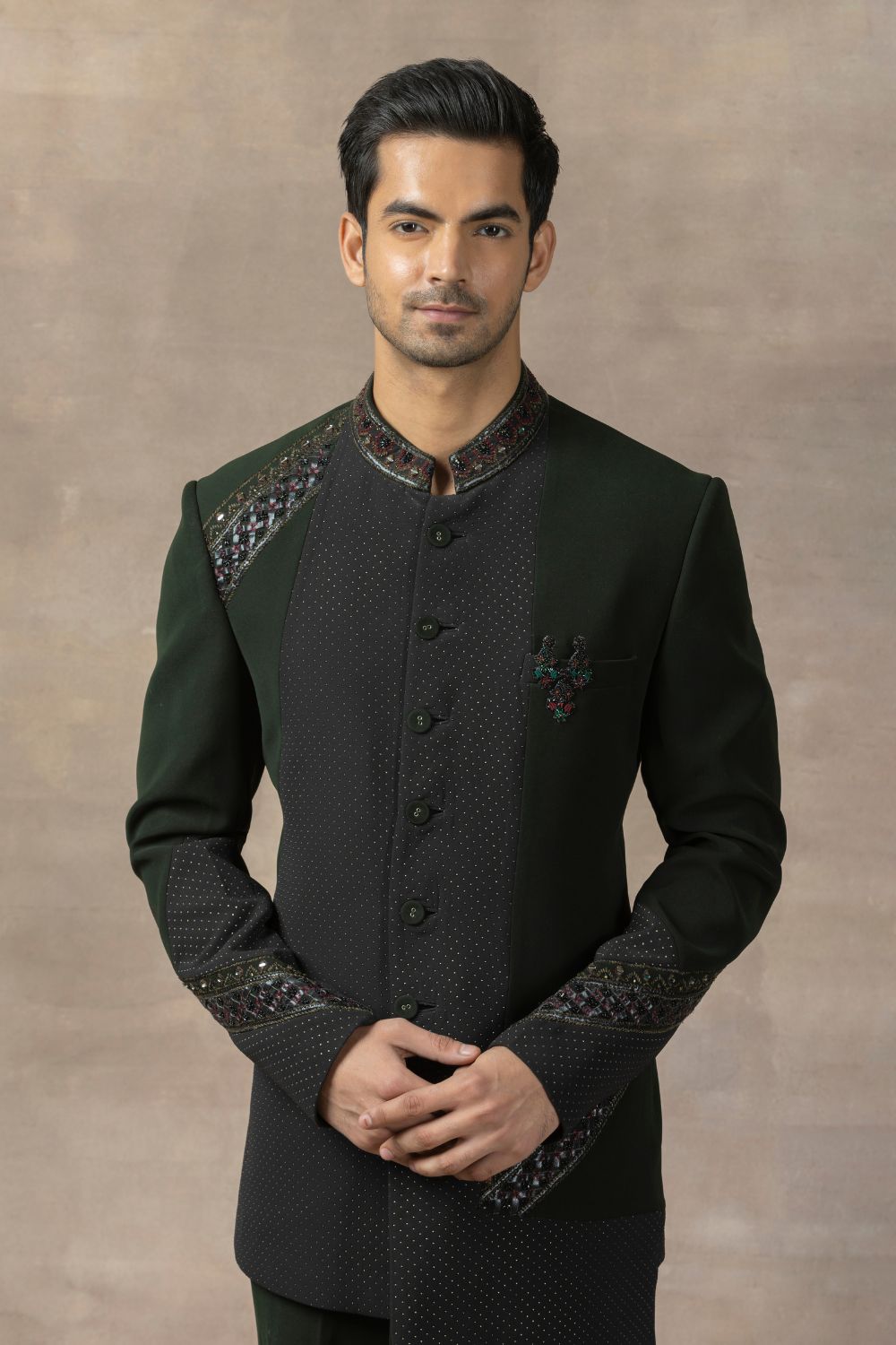 Featuring forest green bandhgala highlighted with thread and pearl work paired with pants