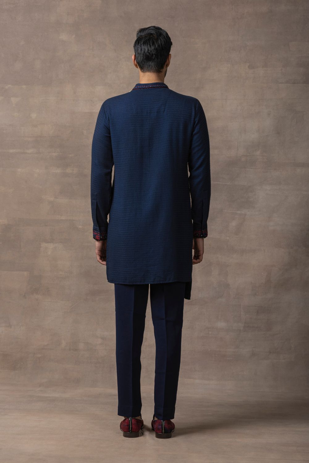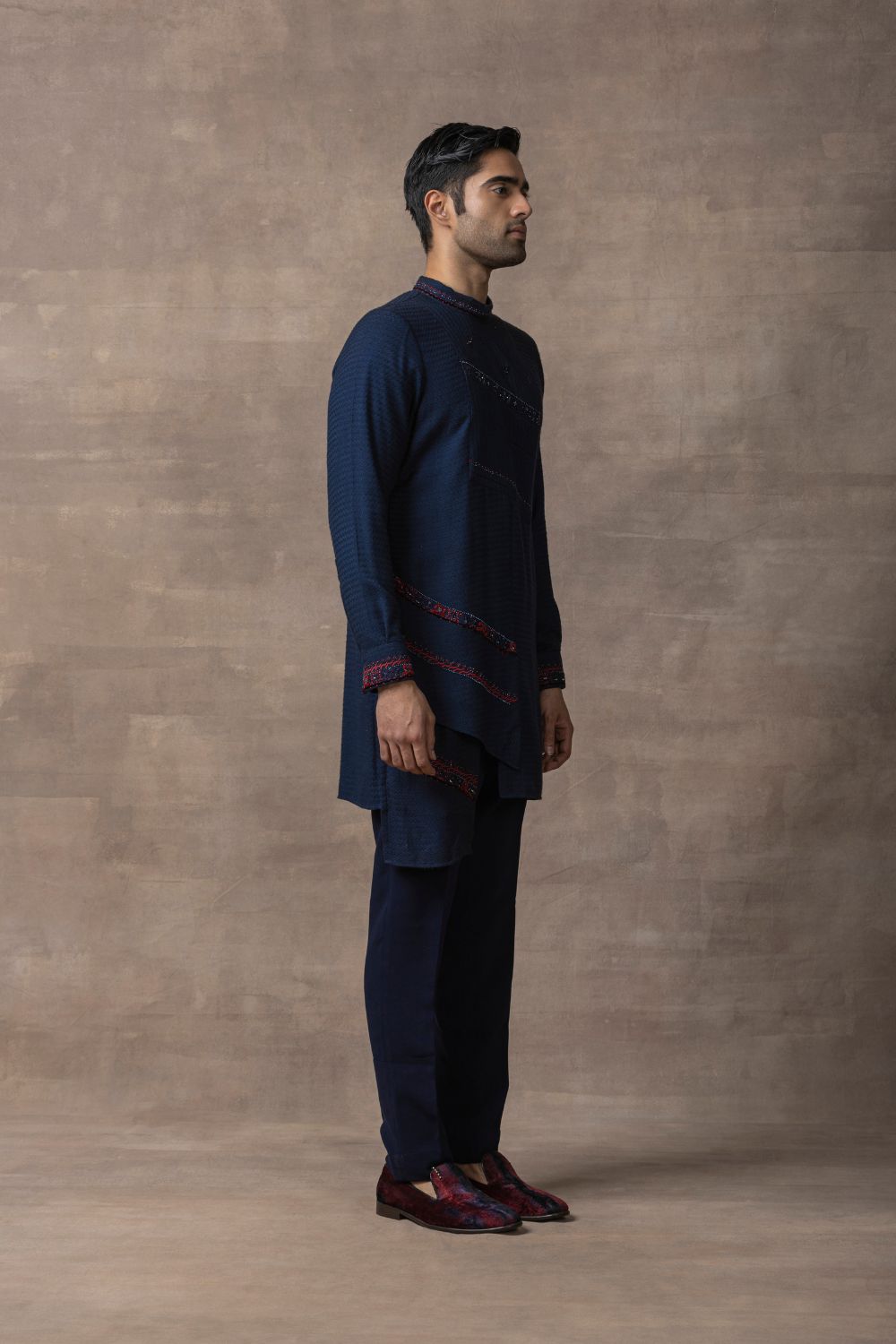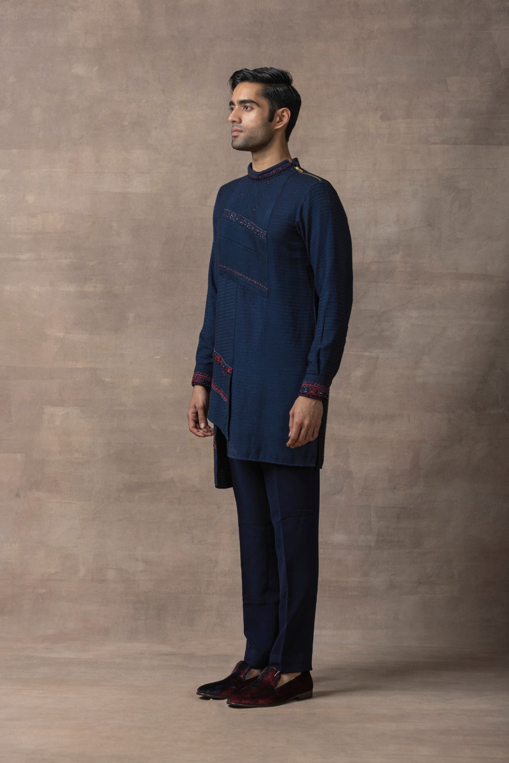 Featuring navy kurta with panel highlighted with pearl & thread work detailing paired with pants
