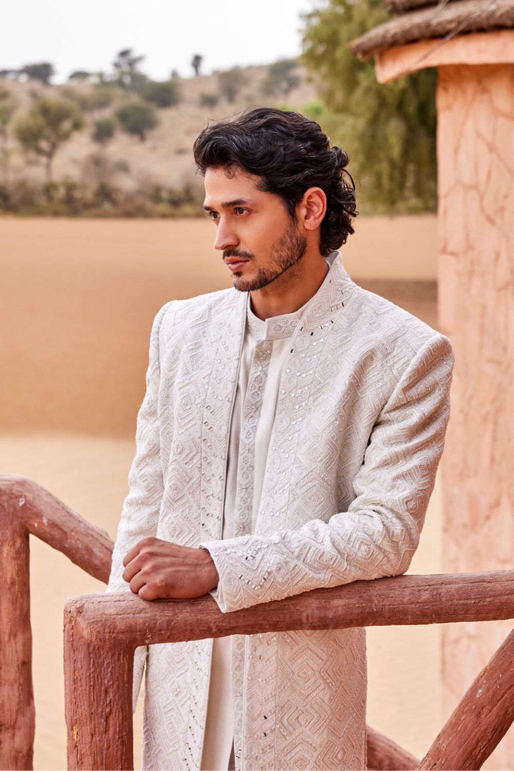 Featuring ivory front open sherwani with mirror and thread work highligted with pearl detaling paired with kurta, pants, duptta, shoes & safa fabric