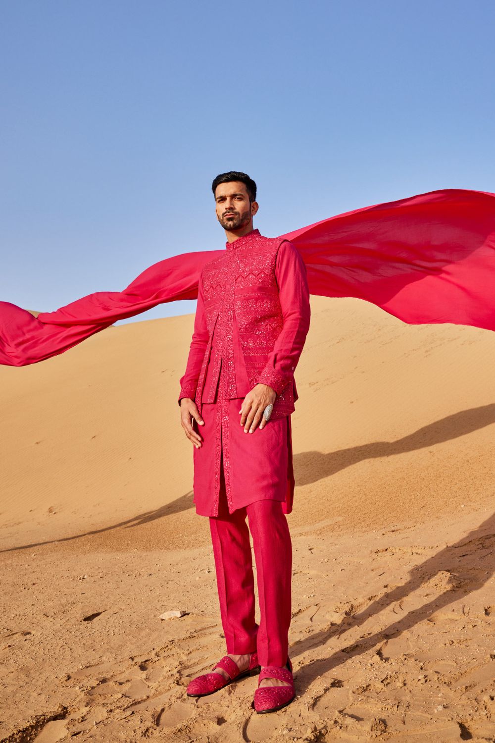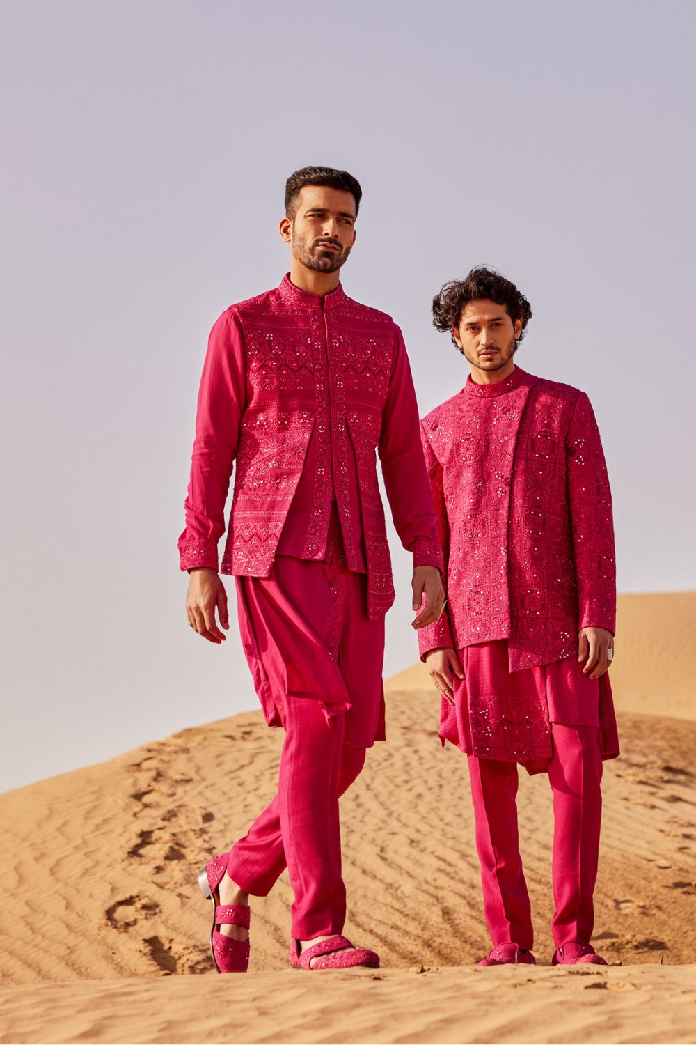 Featuring hot pink front open style waistcoat highlighted with mirror pearl and sequin work paired with kurta and pants