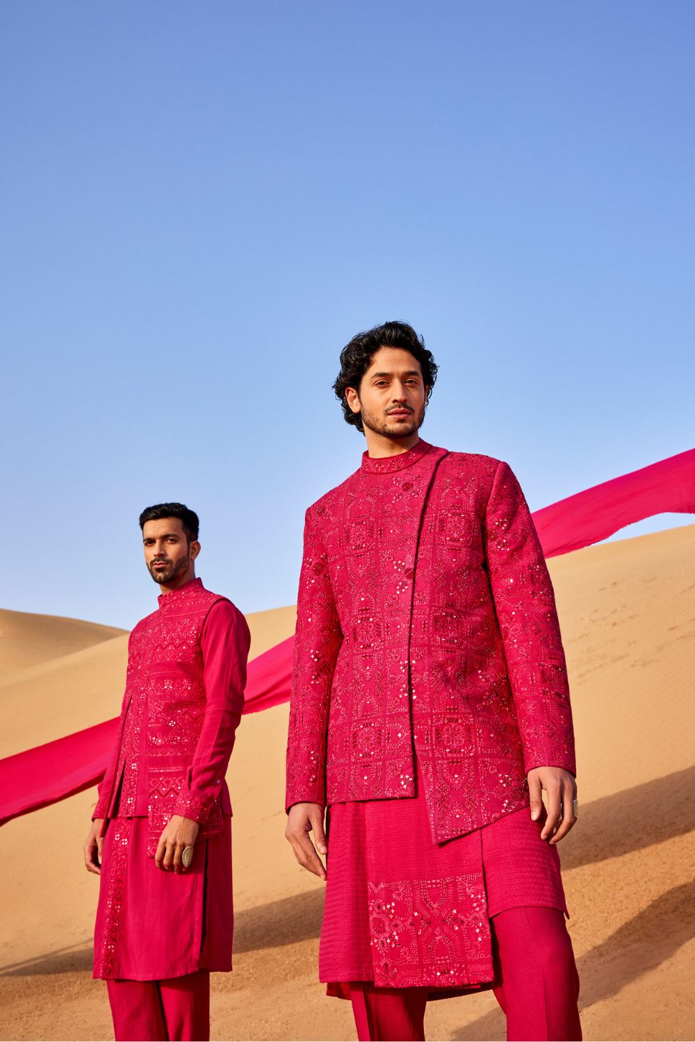 Featuring hot pink slant cut style bandhgala highlighted with mirror pearl and sequin work paired with kurta and pants