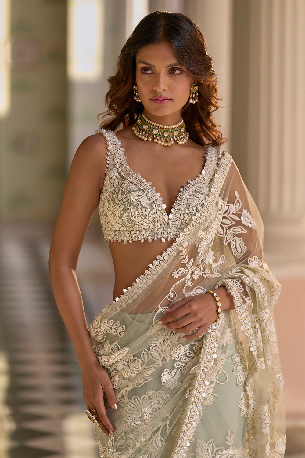 This saree features ivory thread and sequin embroidery on a mint green net base. The embroidered blouse shows plunging neckline with scalloped detailing and tassels on the neck and hem.