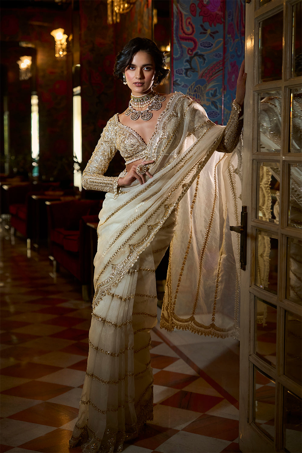 This ivory organza saree features all over intricate gota patti embroidery in a linear pattern. The saree shows scalloped border. The contrasting gold tissue silk full sleeves blouse shows pearl tassels at the waist, wrist and at the back of the blouse.