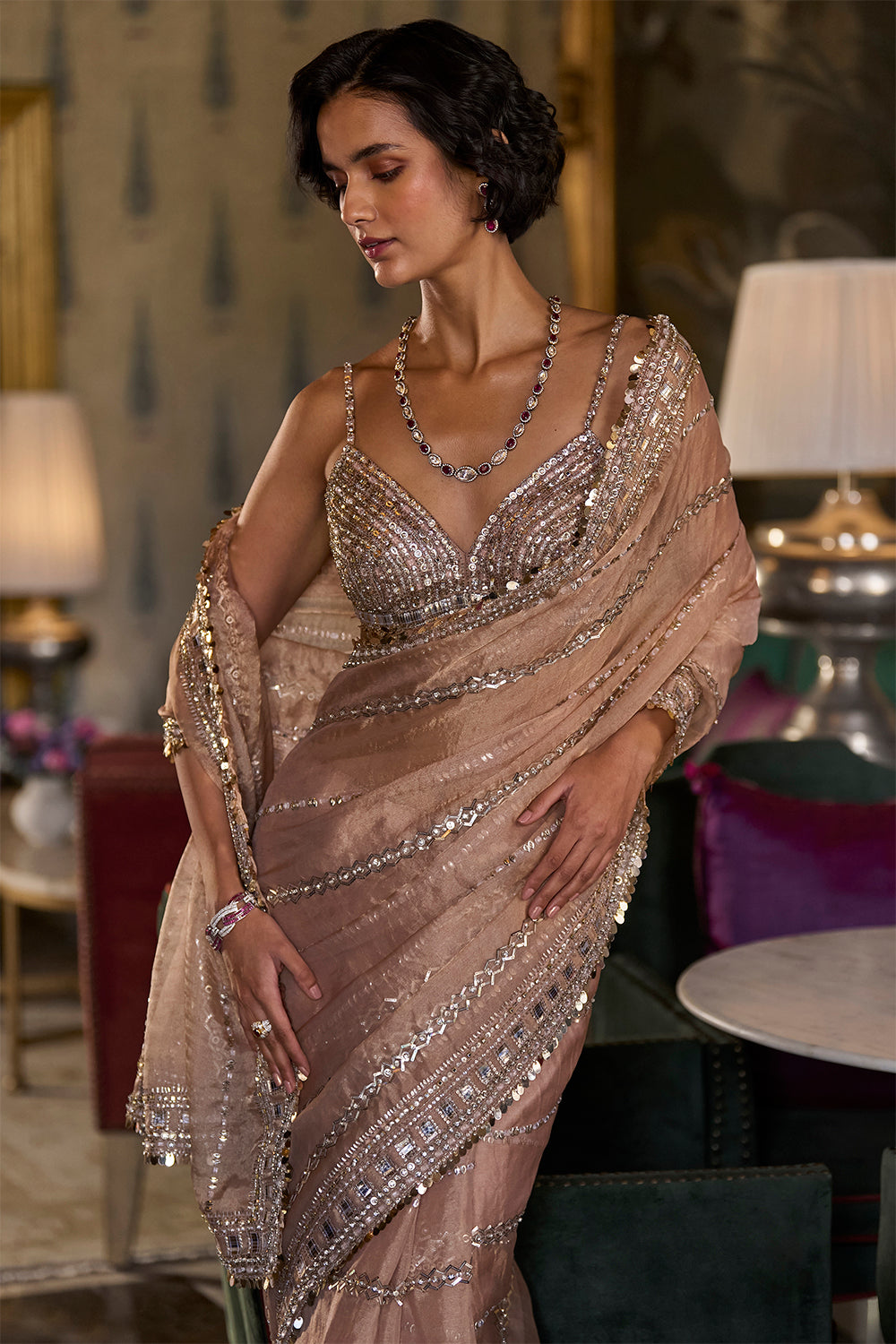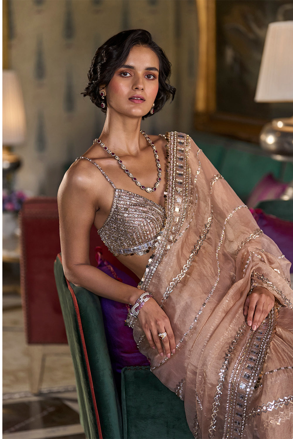This organza tissue saree features bold cut sequin embroidery in a linear pattern. It is paired with a matching embroidered strappy blouse.