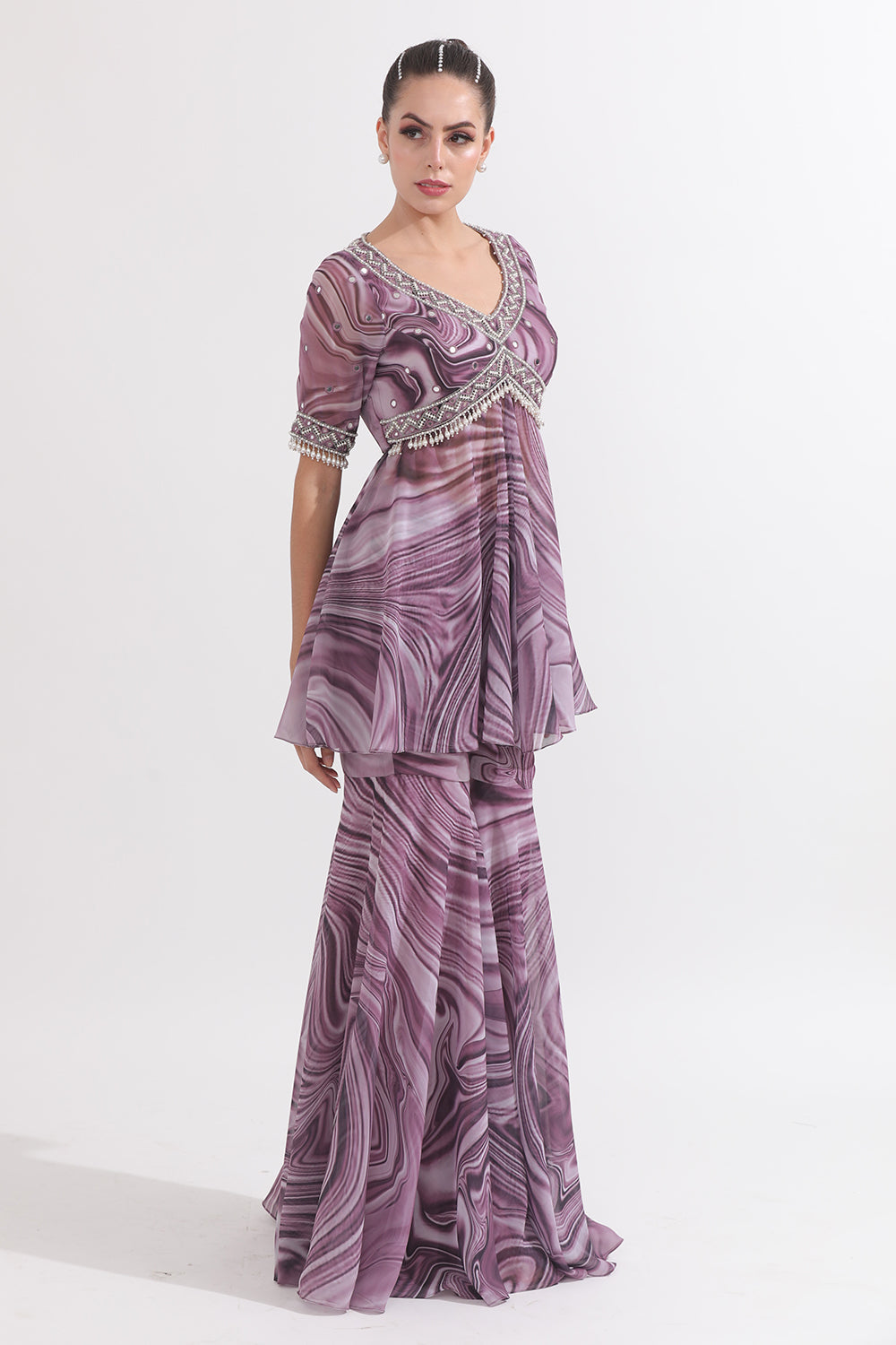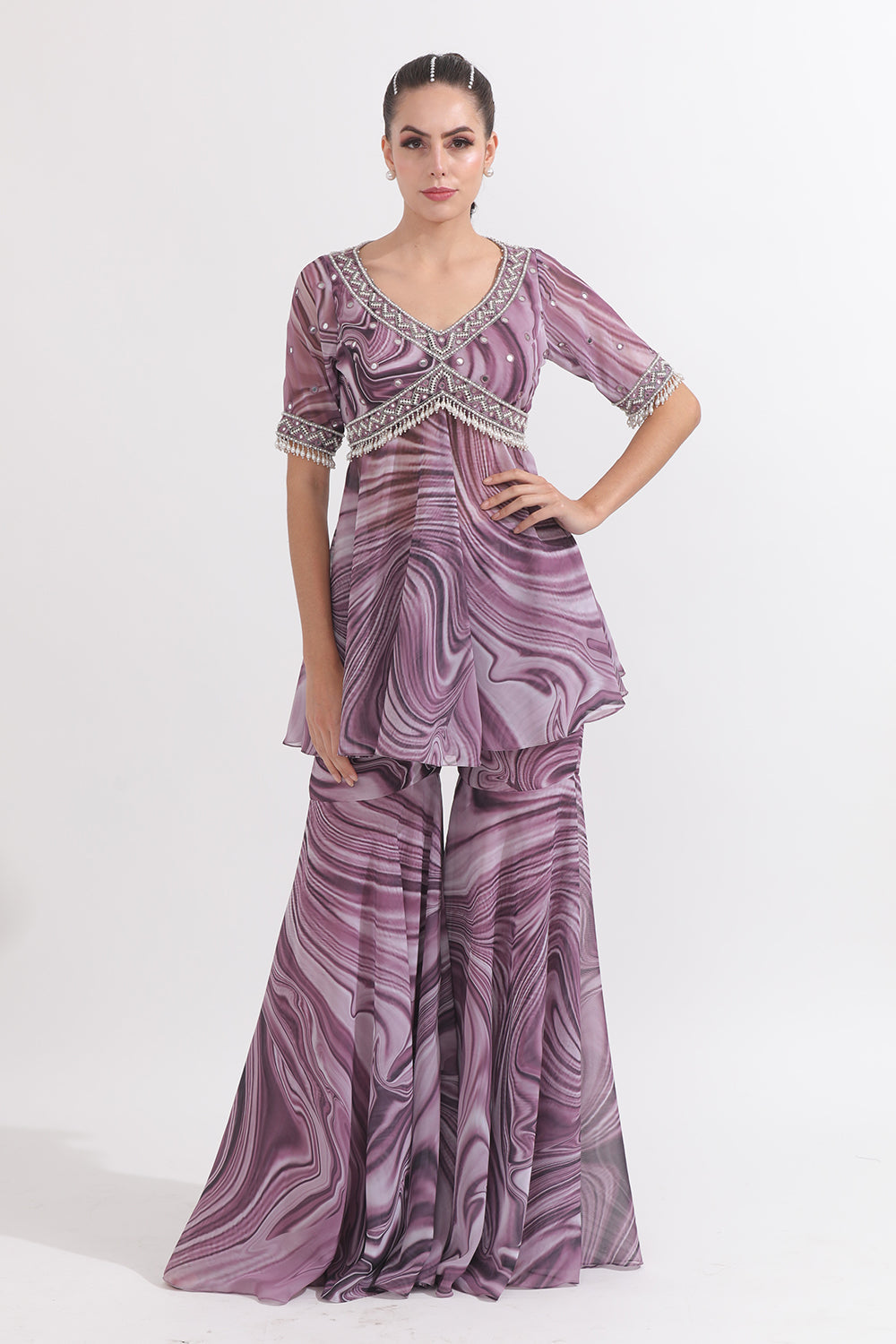 Featuring an embellished gharara Set with handcrafteded border on the neckline and waistline.