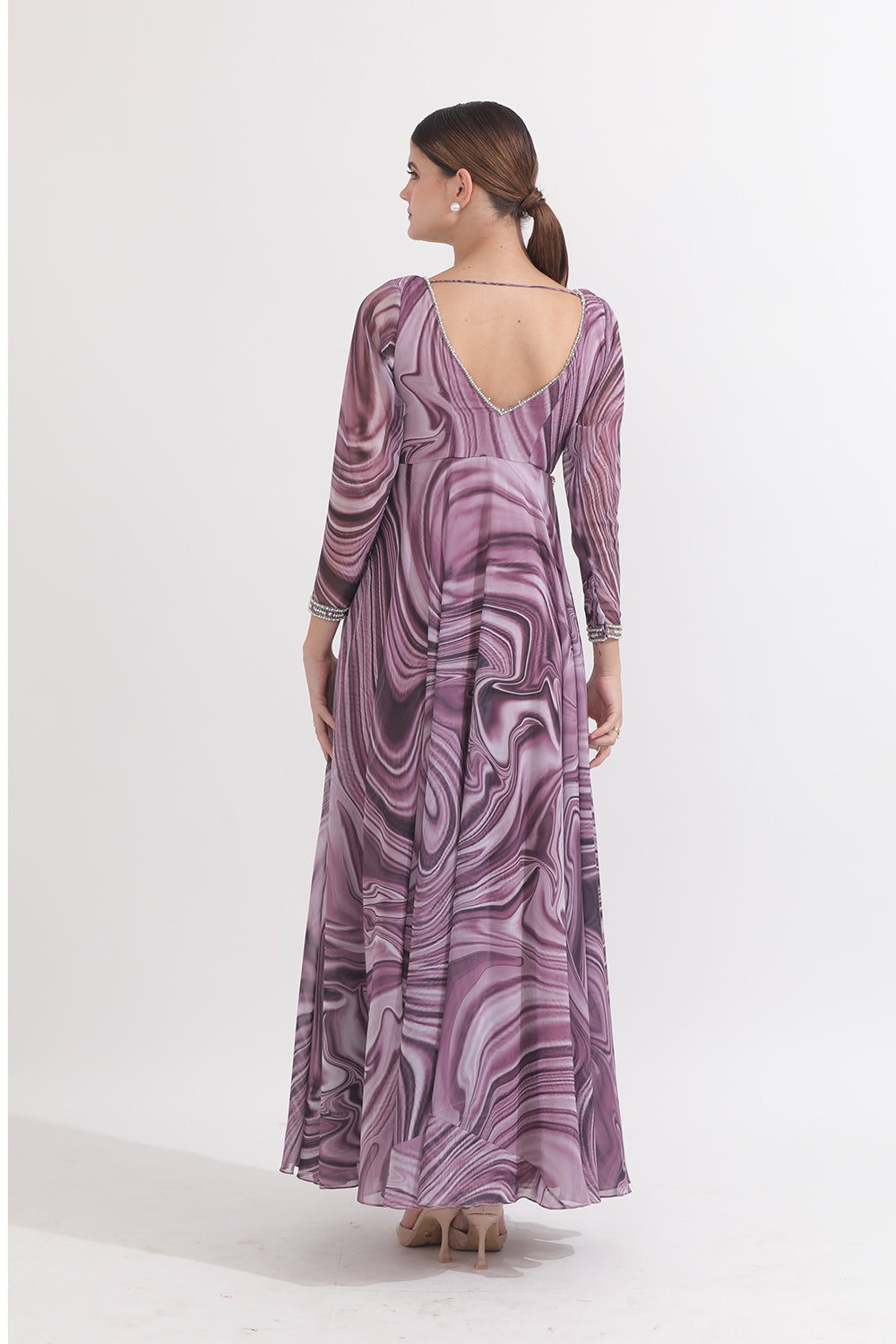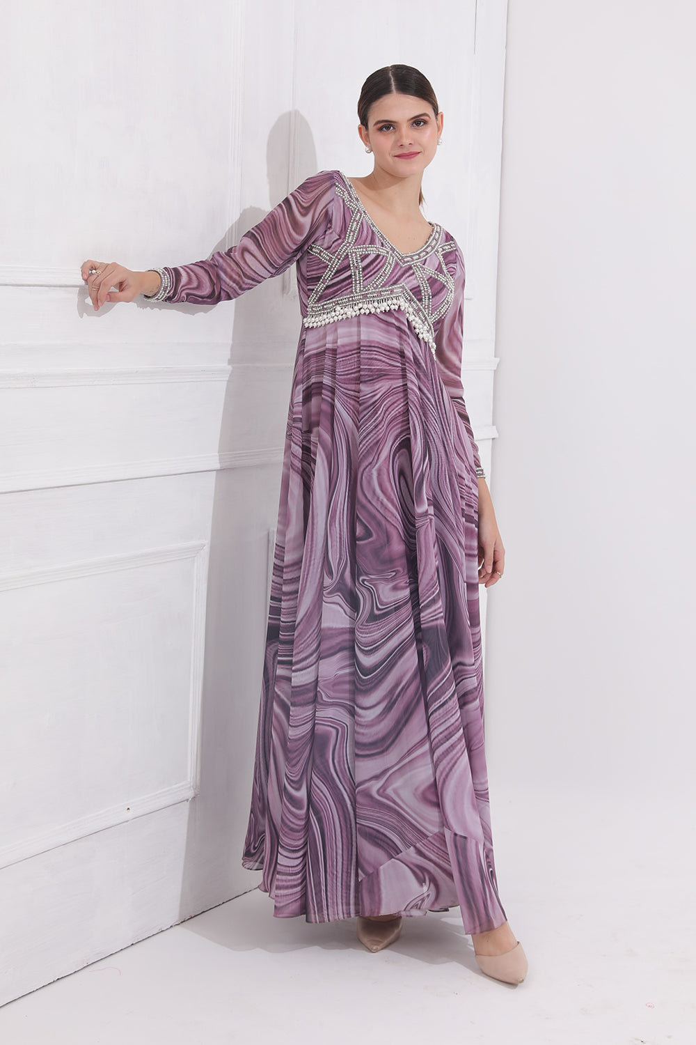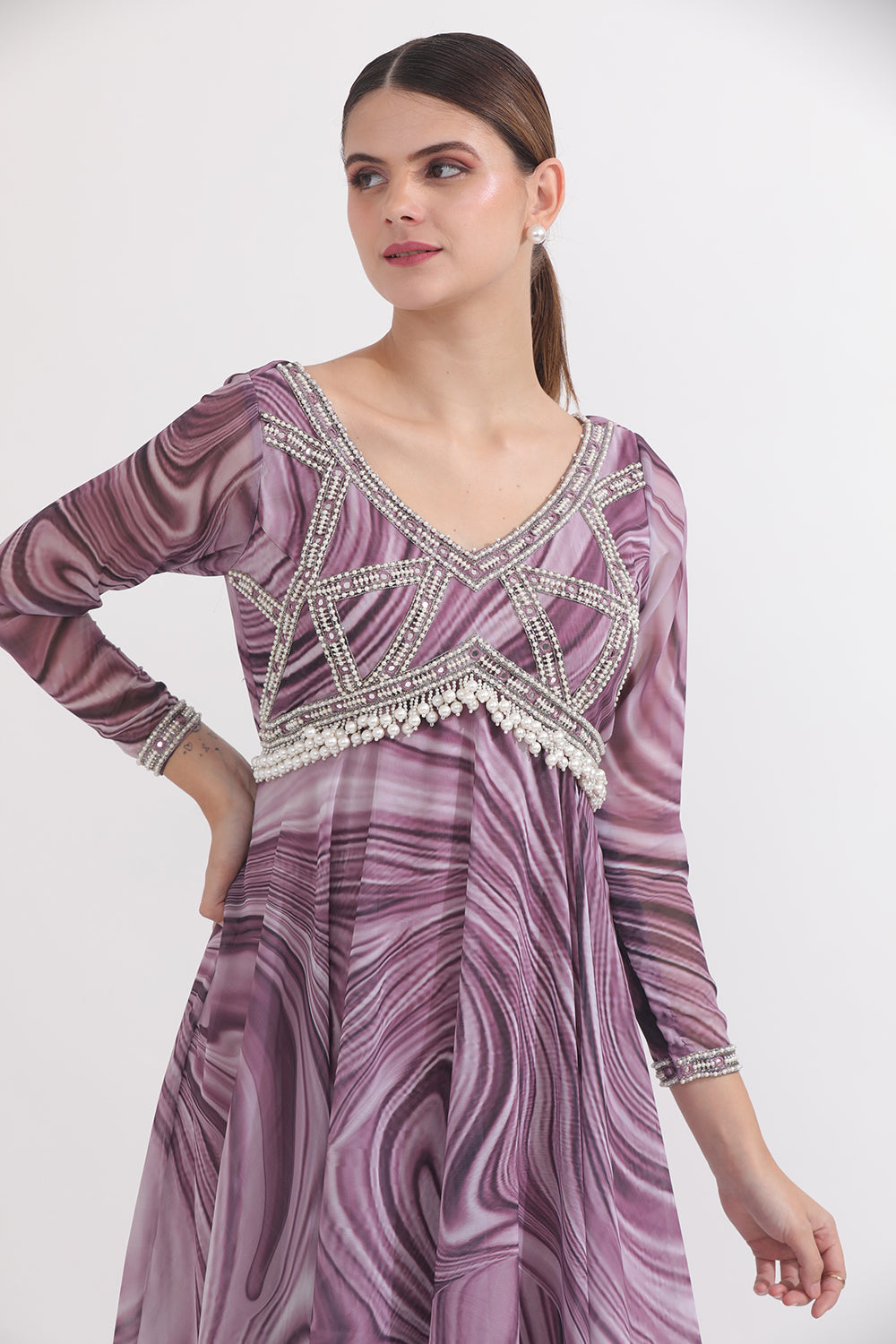 Featuring an handcrafted Neckline & waistline Anarkali paired with a net dupatta & tassels.