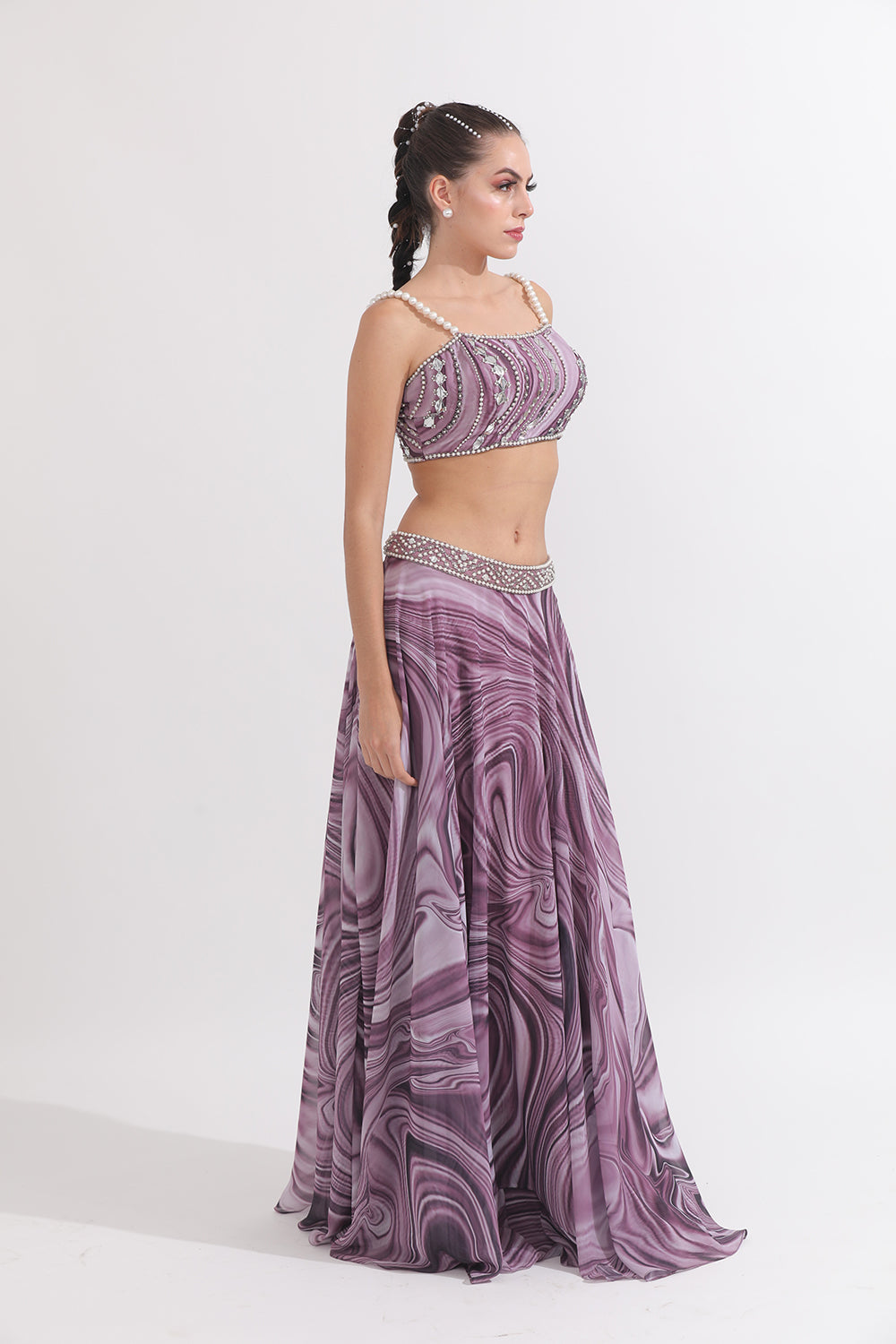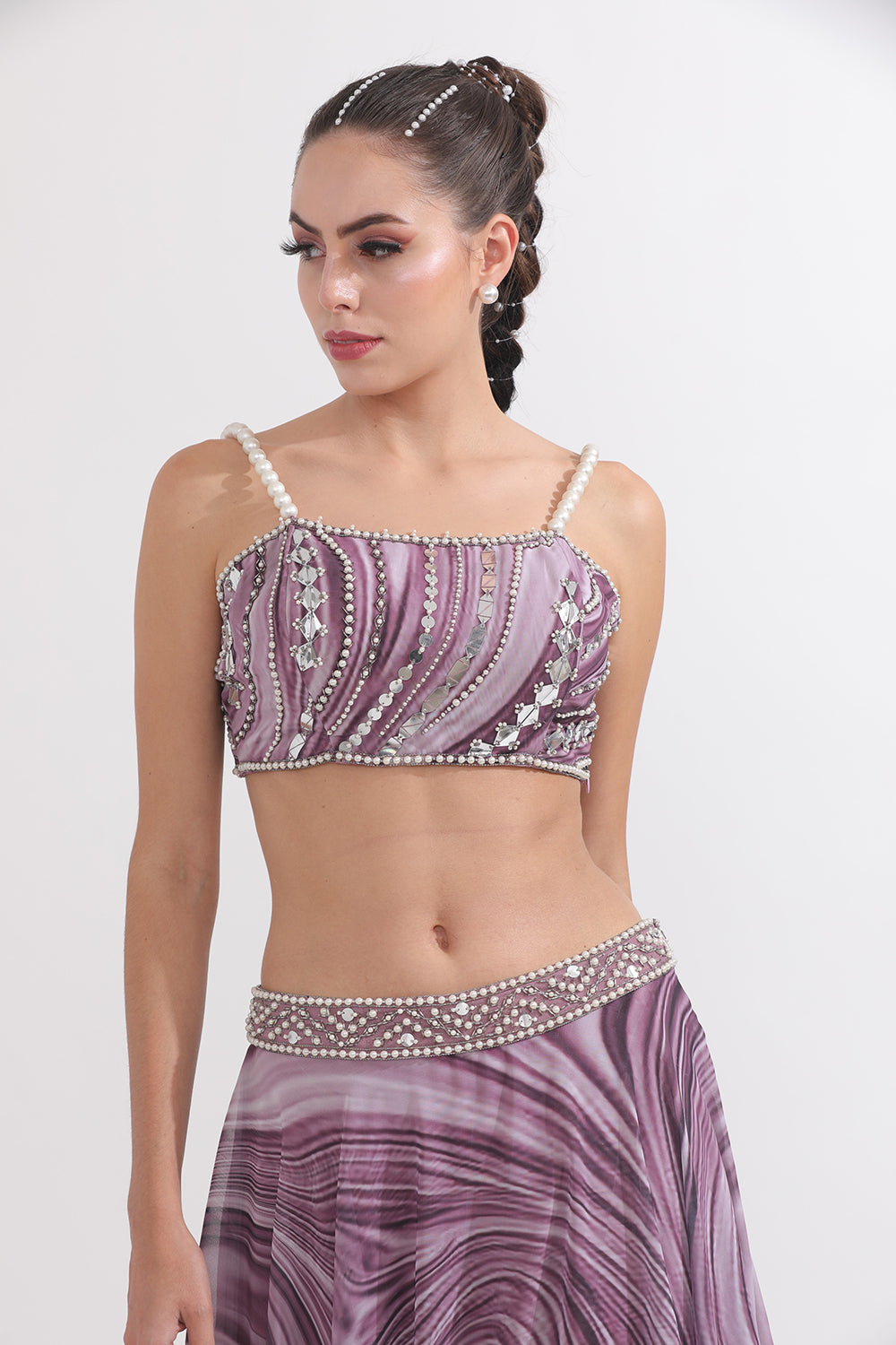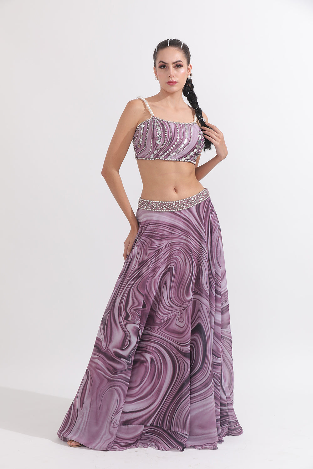 Featuring an embellished waved blouse with pearl straps, paired with an embroidered belt Skirt.