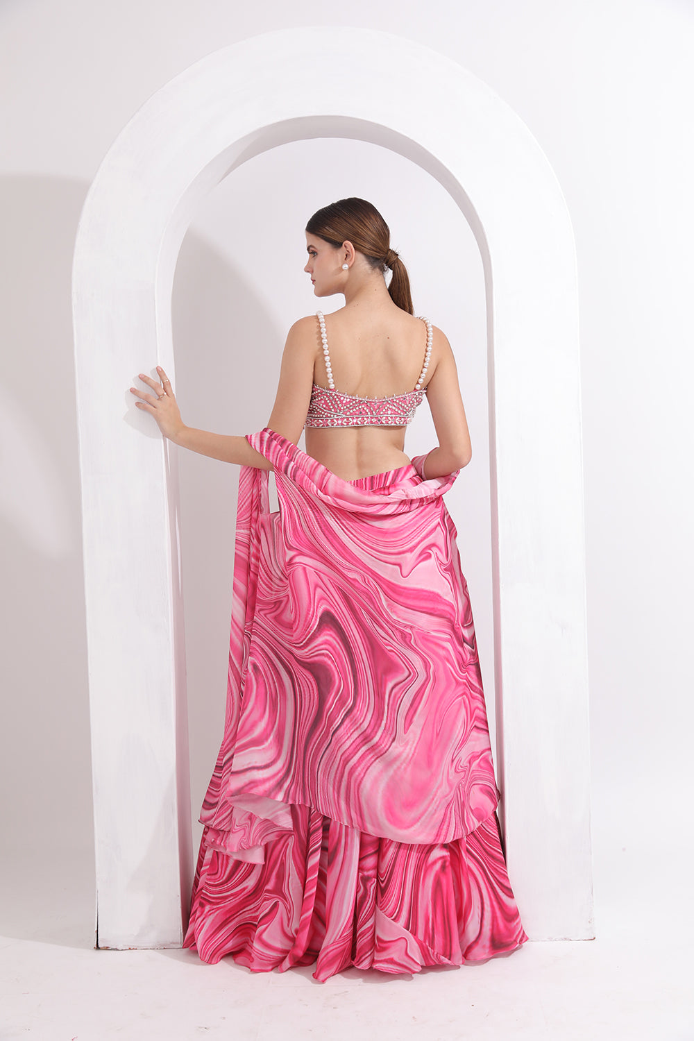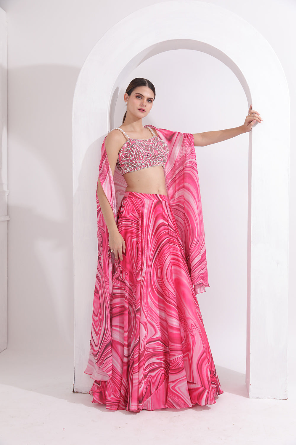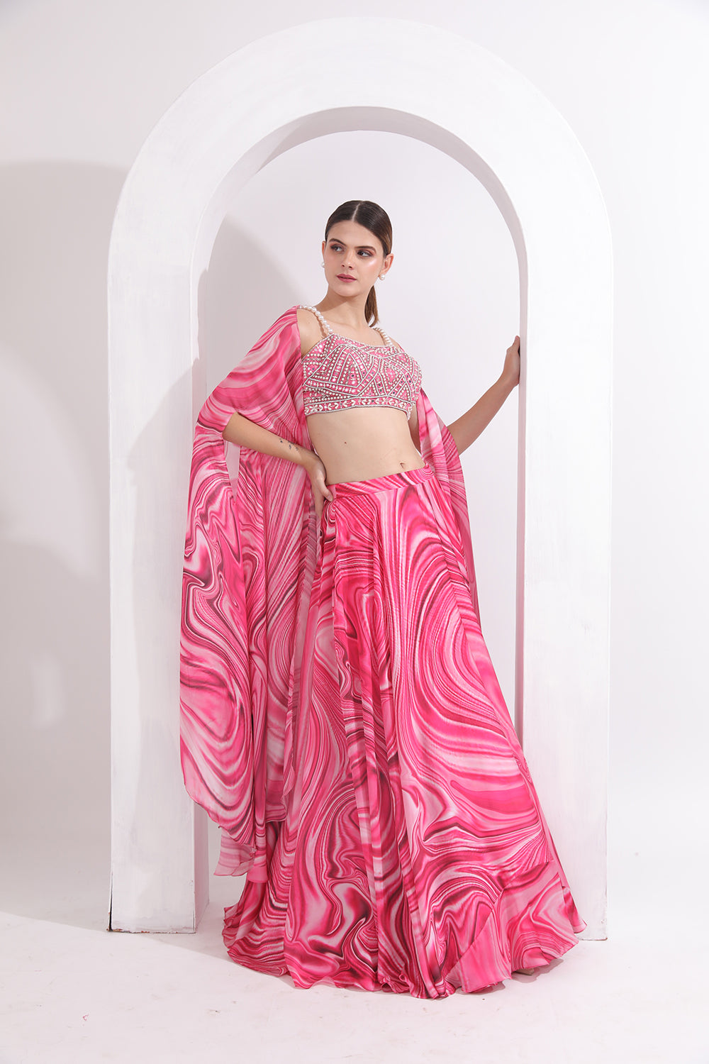 Featuring an embellished blouse paired with a flared skirt & a cape.