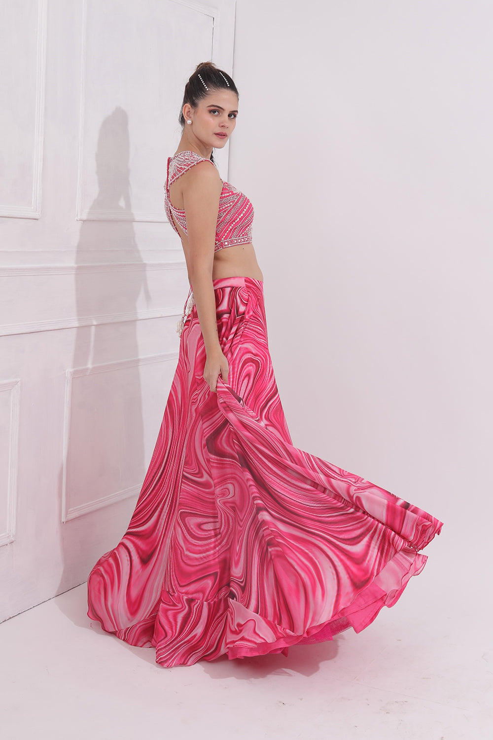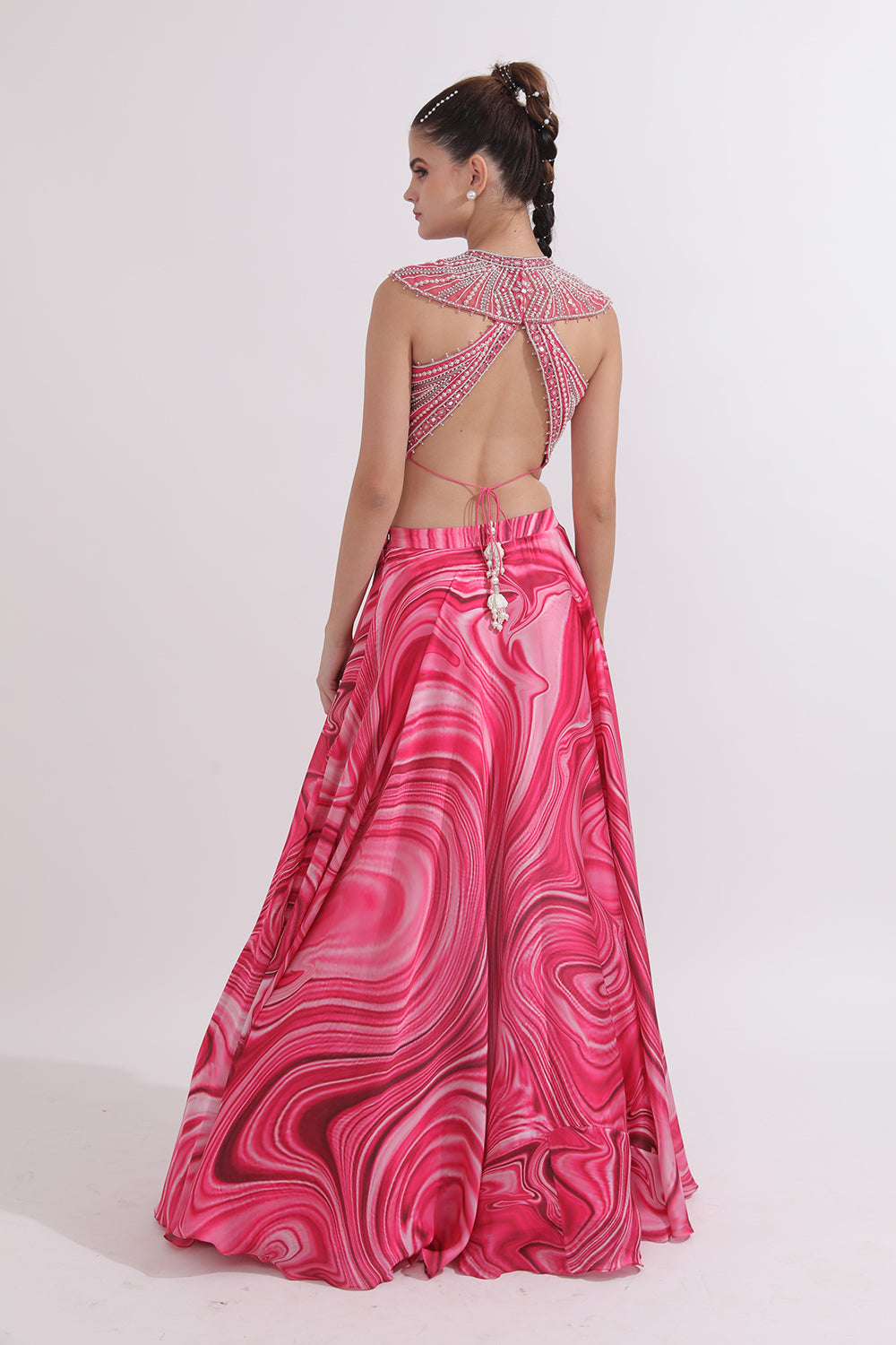 Featuring a backless embroidered blouse paired with a printed lehenga.