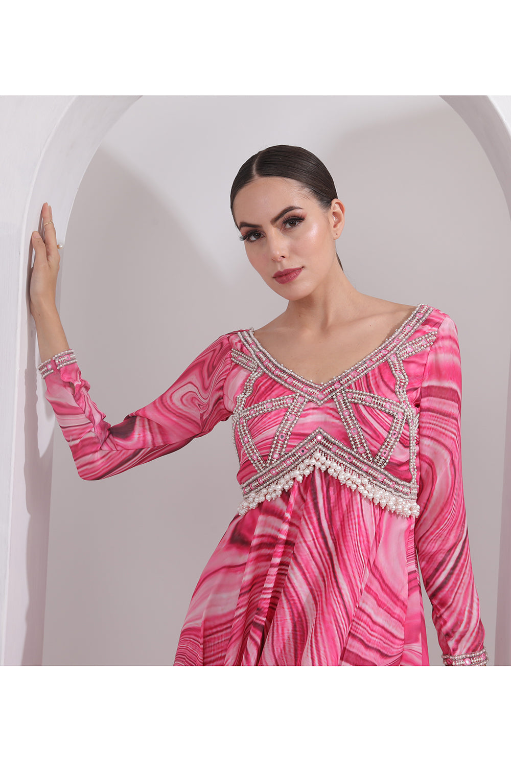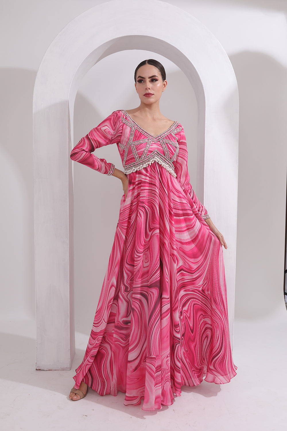 Featuring an handcrafted Neckline & waistline Anarkali paired with a net dupatta & tassels.