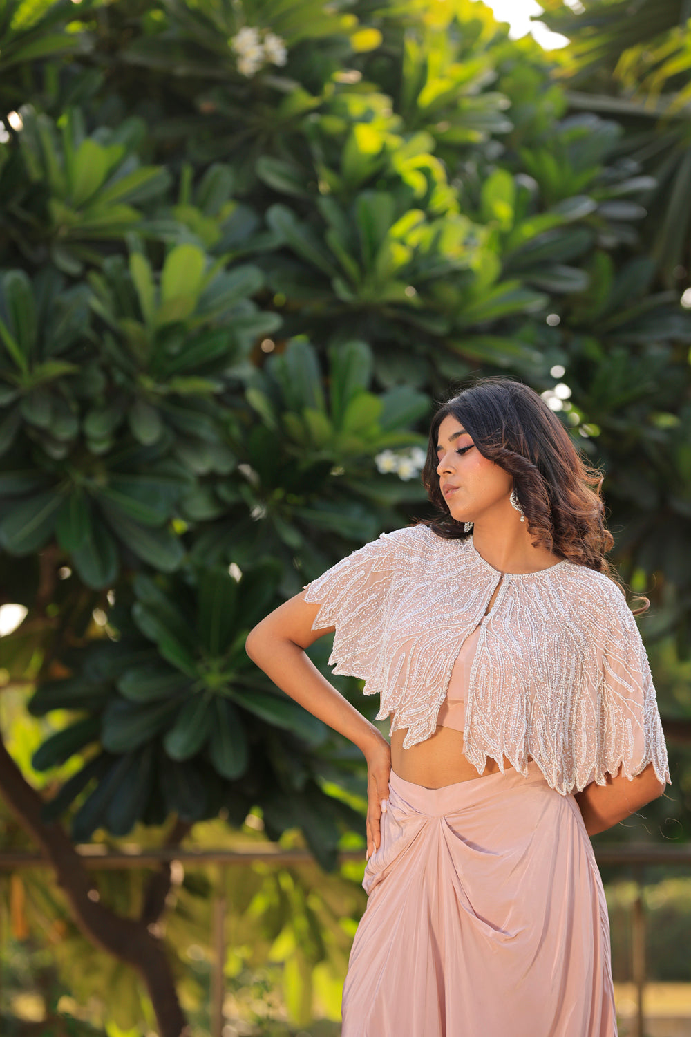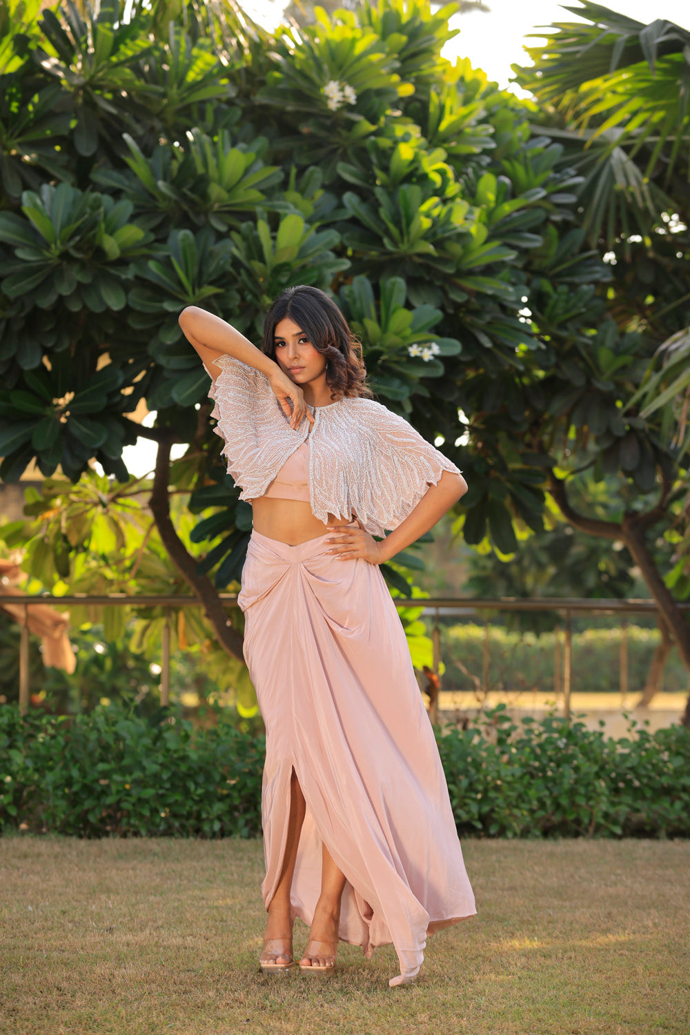 Persian persian pink poncho cape set with drape slit skirt embellished with katdana and bead work comes in georgette and viscose crepe and lining shatoon