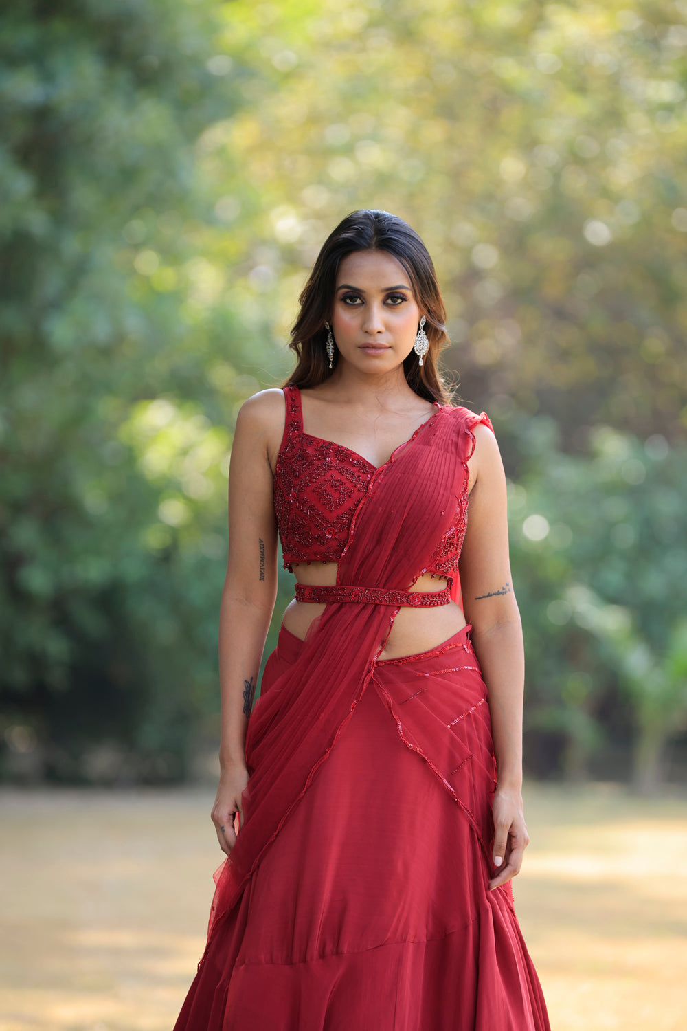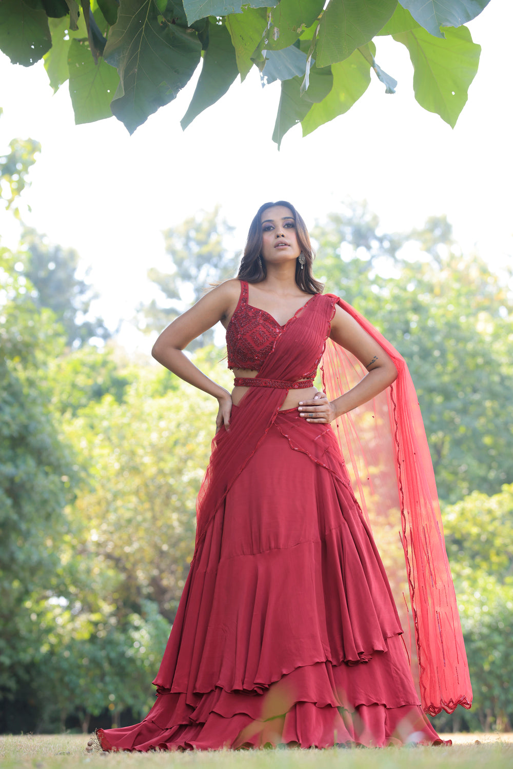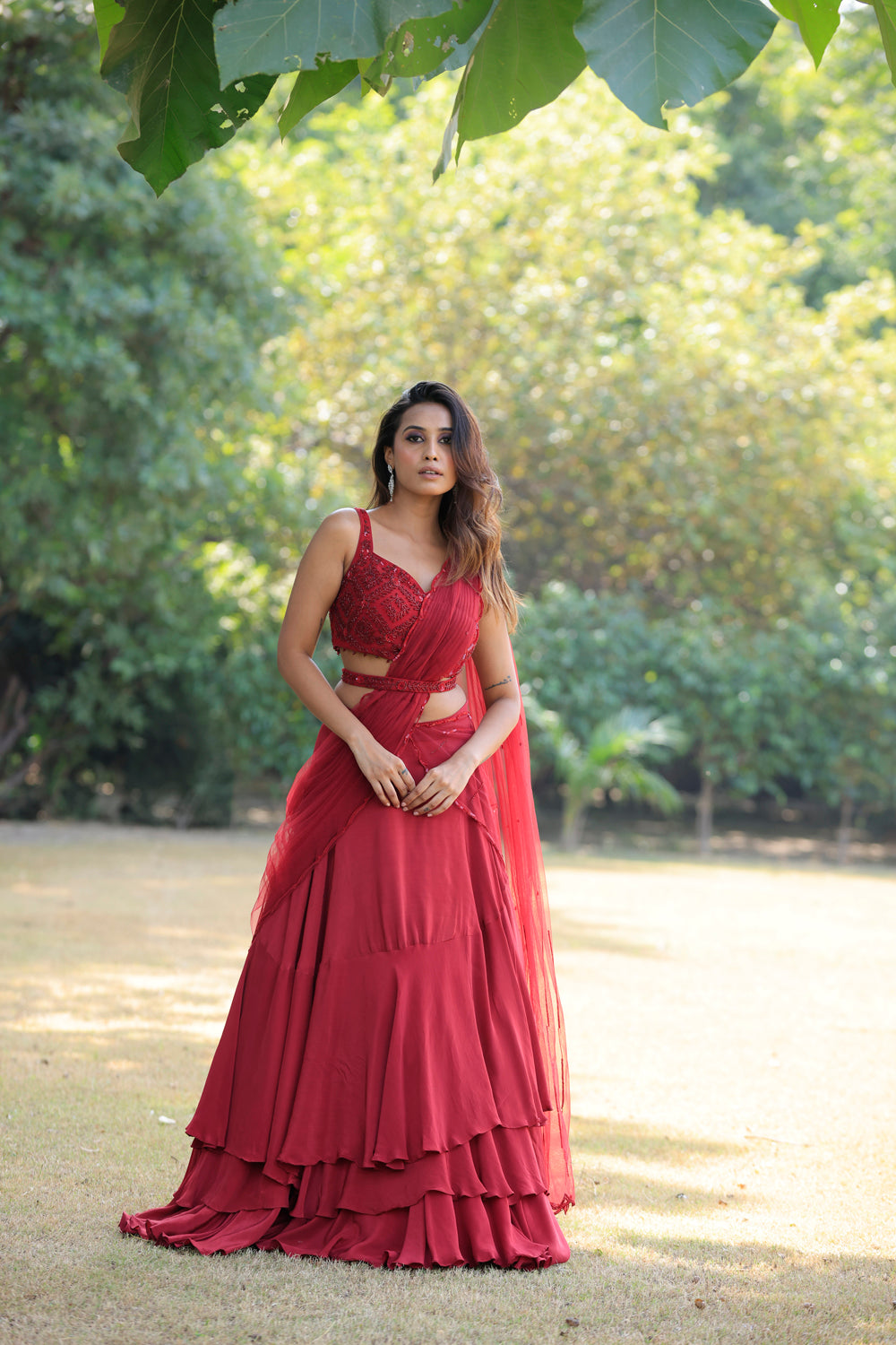 Ruby red crystal drape layered lehenga with attached drape dupatta with waist belt embellished with katdana and crystal work comes in viscose crepe, net & shantoon lining.