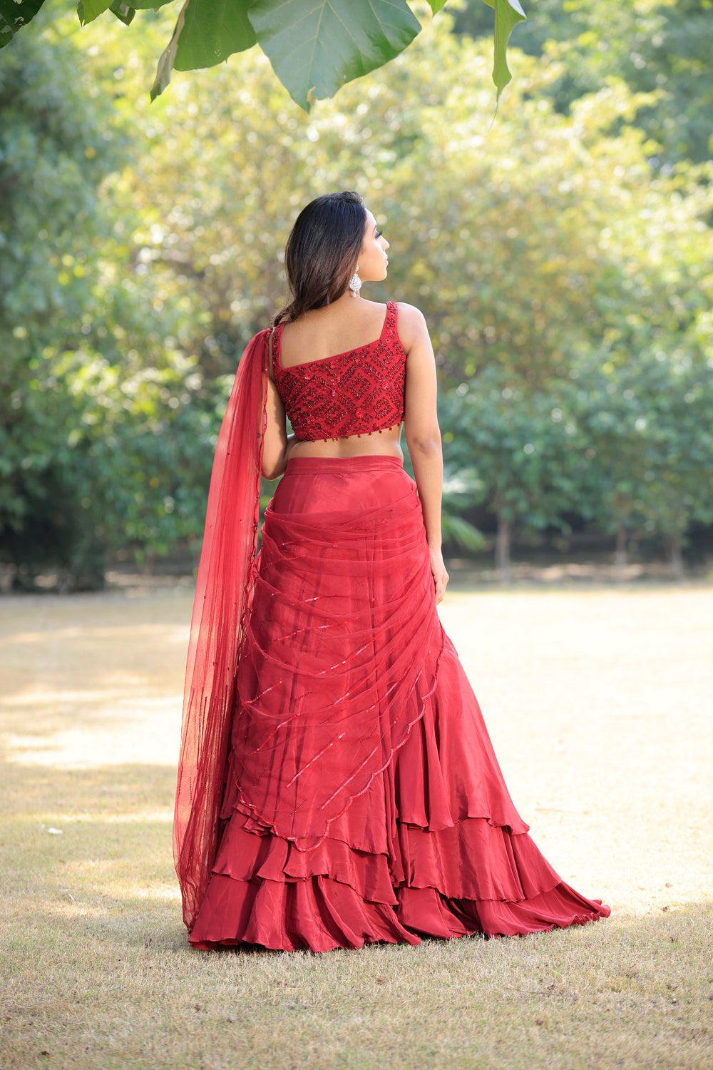 Ruby Red Embellished Lehenga With Drape Dupatta And Blouse Set