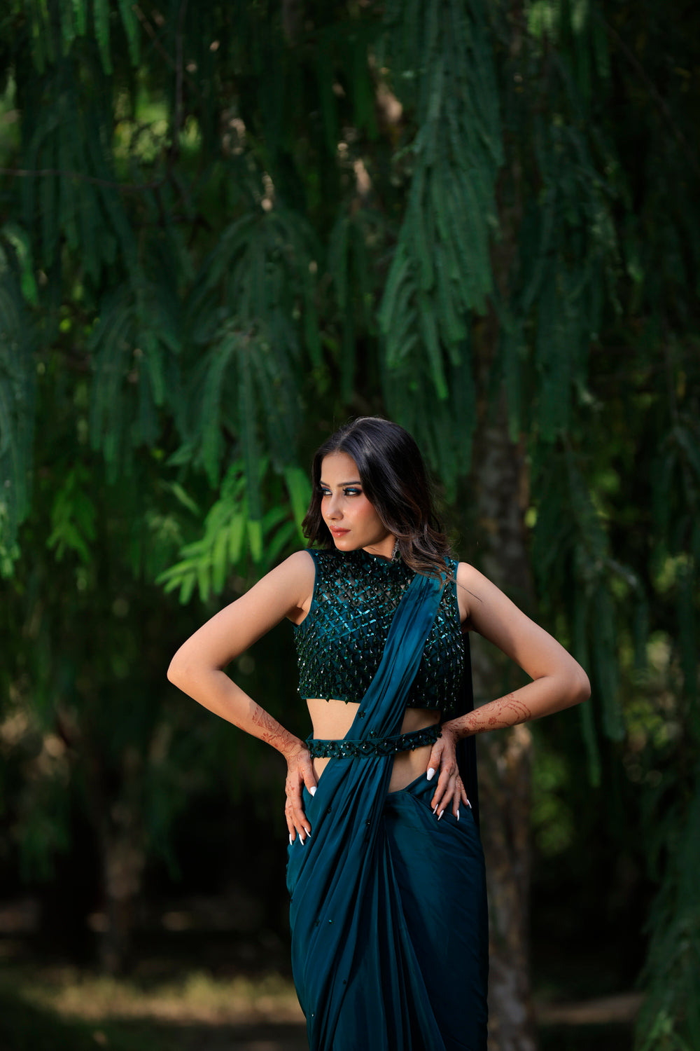 Peacock green crystal drape saree embellished with crystal, sequin and moti work comes in viscose crepe, net & shatoon lining.