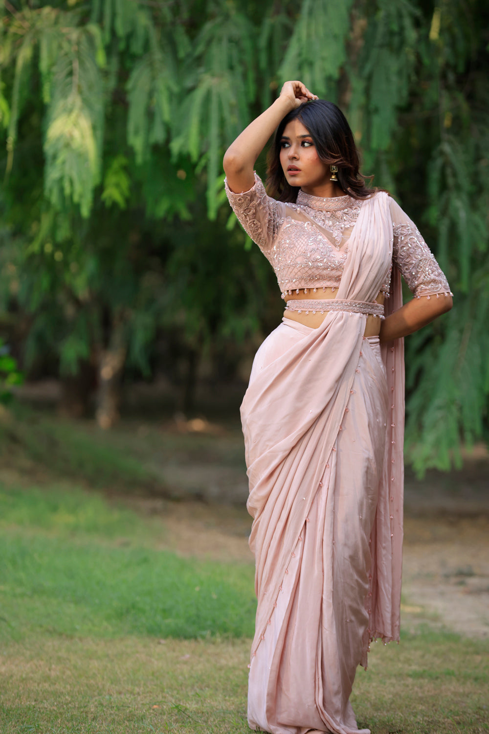 Rose pink drape cut dana saree embellished with reshamdan cutdana sequin & moti work comes with viscose crepe, net & shantoon lining