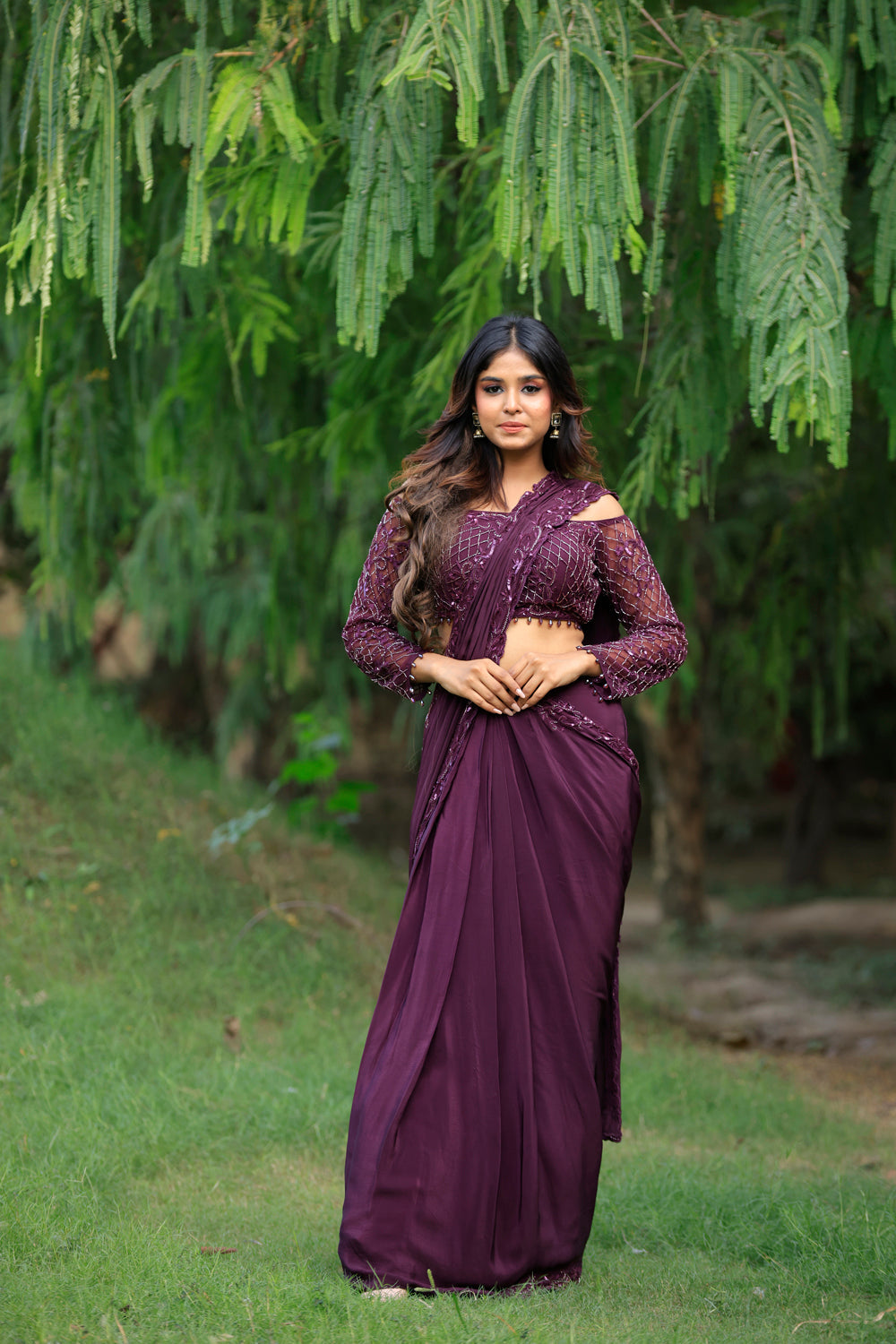 Wine drape saree embellished with katdana work in viscose crepe and shatoon lining.