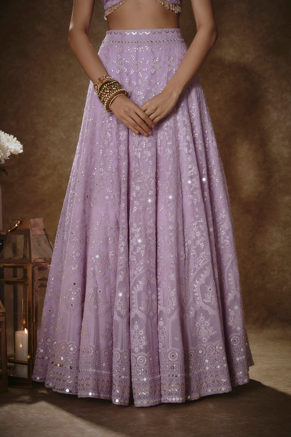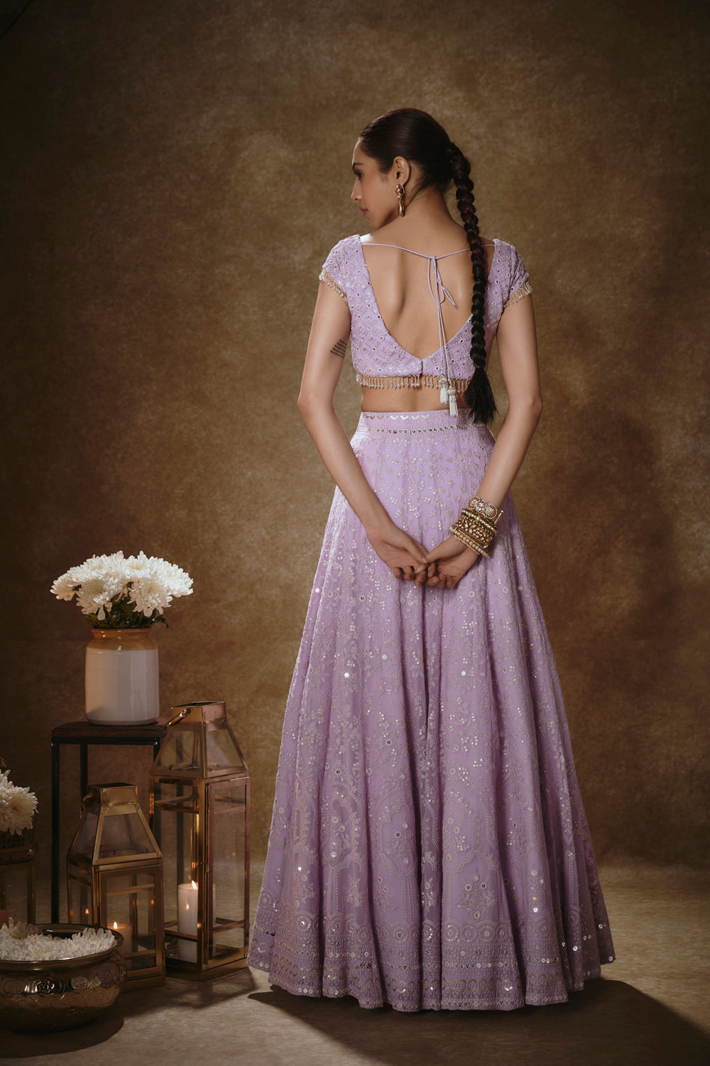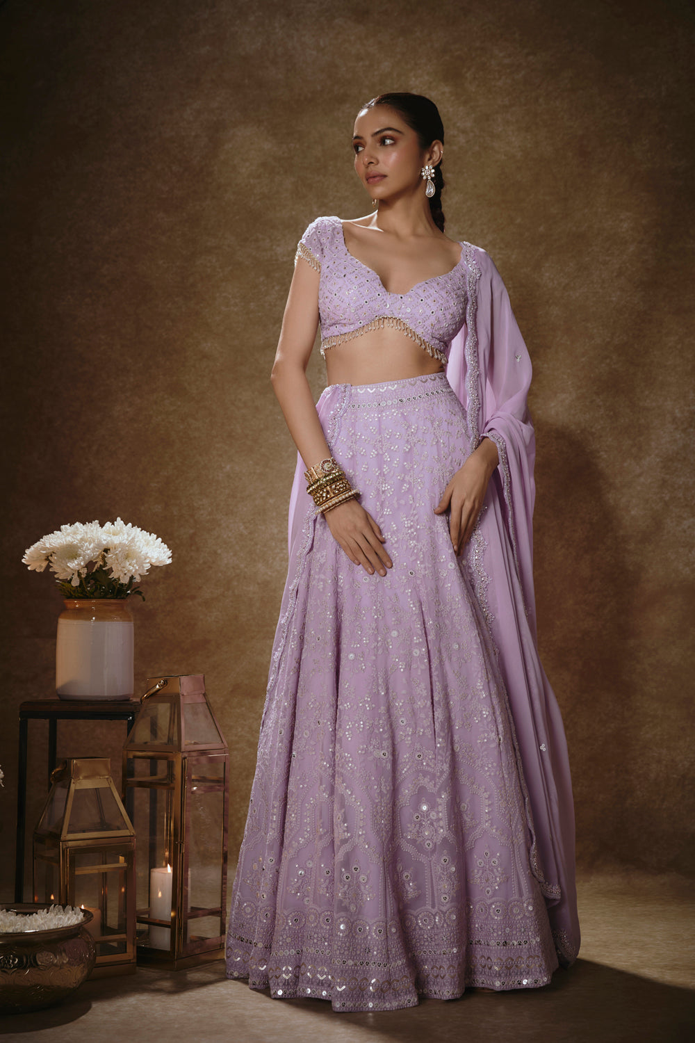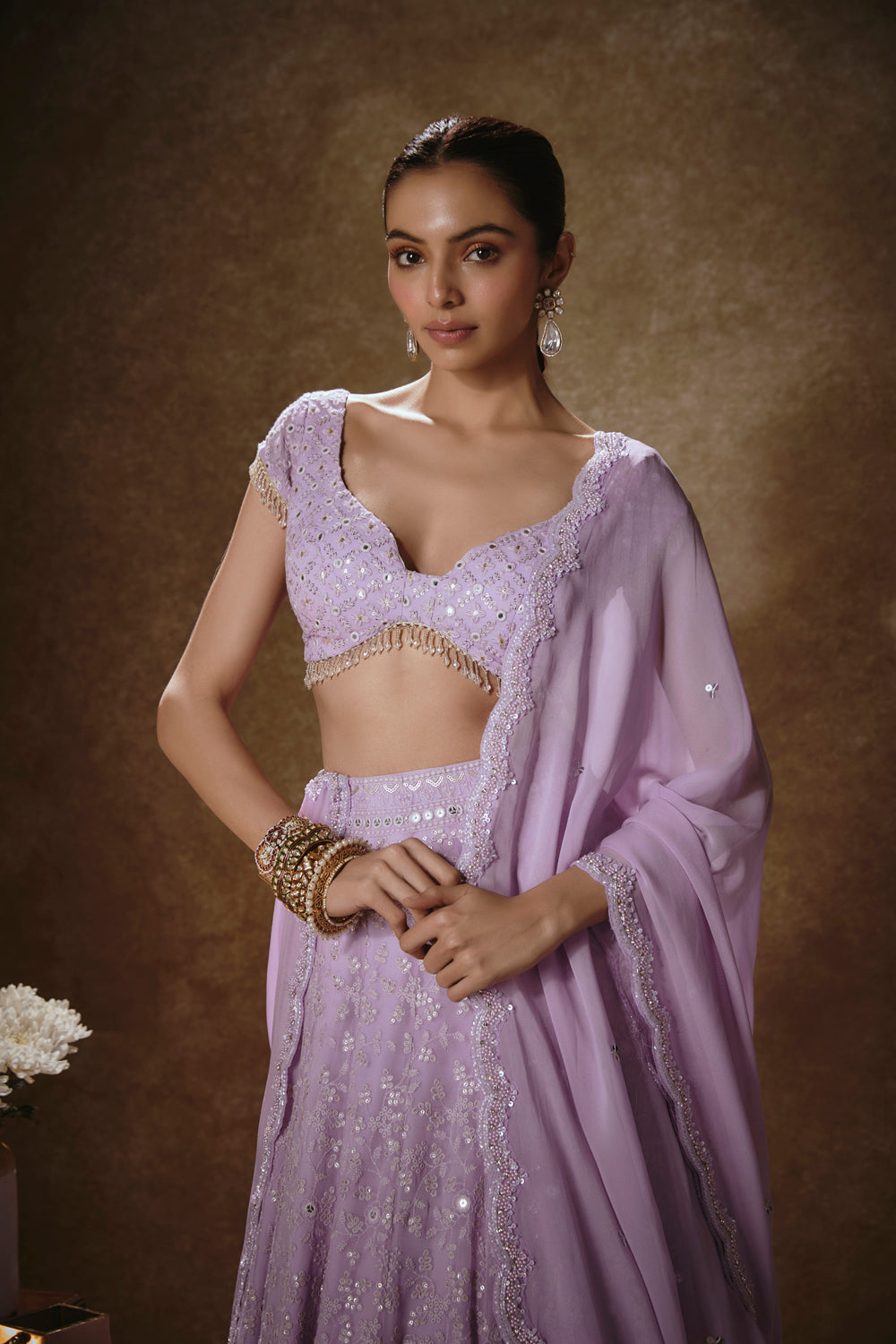This look features a lilac lehenga set. the floral lehenga is intricately embellished with thread and sequins all over. it is teamed with a matching, short sleeved blouse tied at front in a bow and cutdana tassels at hem. a georgette dupatta with scallop cutdana border and sequin buttis complete the look. cancan & pockets are included.