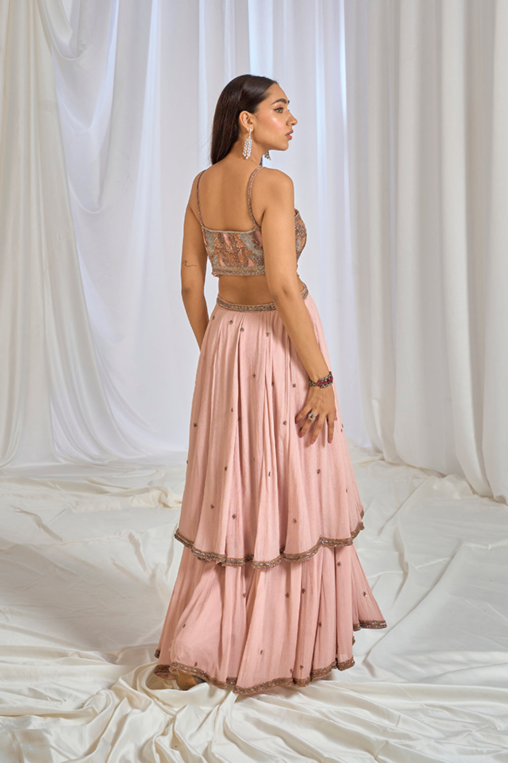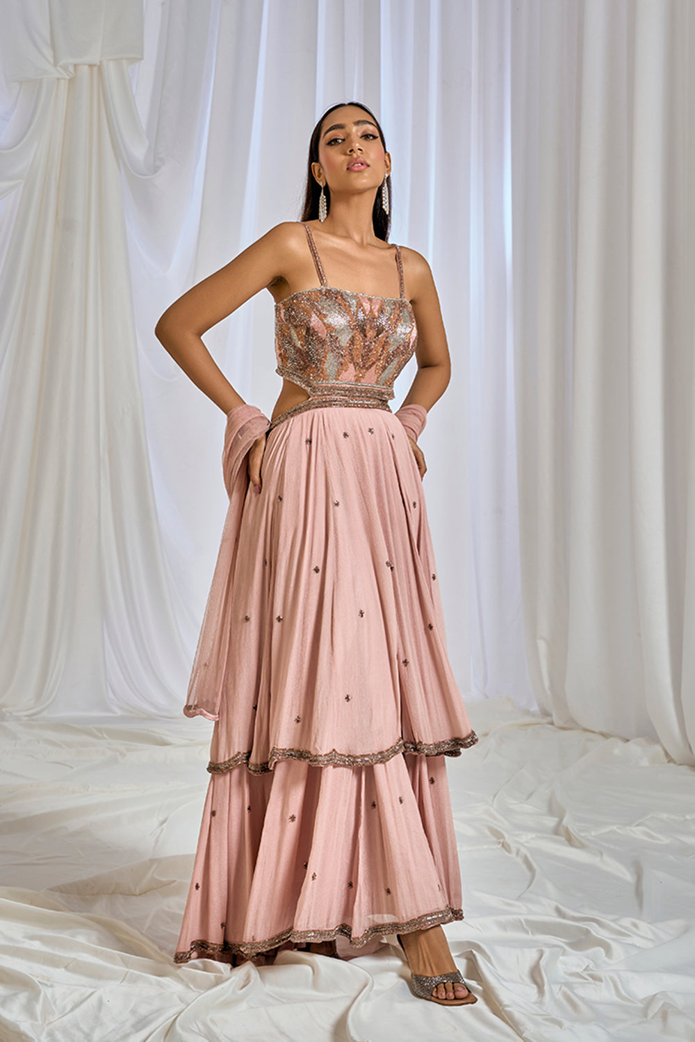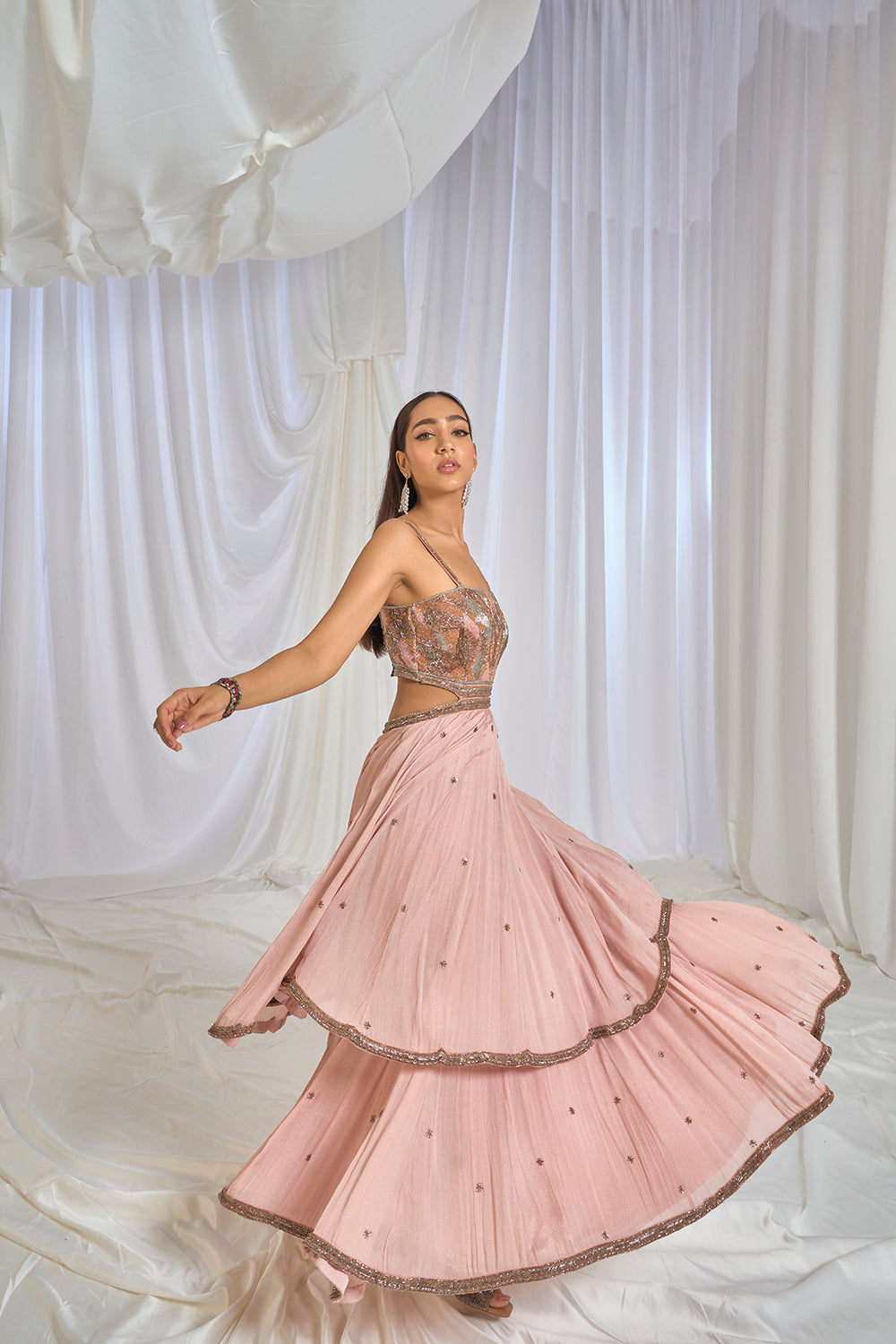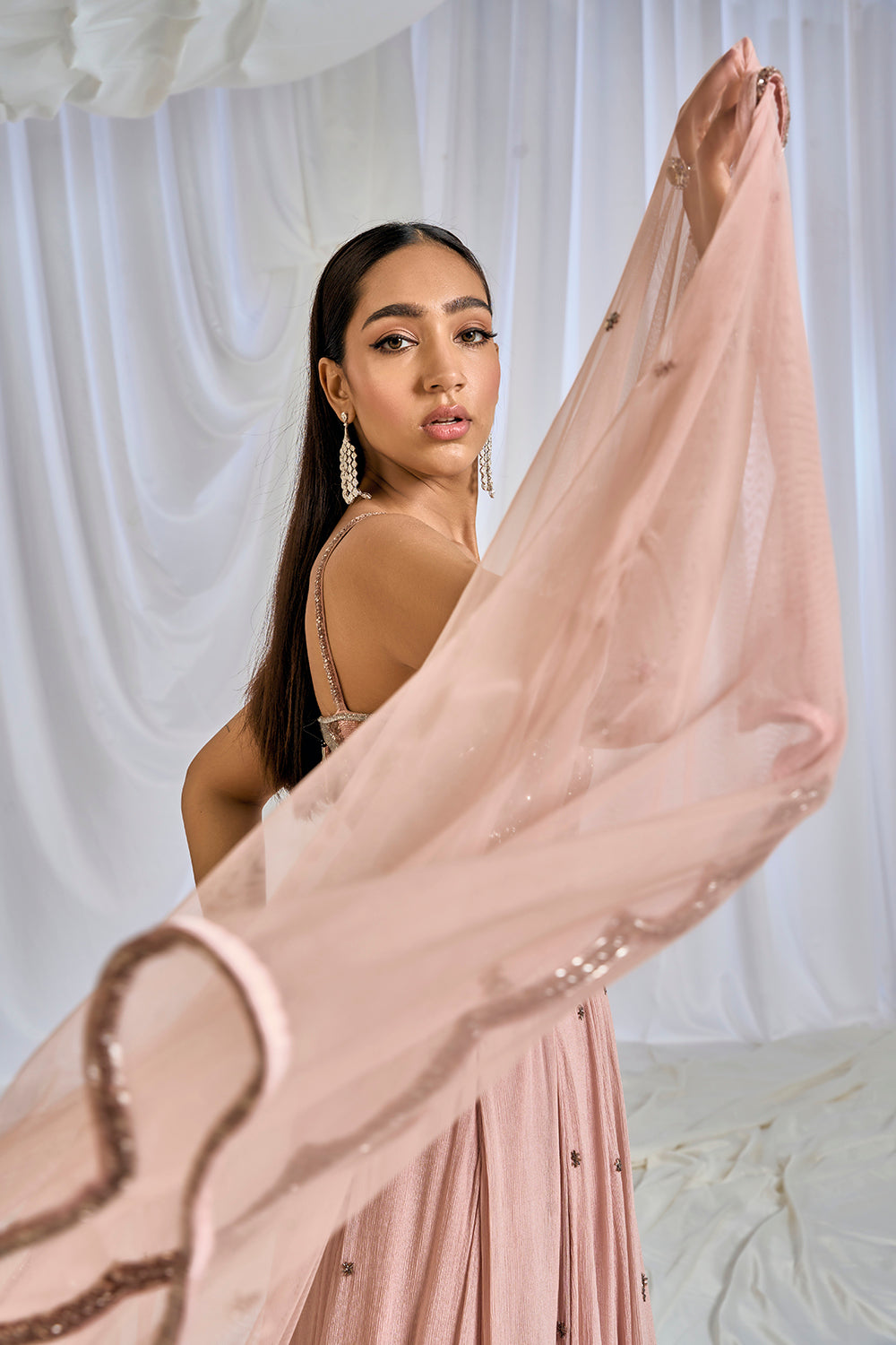 A beautiful composition of hand embroidery in pale pink, ensemble featuring stunning hand-embroideries and delicate details is what sums up the gatsby dress.