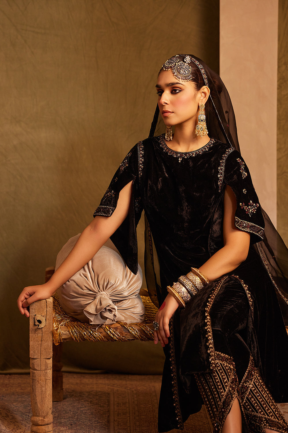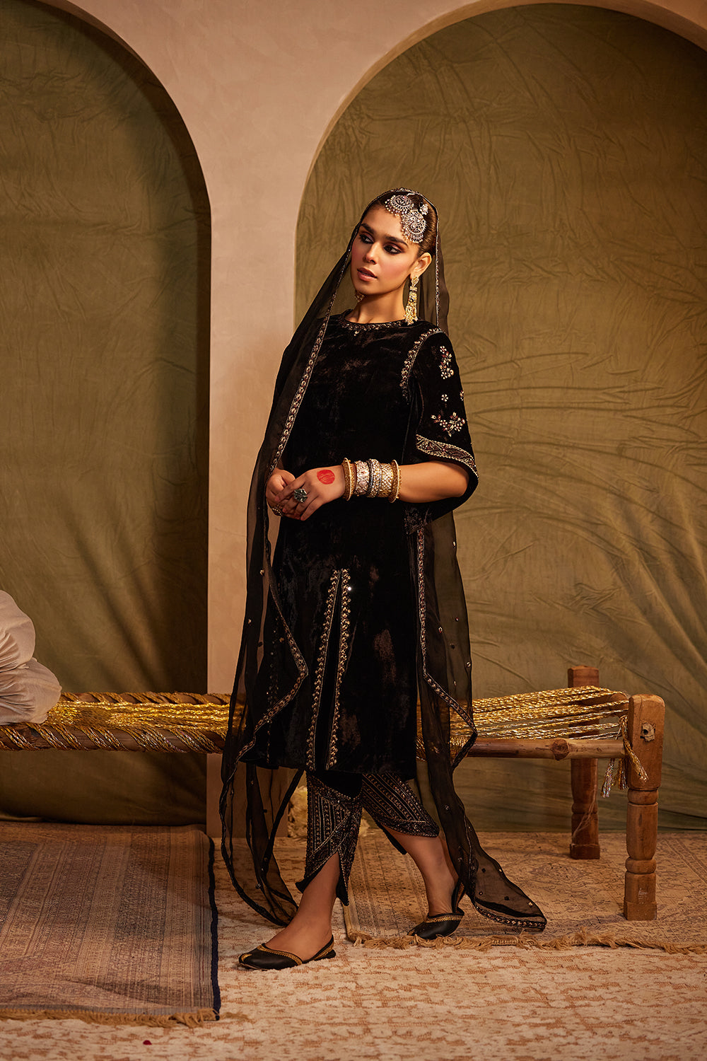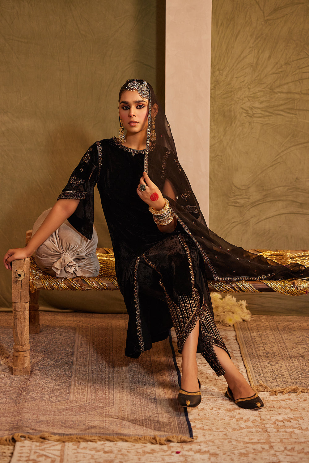 Featuring midnight black long front slit hand embellished kurta in silk velvet with ankle length pants in polysilk paired with organza dupatta.
