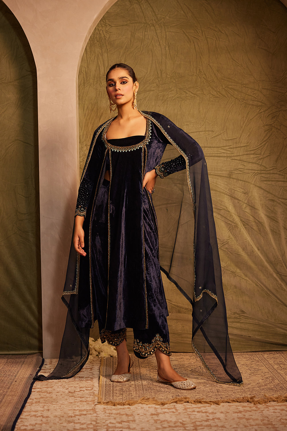 Featuring midnight blue side high slit kurta with hand embellished sequin, moti, katdana, mirror & resham work comes with bustier palazzo in silk velvet and organza dupatta.