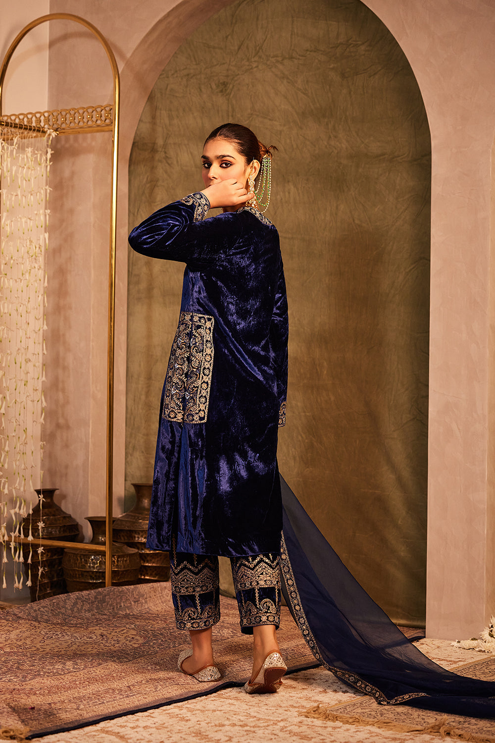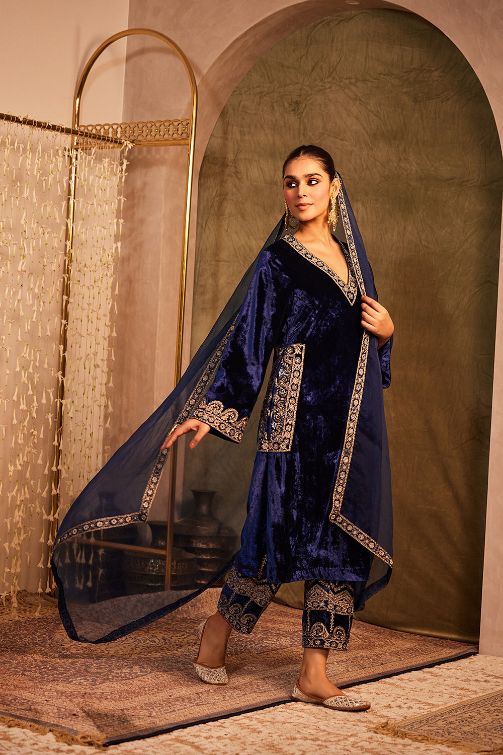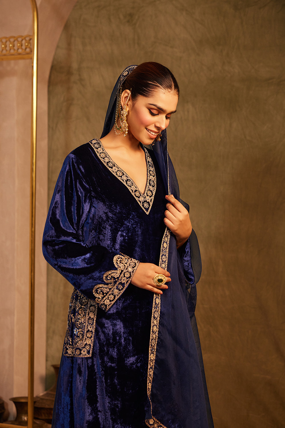Midnight Blue Silk Velvet Kurta With Palazzo & Dupatta
